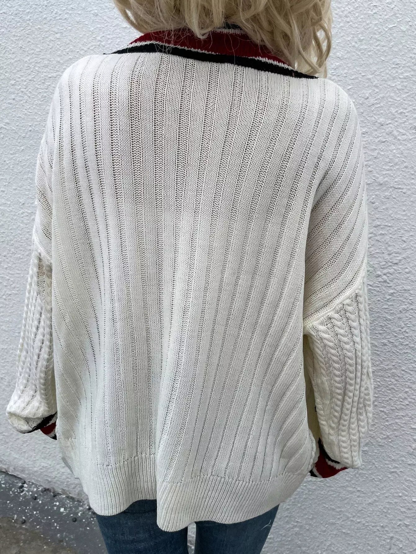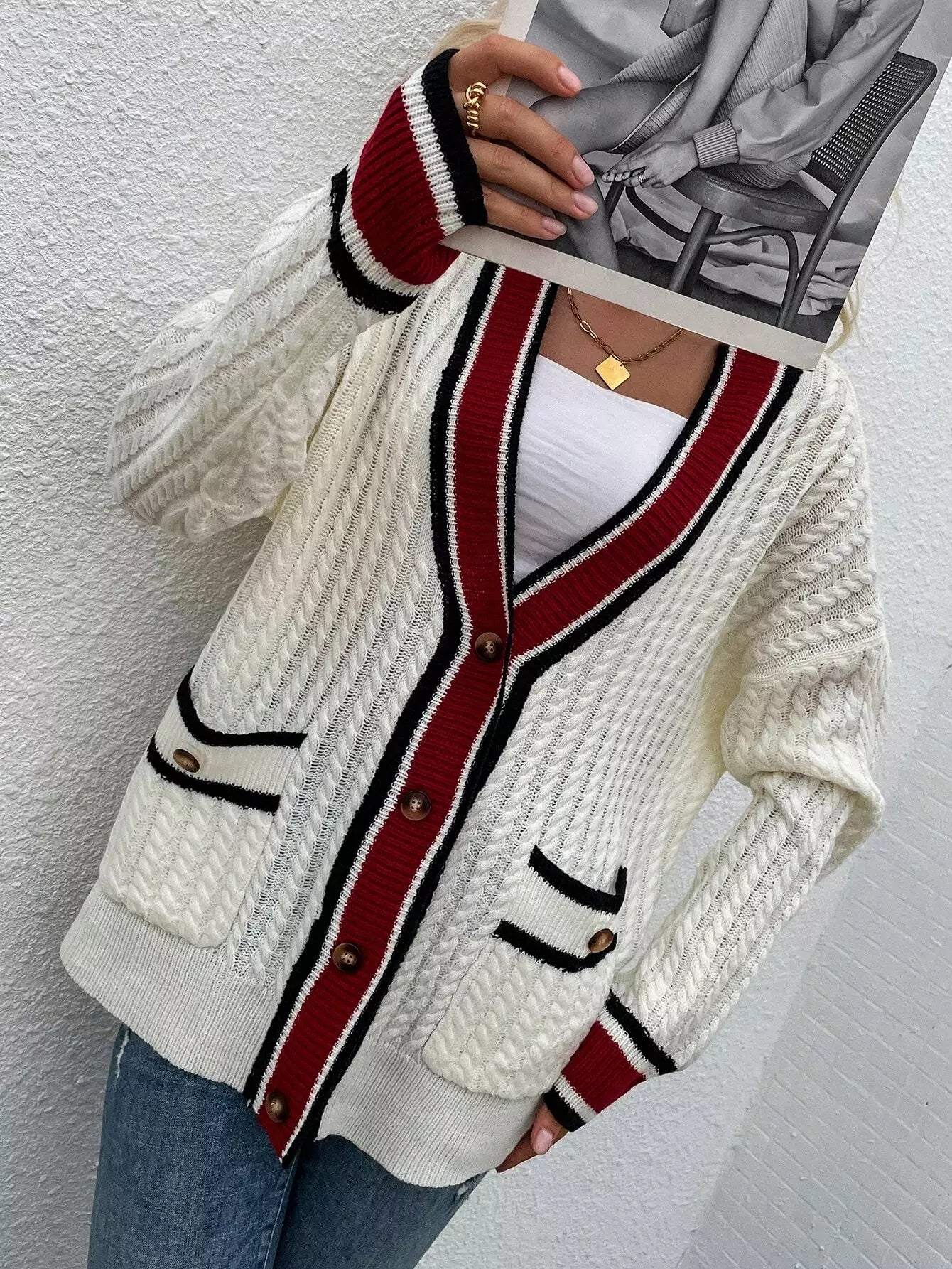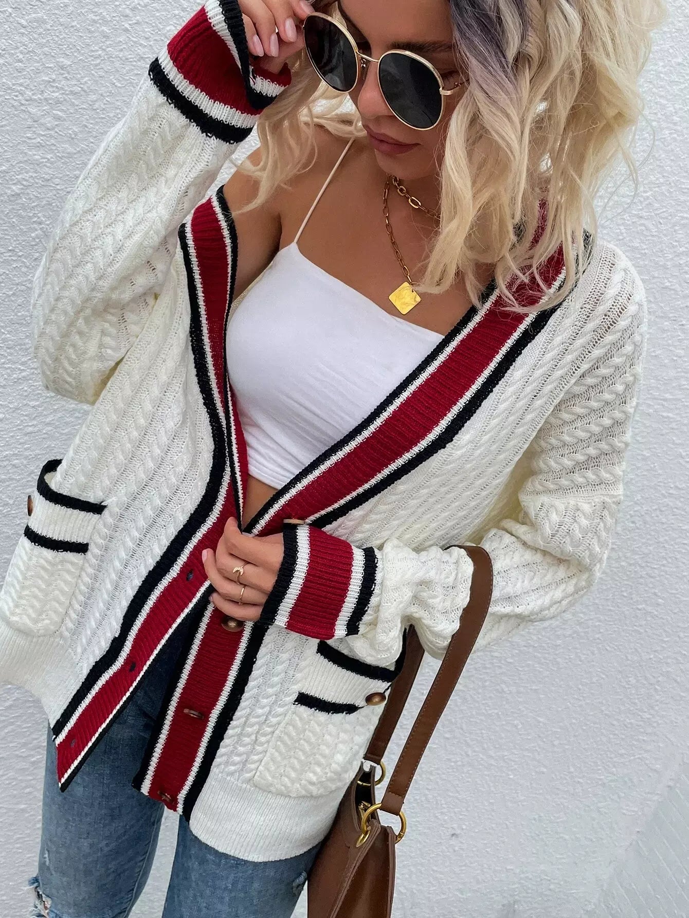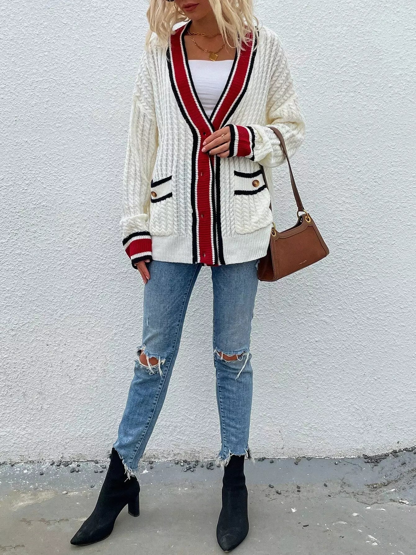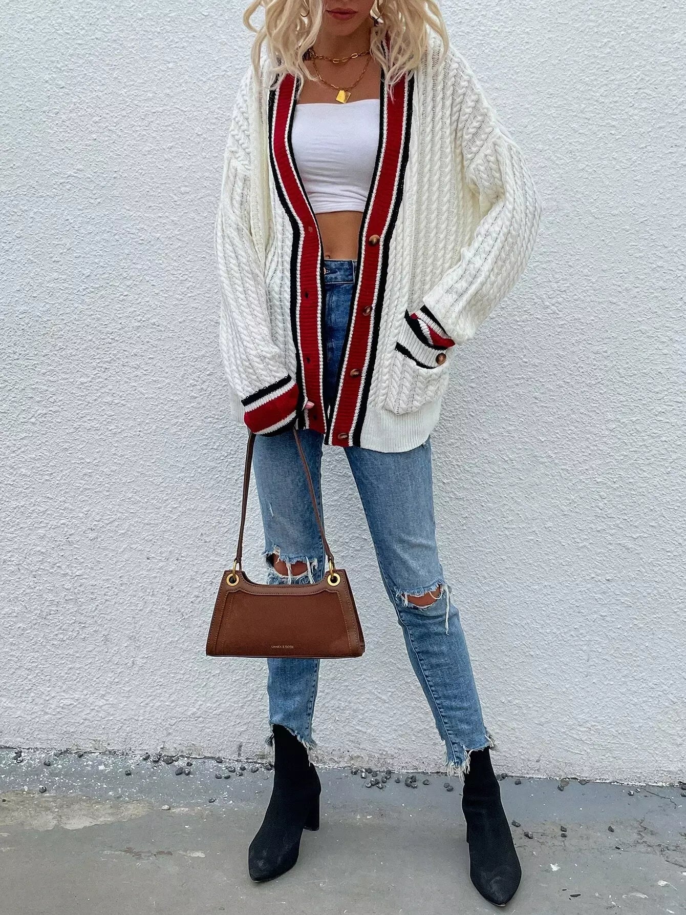 كارديغان بحواف مخططة بحواف مخططة ومحبوكة بكابل