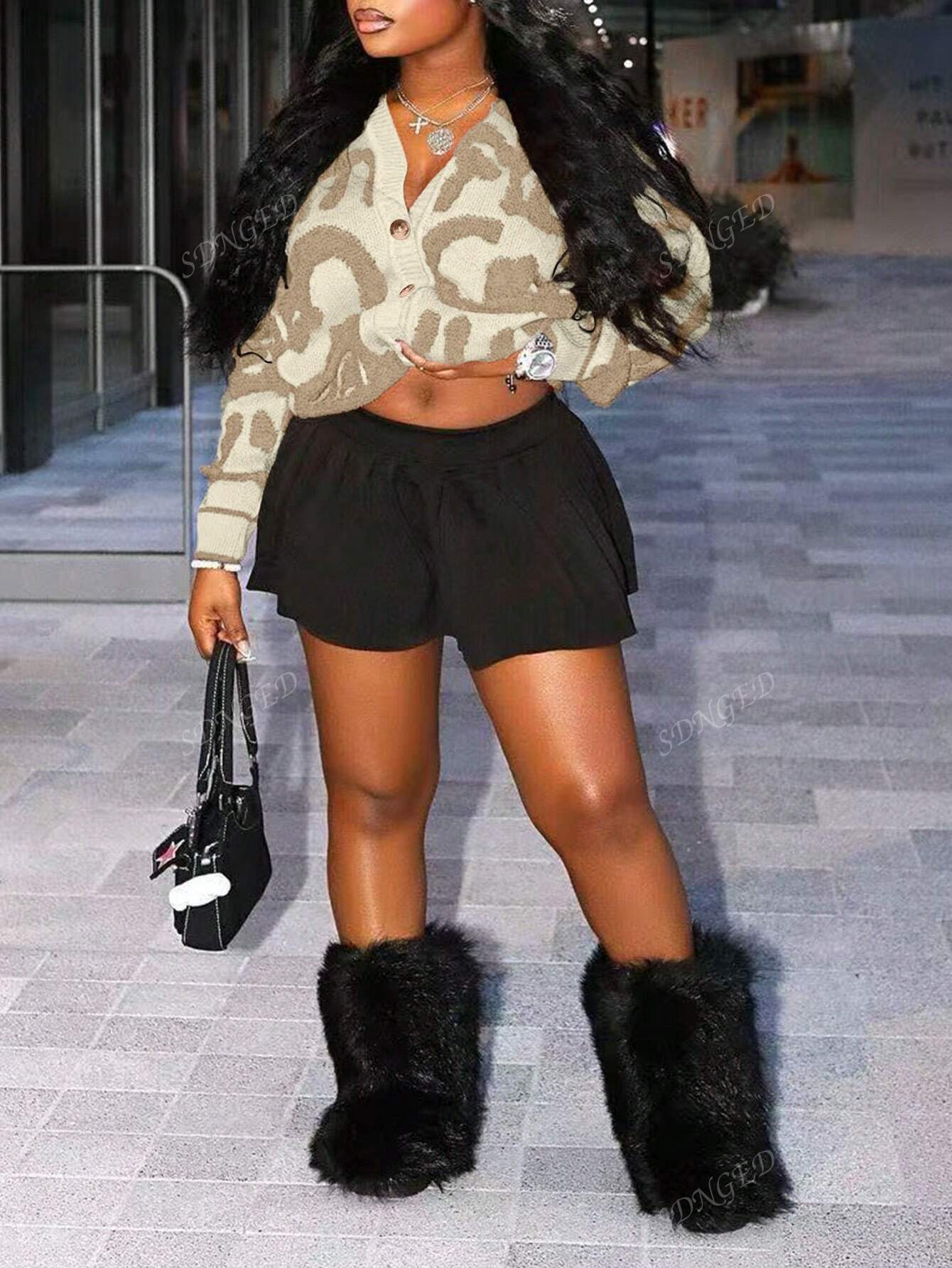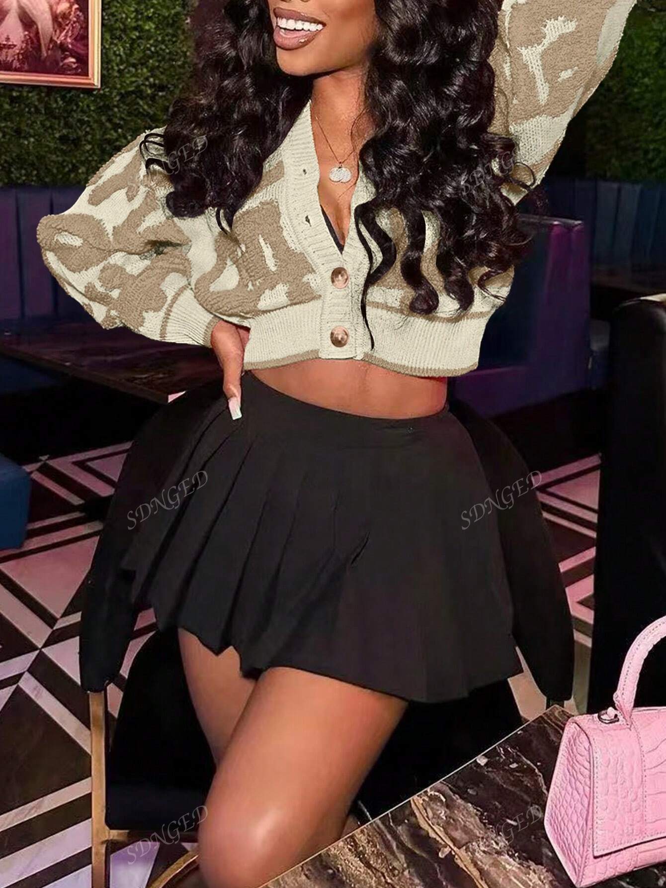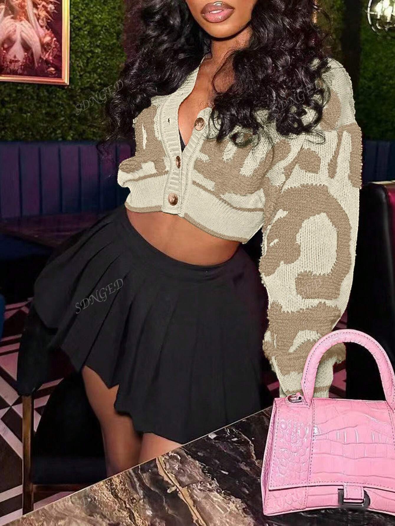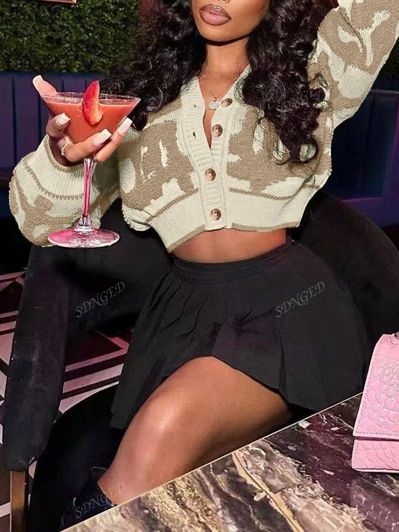 Sweet All-Over Two-Tone Printed Front Button Casual Versatile Long Sleeve Cardigan Sweater