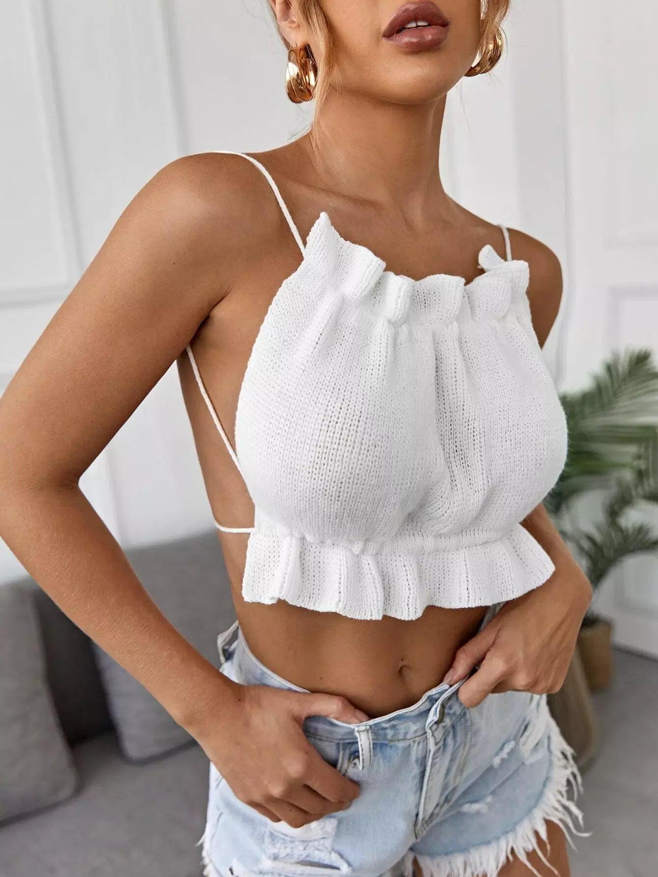 بلوزة كاميه محبوكة بدون ظهر وربطة عنق من الخلف