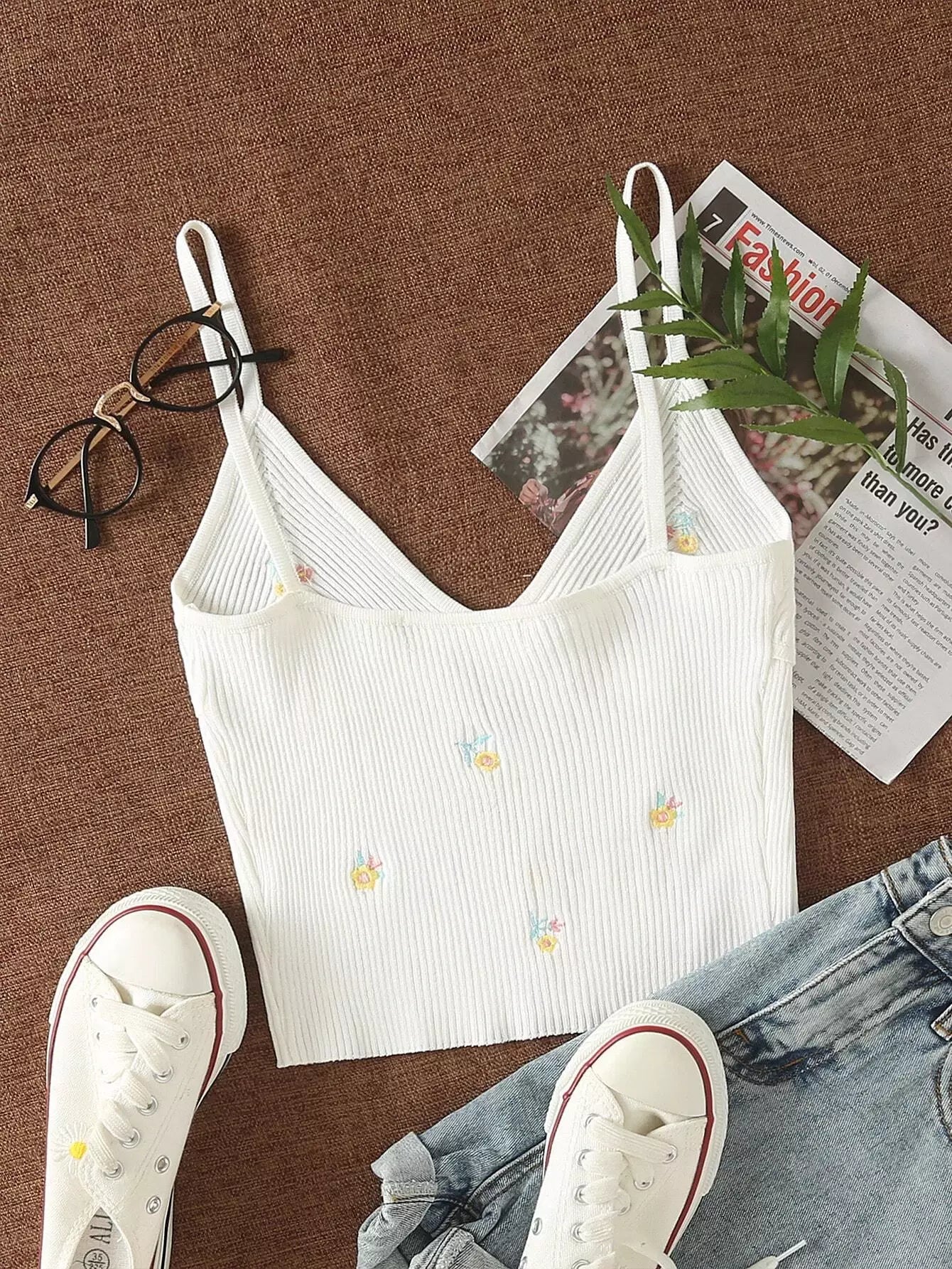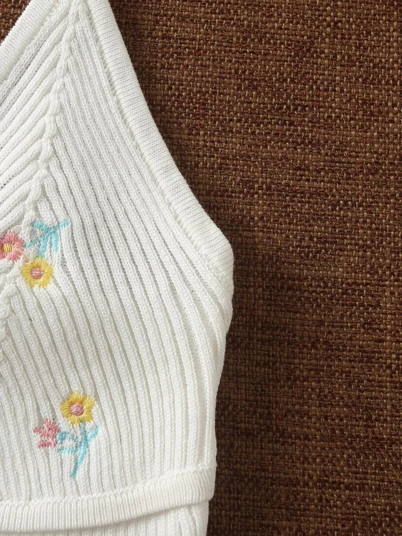 قميص قصير محبوك بنقشة زهرية مزركشة على شكل ضلع
