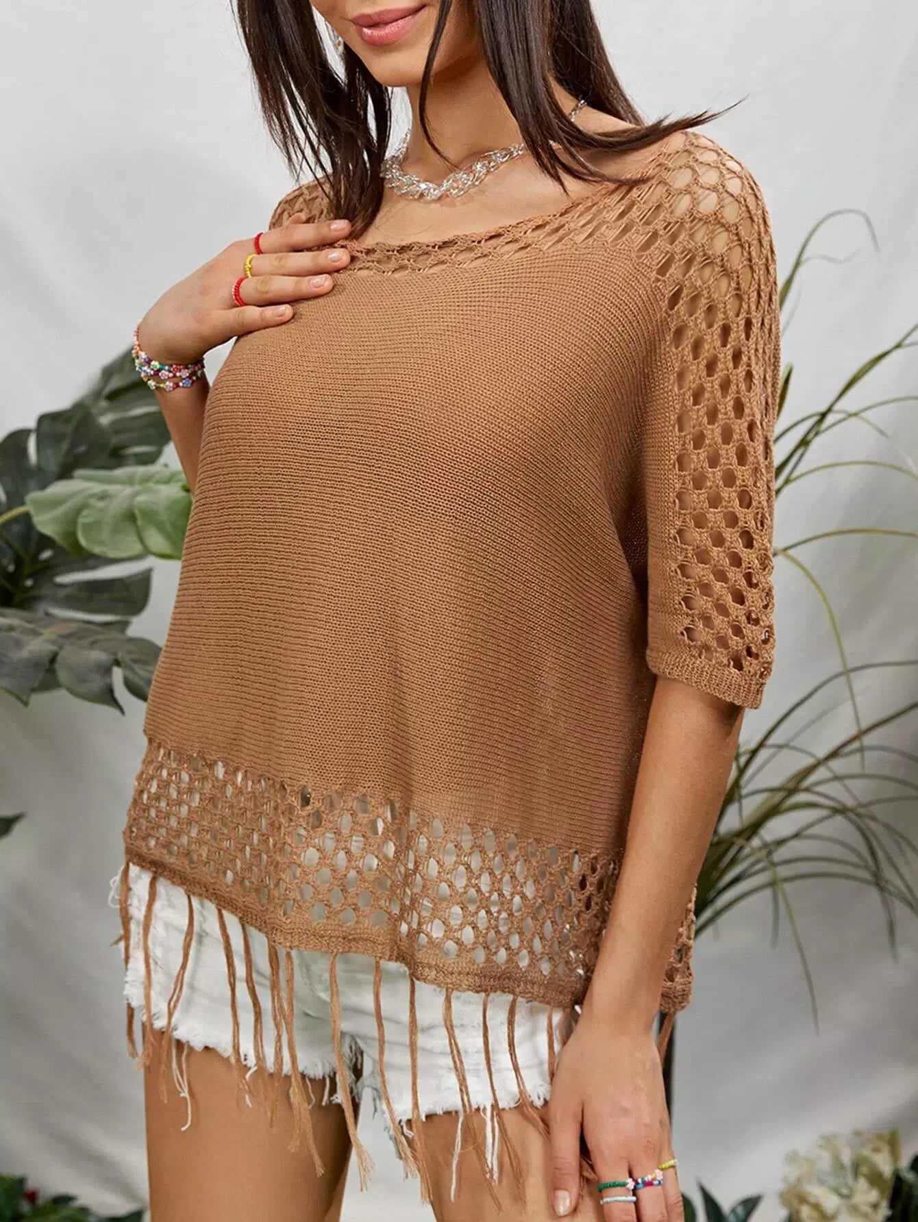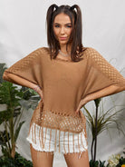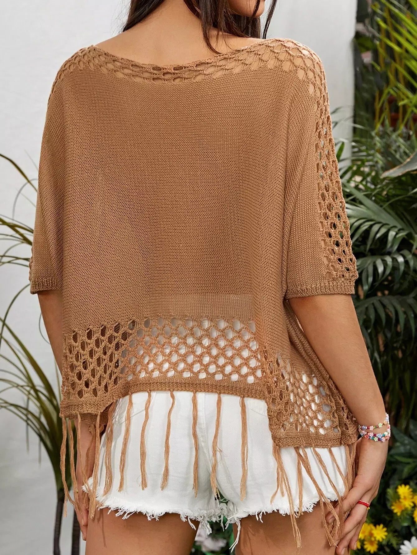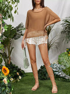 بلوزة محبوكة مفتوحة من دون أهداب ذات تفاصيل سادة