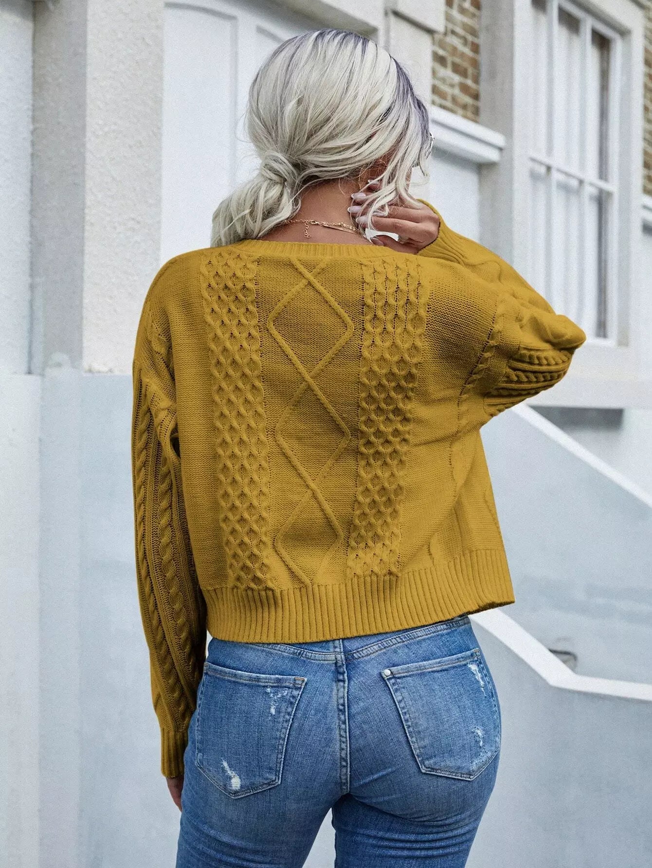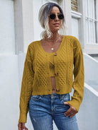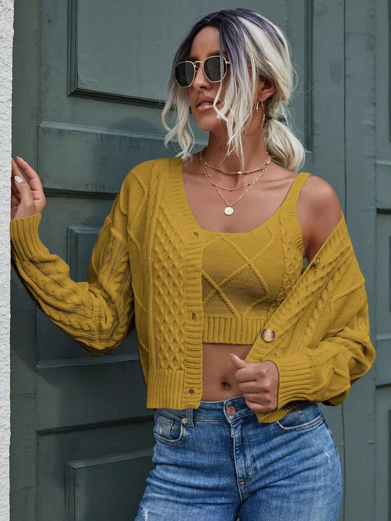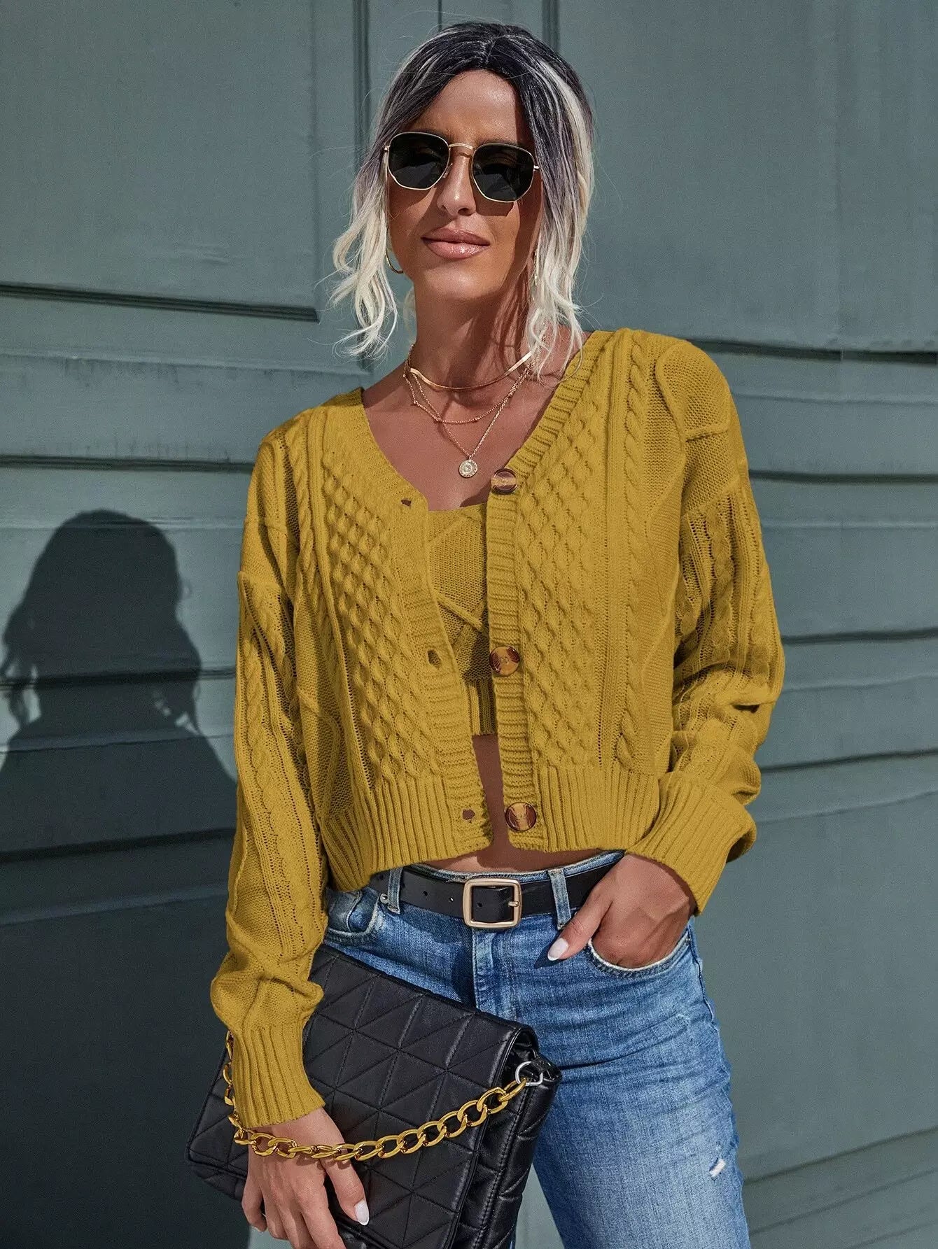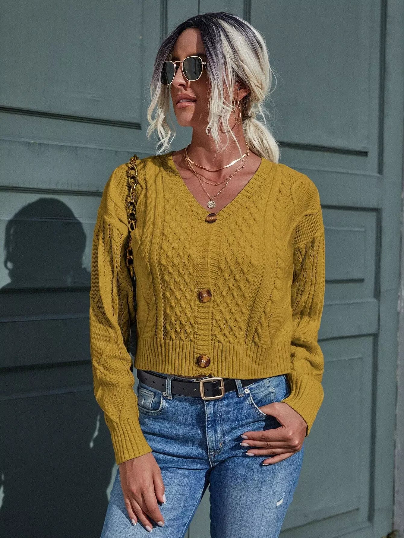 بلوزة قصيرة محبوكة بكابل محبوكة وكارديجان بأزرار أمامية منسدلة على الكتف