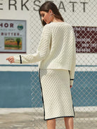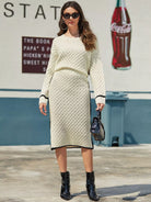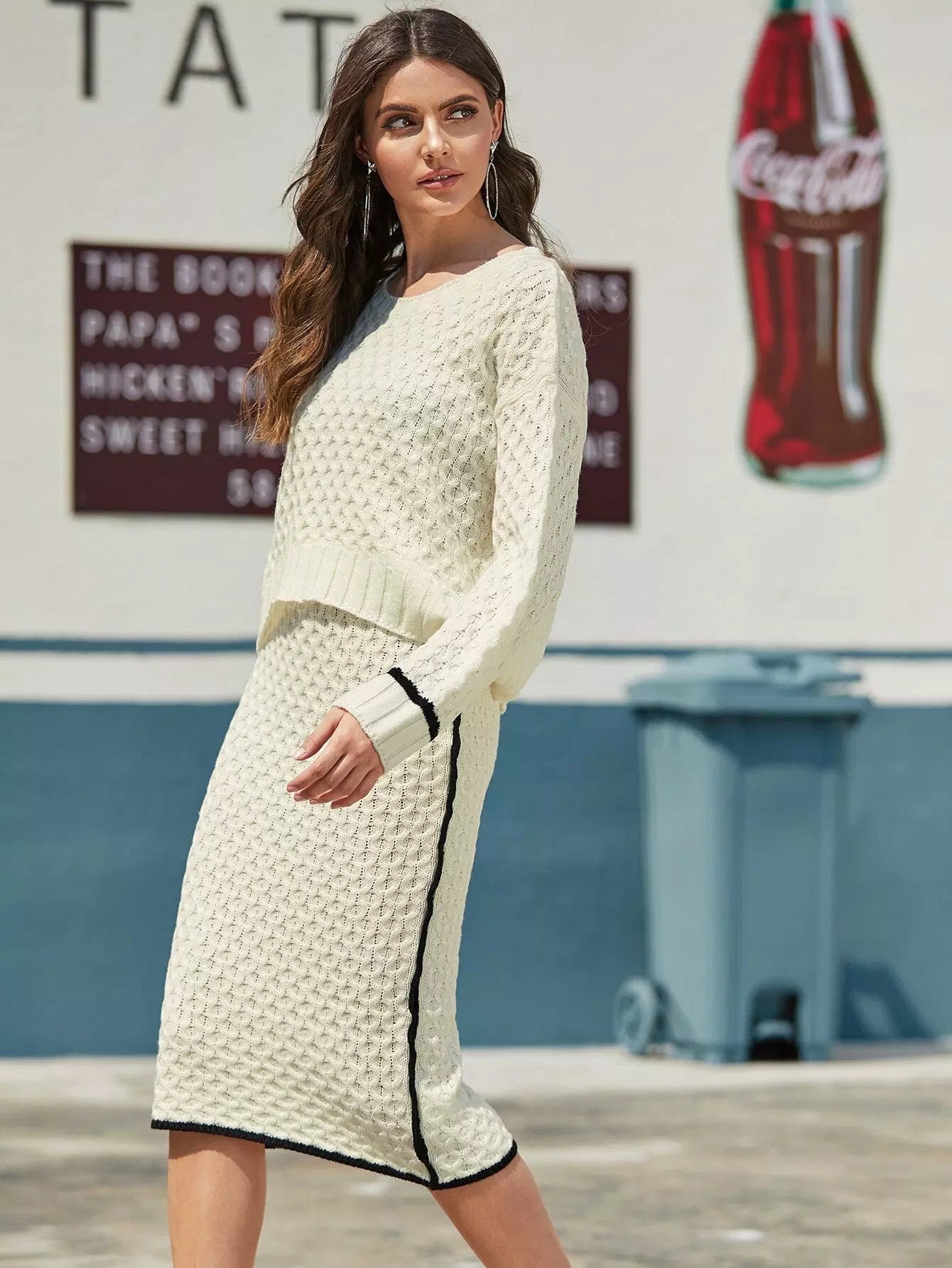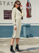 طقم كنزة محبوكة بكابل محبوكة وتنورة مزينة بأنابيب بلون مغاير