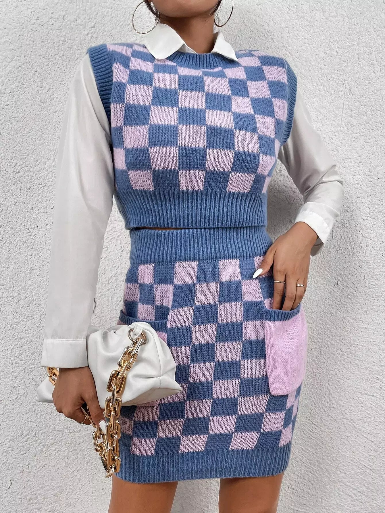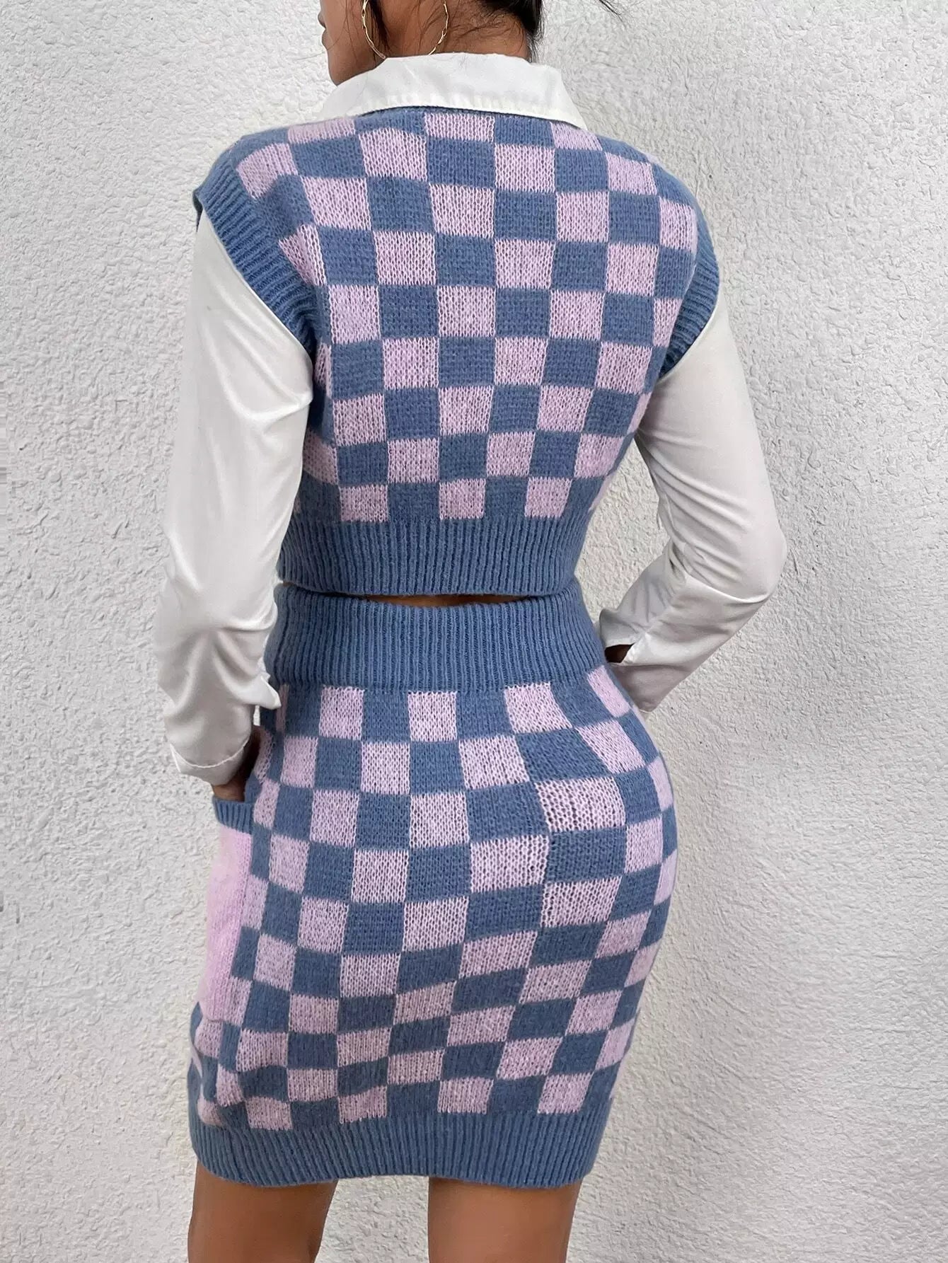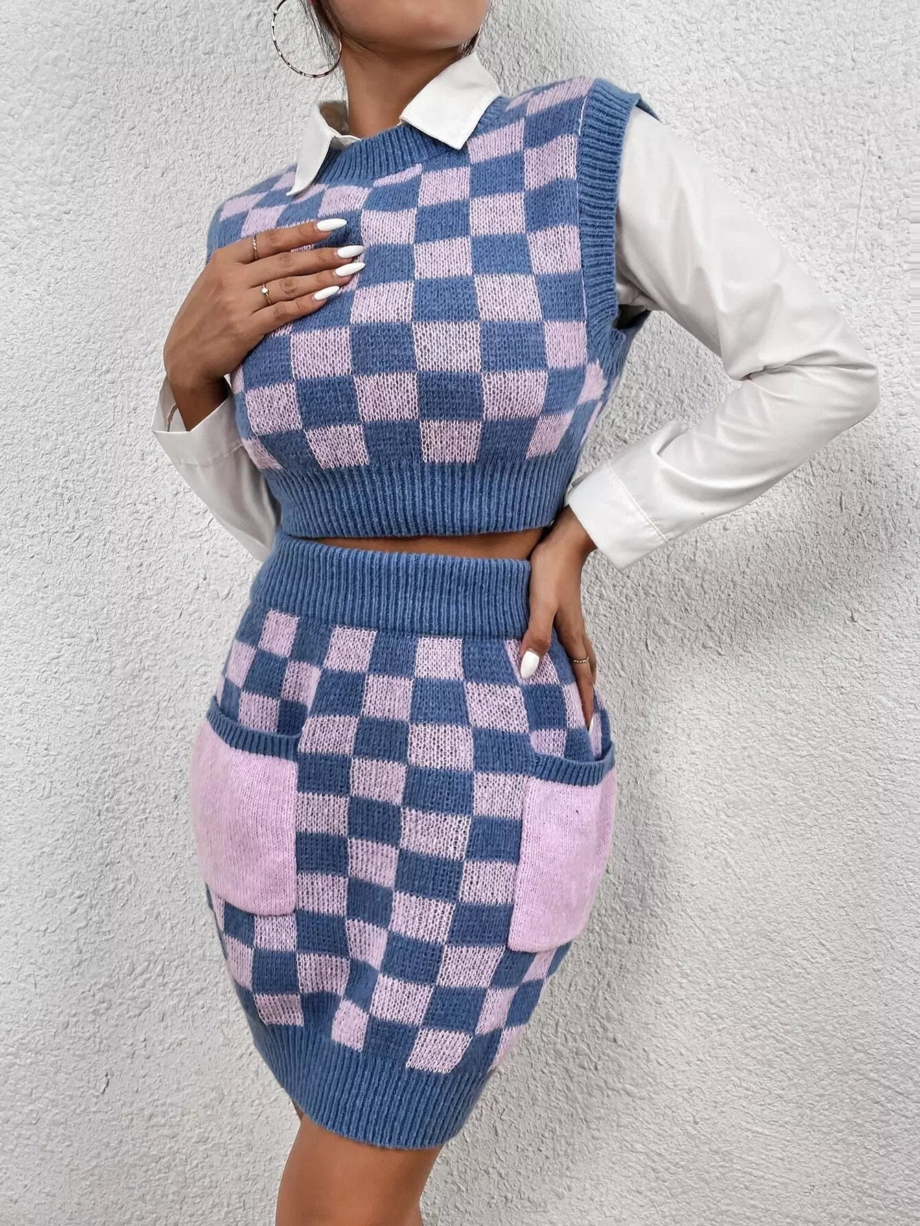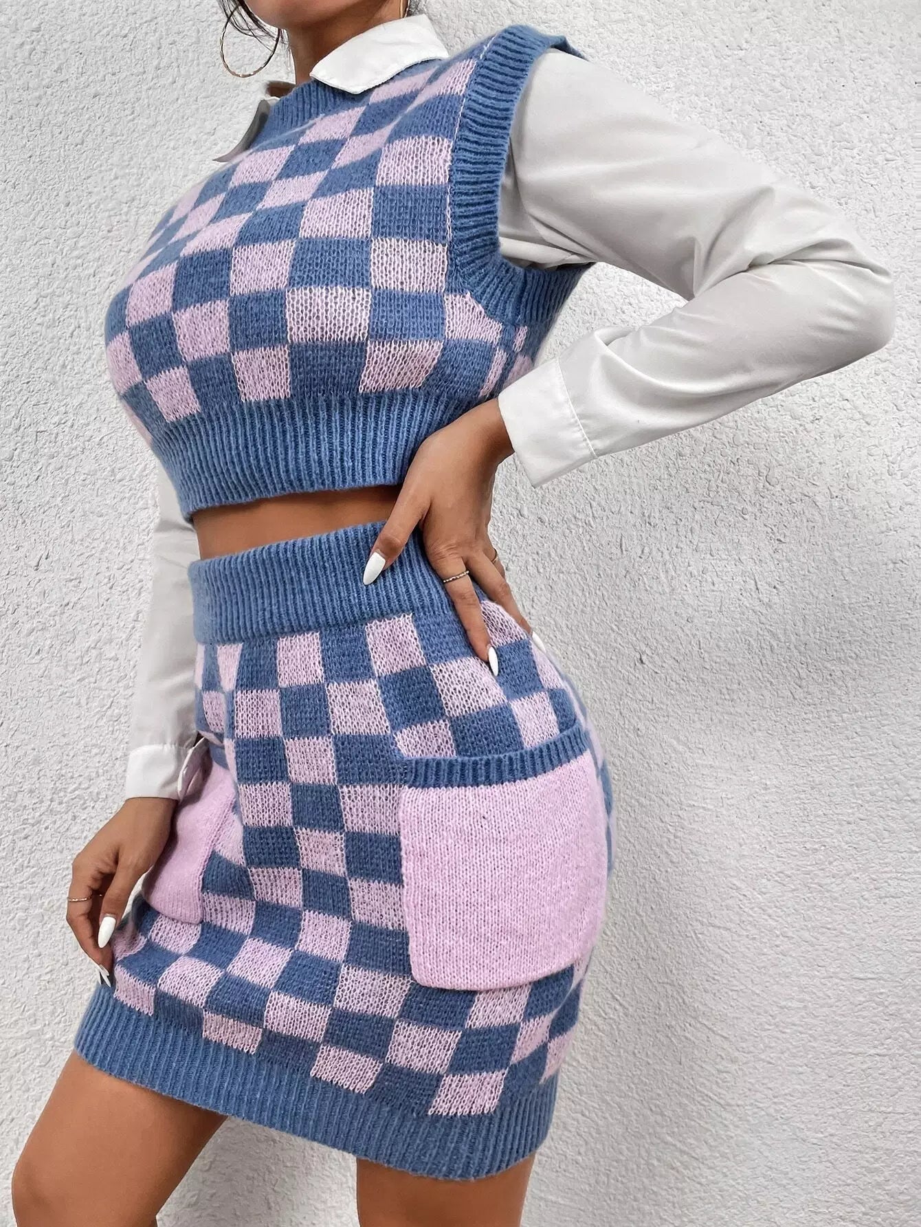 طقم كنزة وسترة وتنورة منقوشة بنقوش