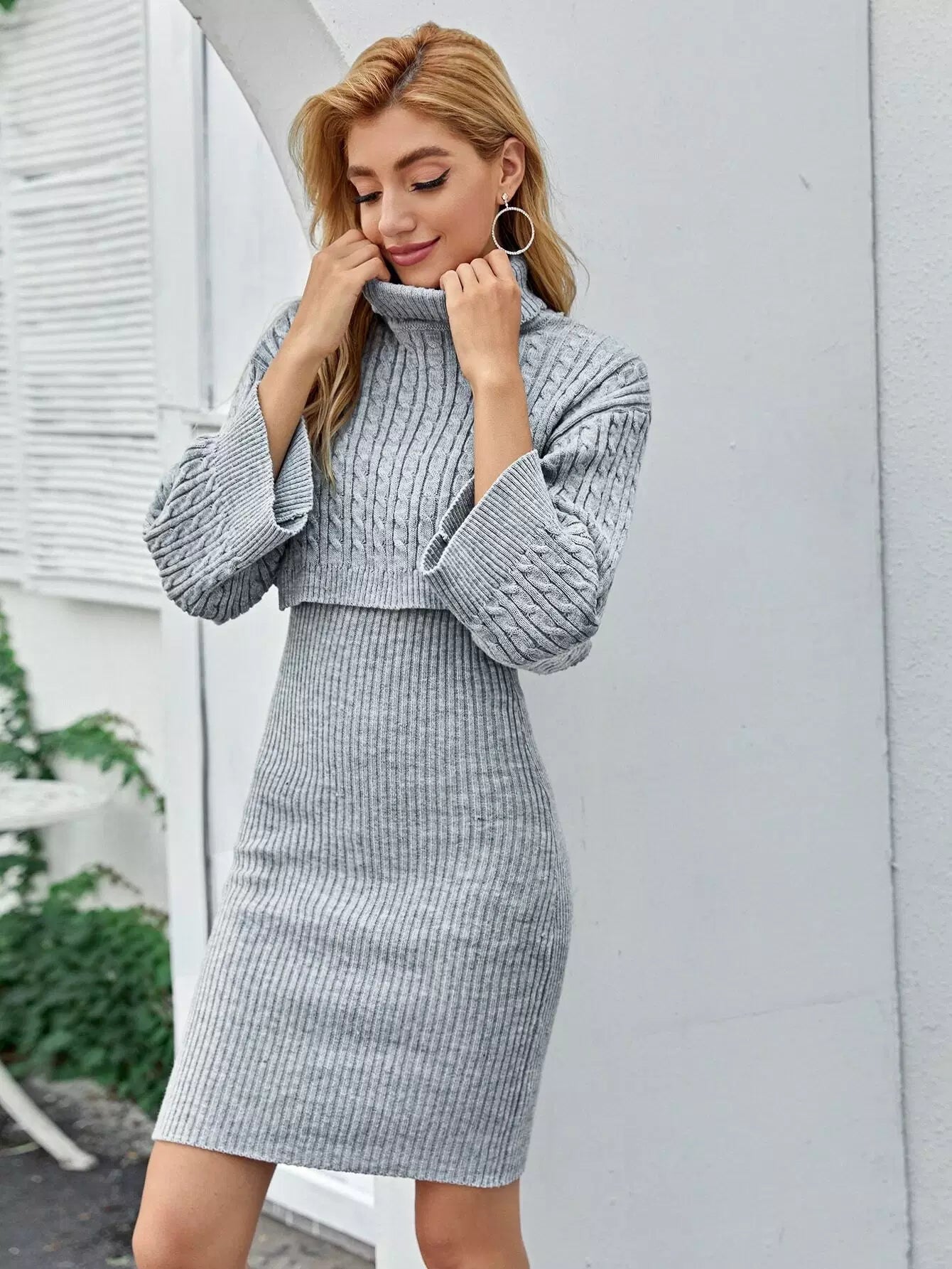 فستان سادة محبوك مضلّع محبوك مع كنزة صوفية