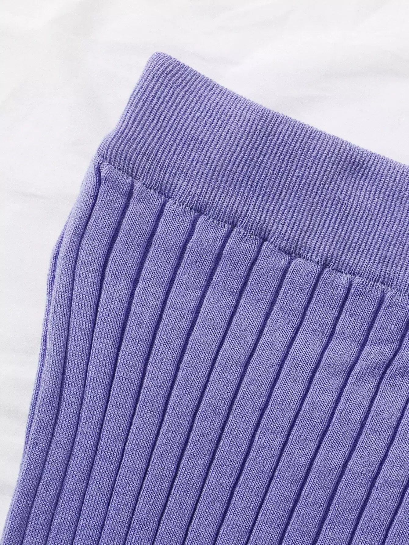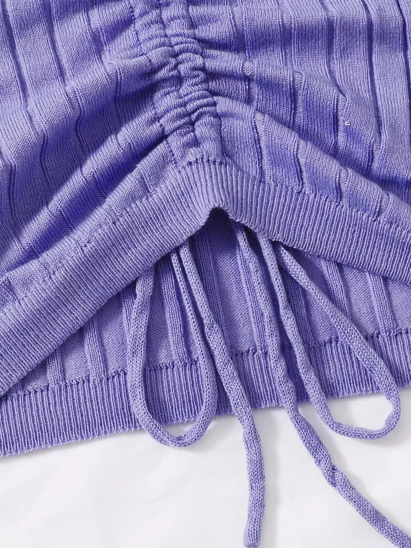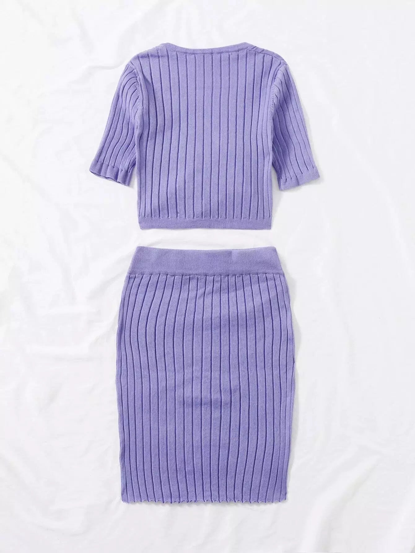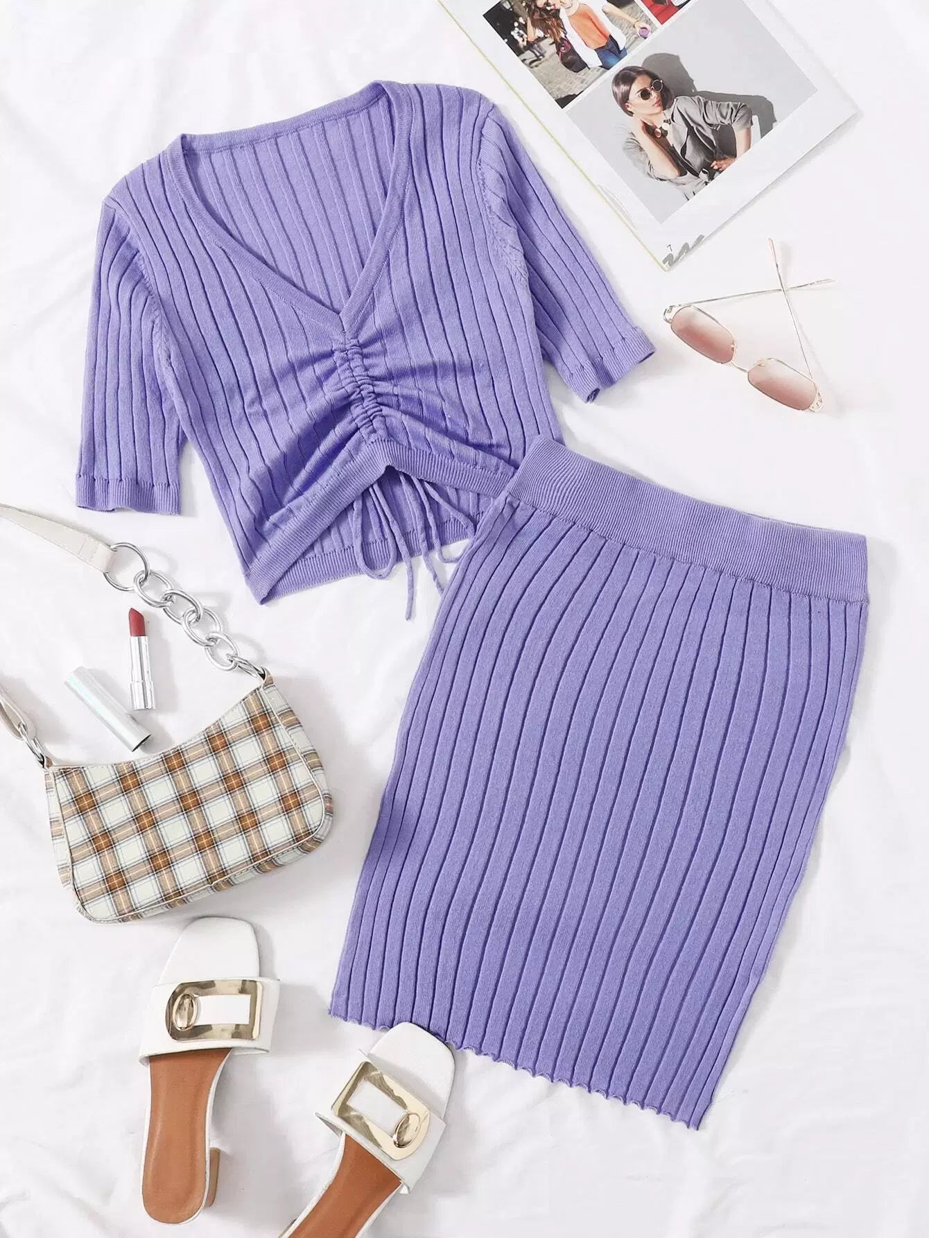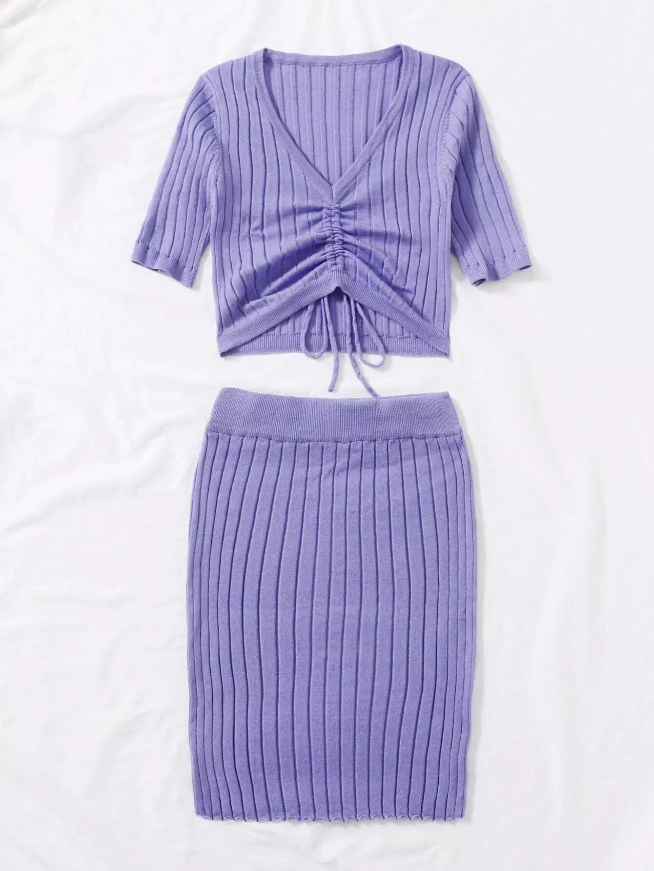 طقم بلوزة وتنورة محبوكة بعقدة مكشكشة مضلعة