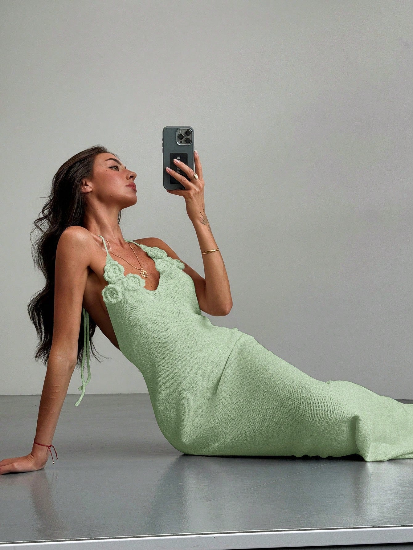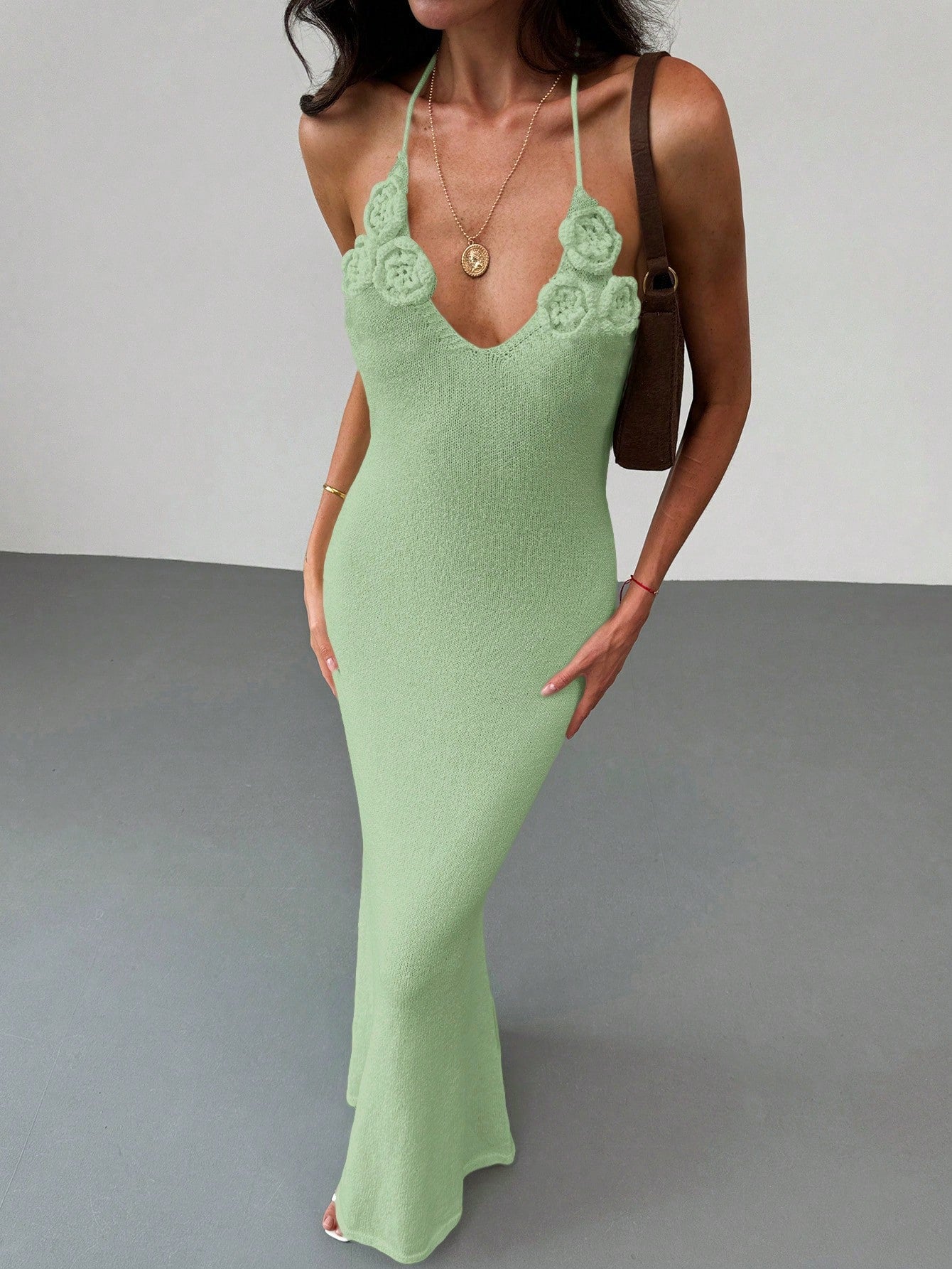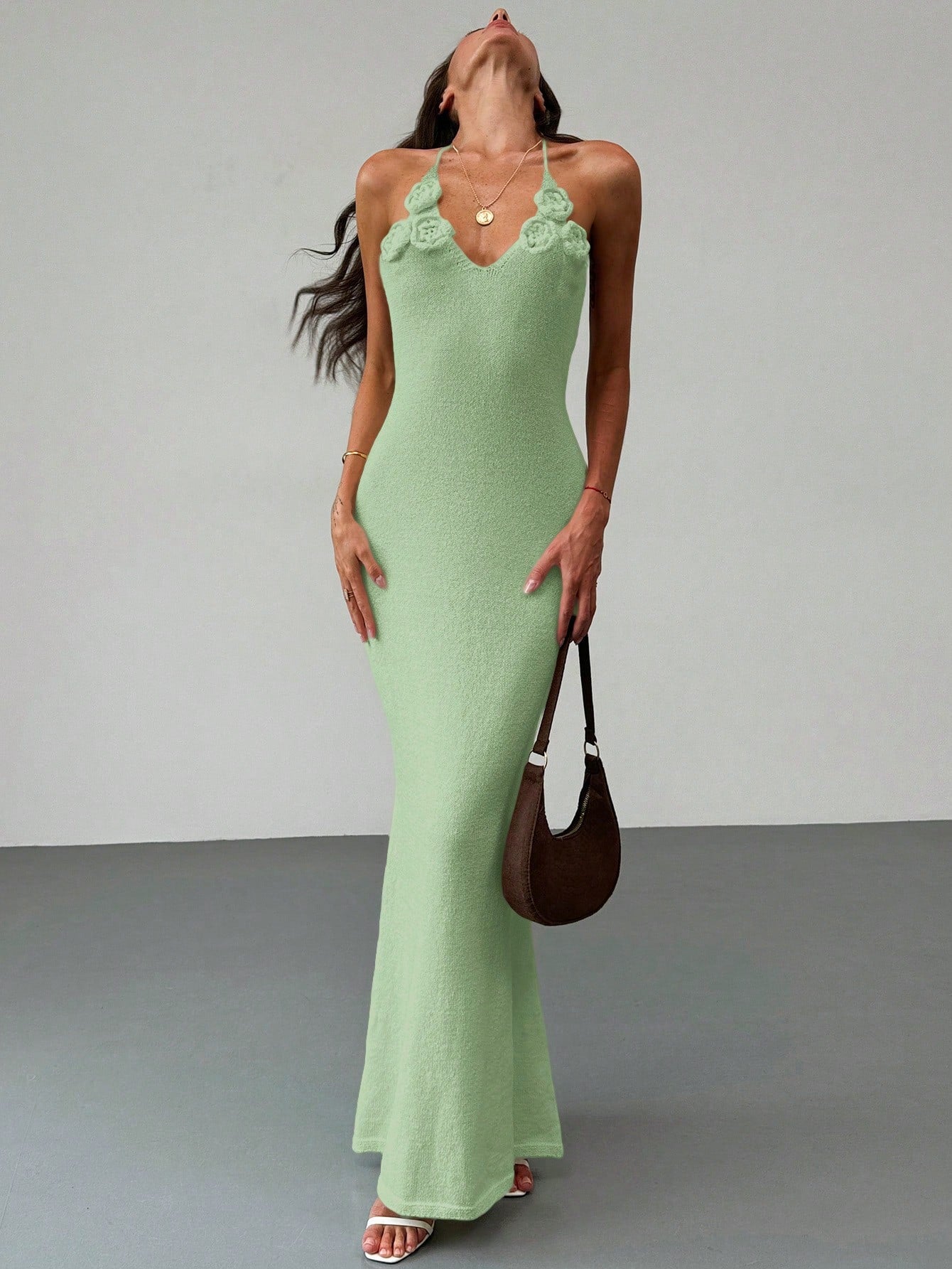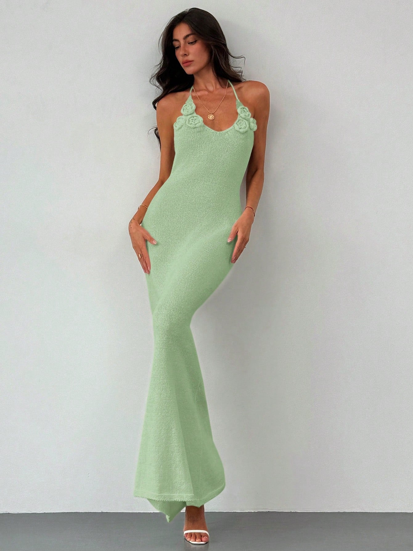 فستان ألوروه المشمشي المحبوك بدون ظهر برباط عند الرقبة، بقصة ضيقة، مناسب للعطلات والسهرات الرومانسية.