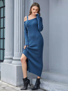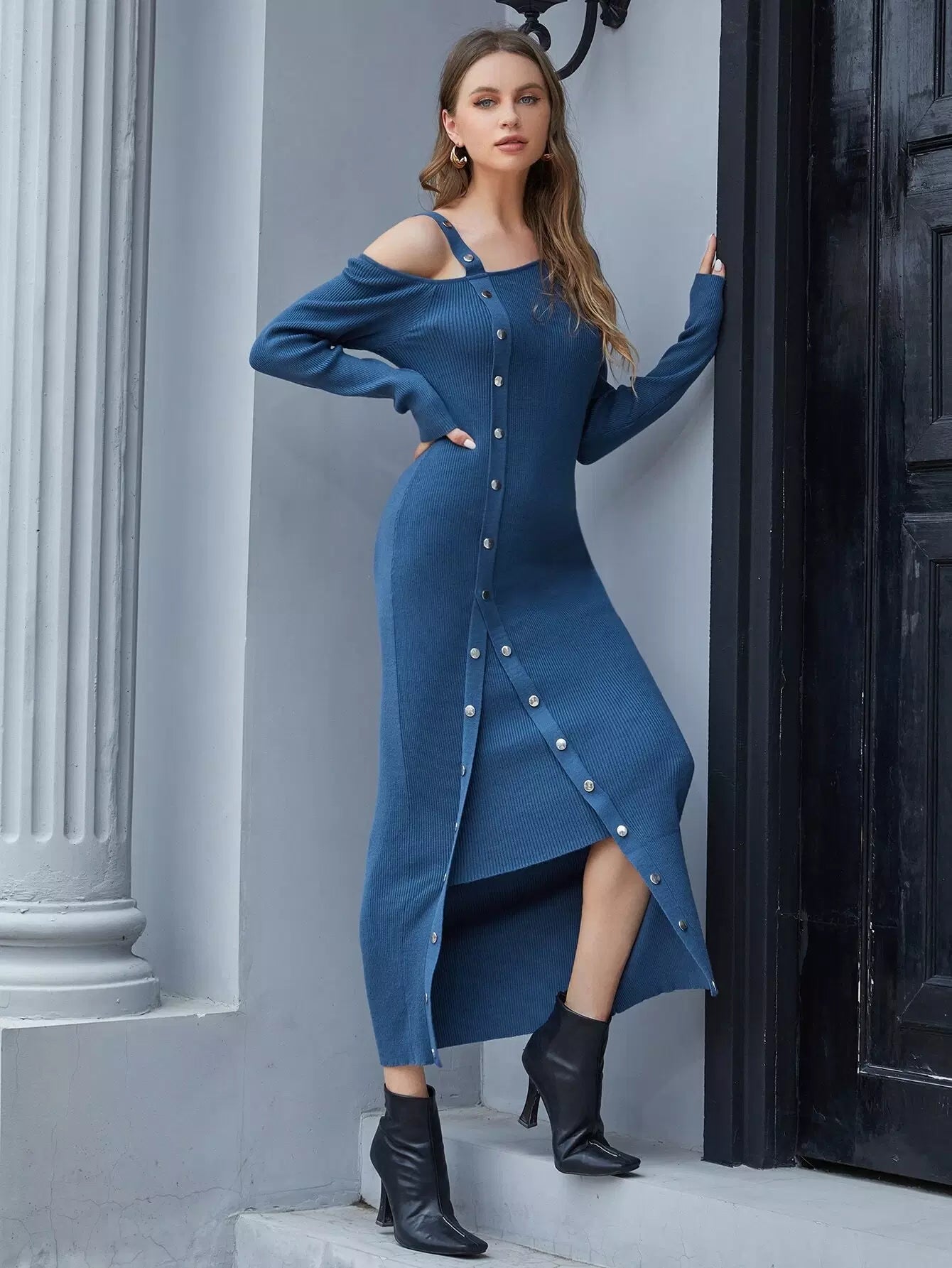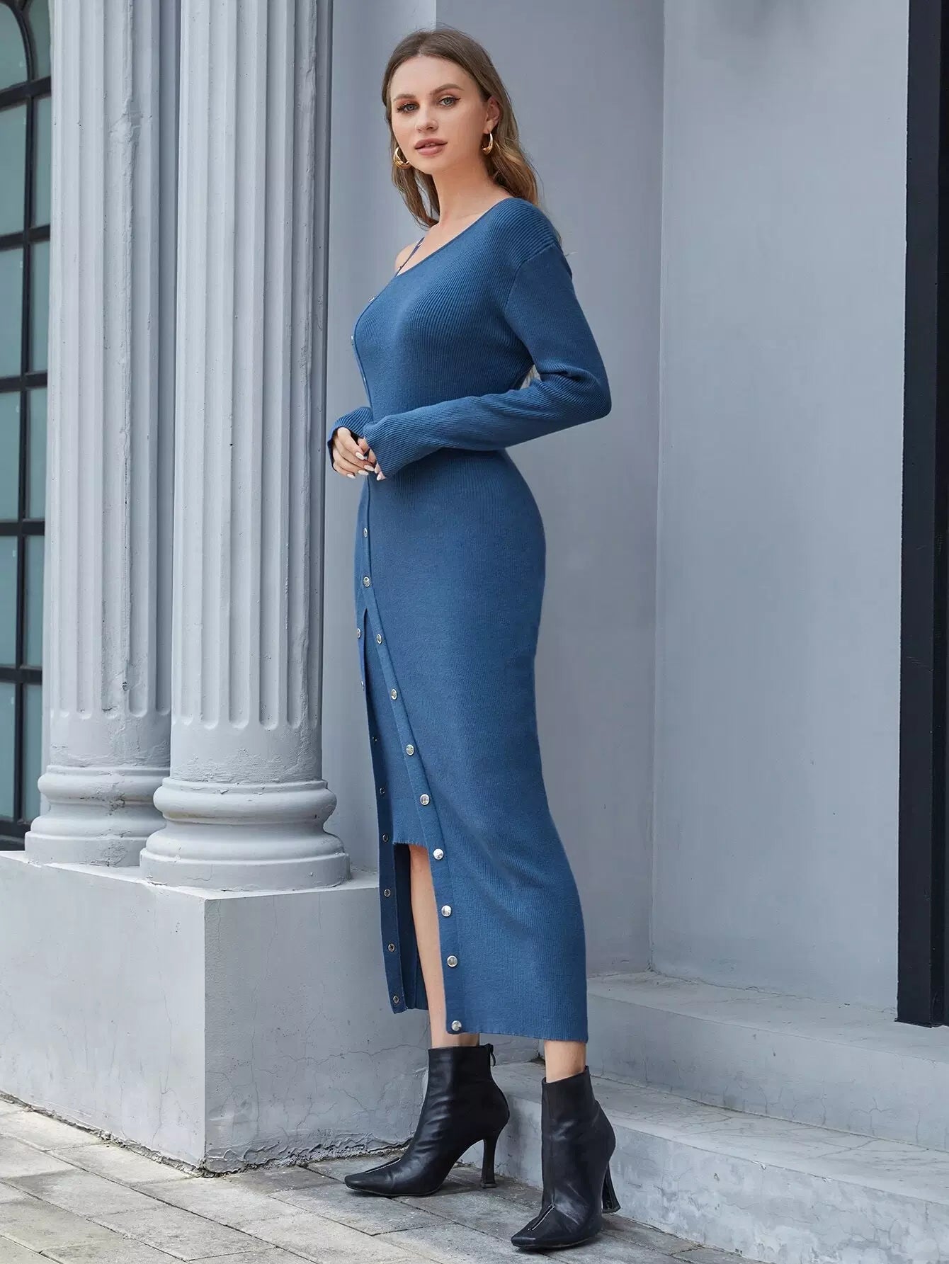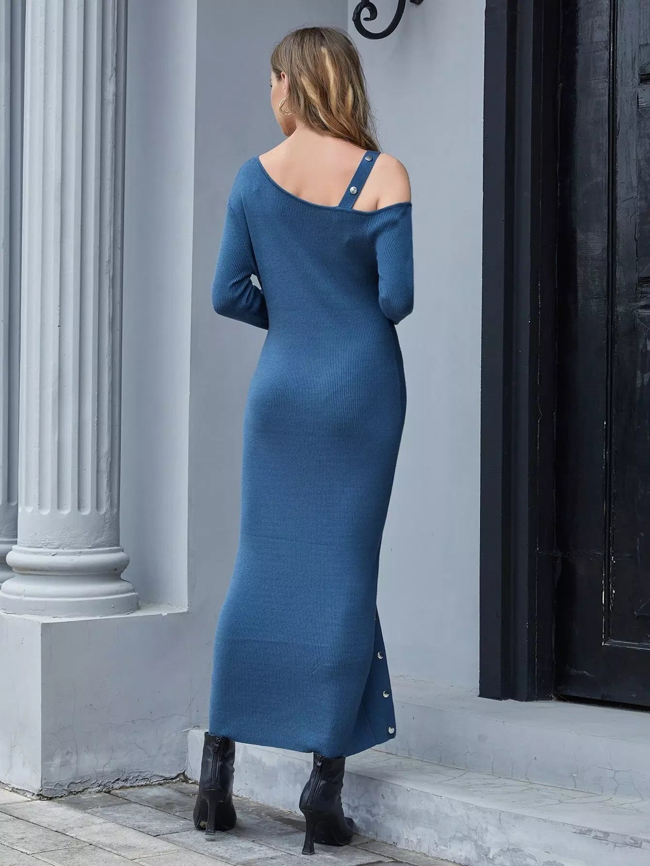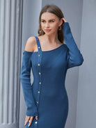 فستان كنزة برقبة غير متناظرة بأزرار أمامية