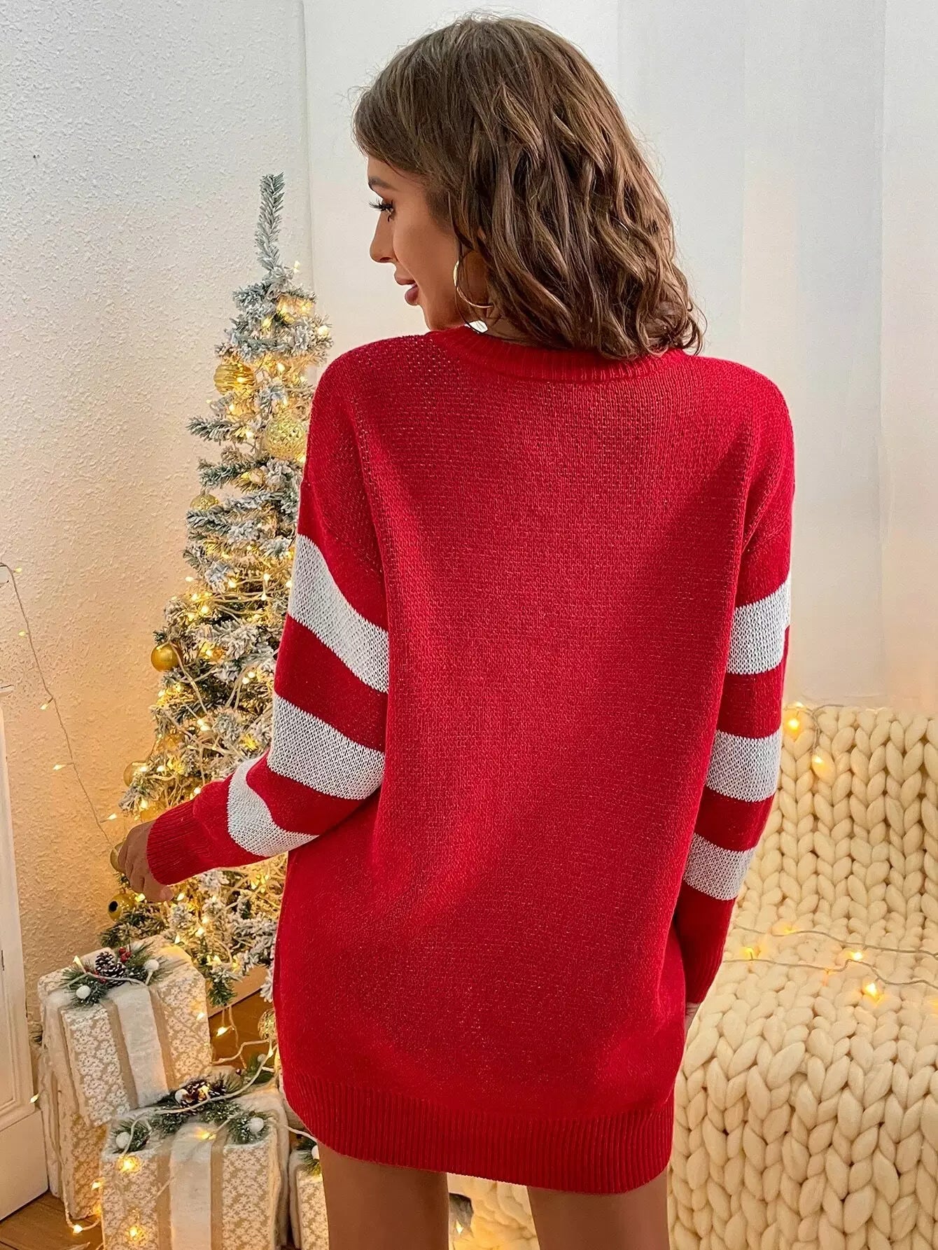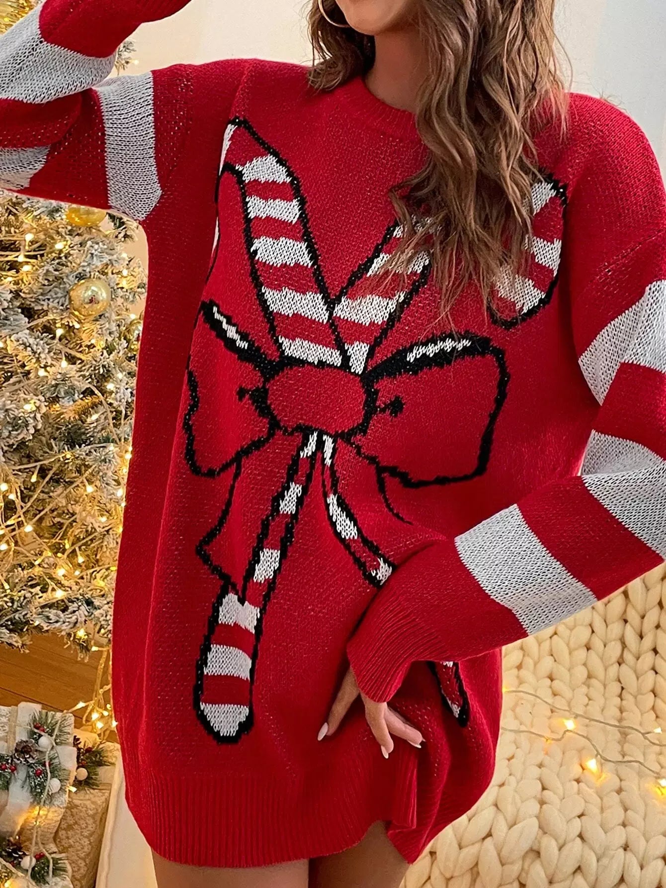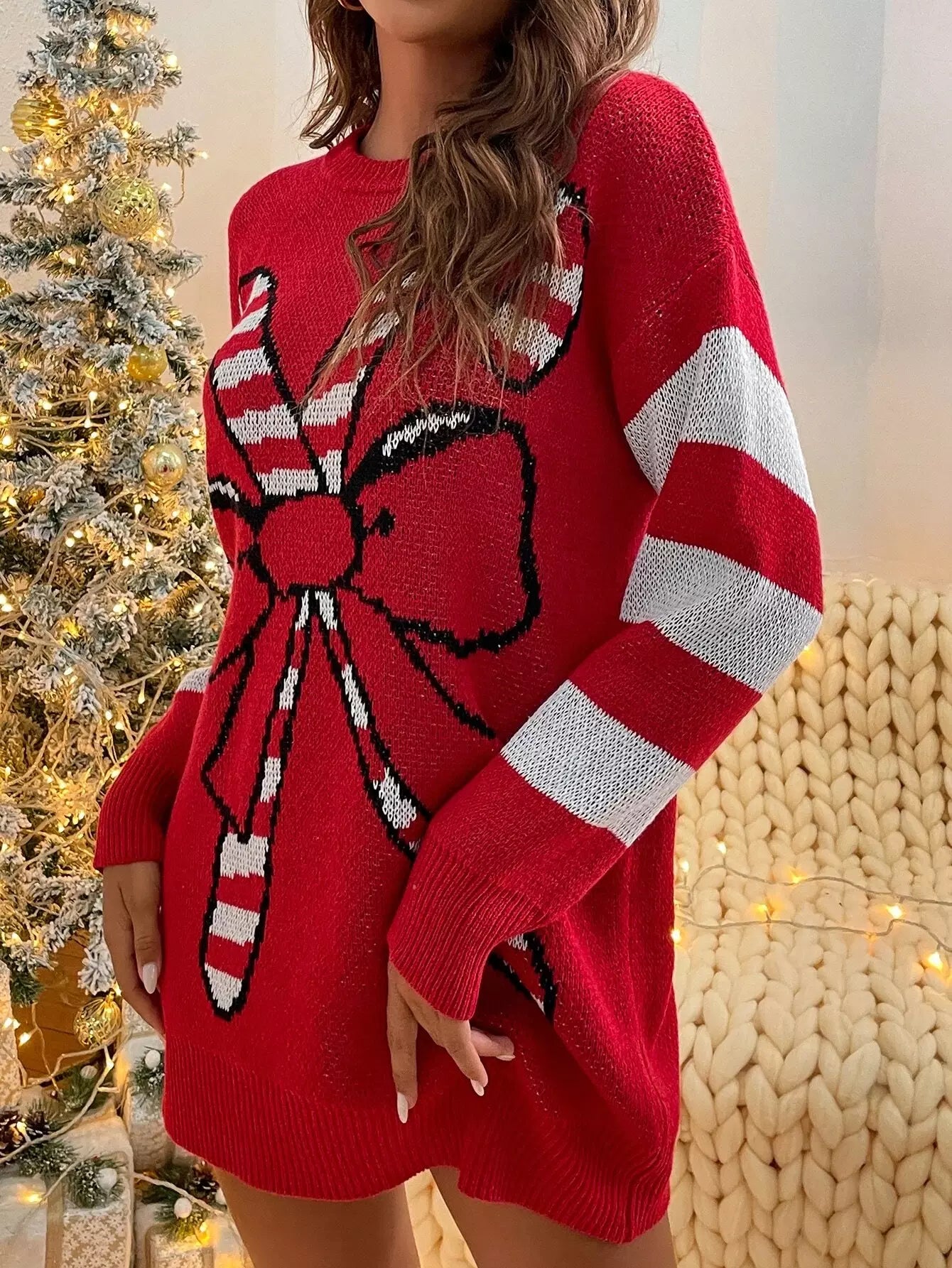 فستان منسدل الكتفين بنقشة عيد الميلاد