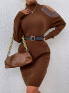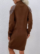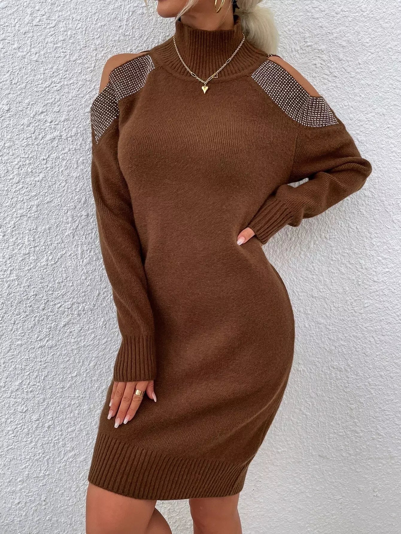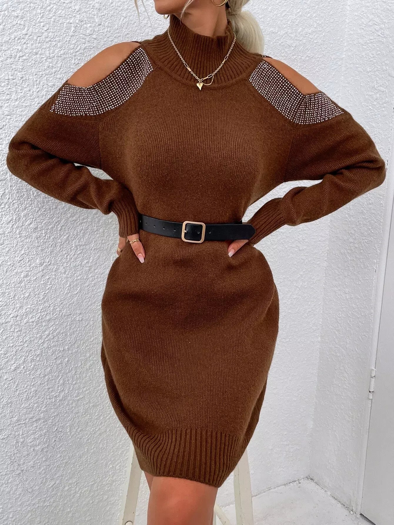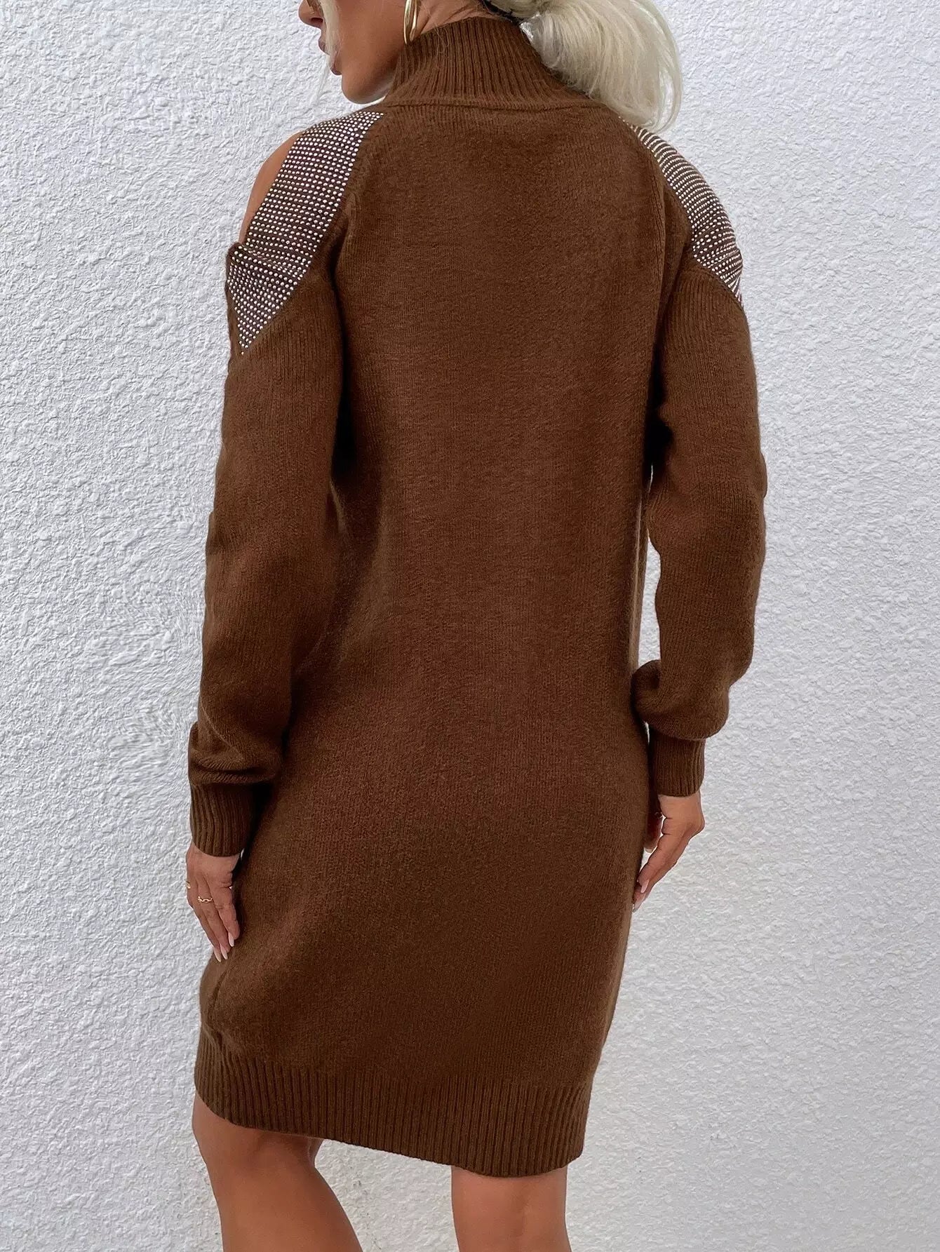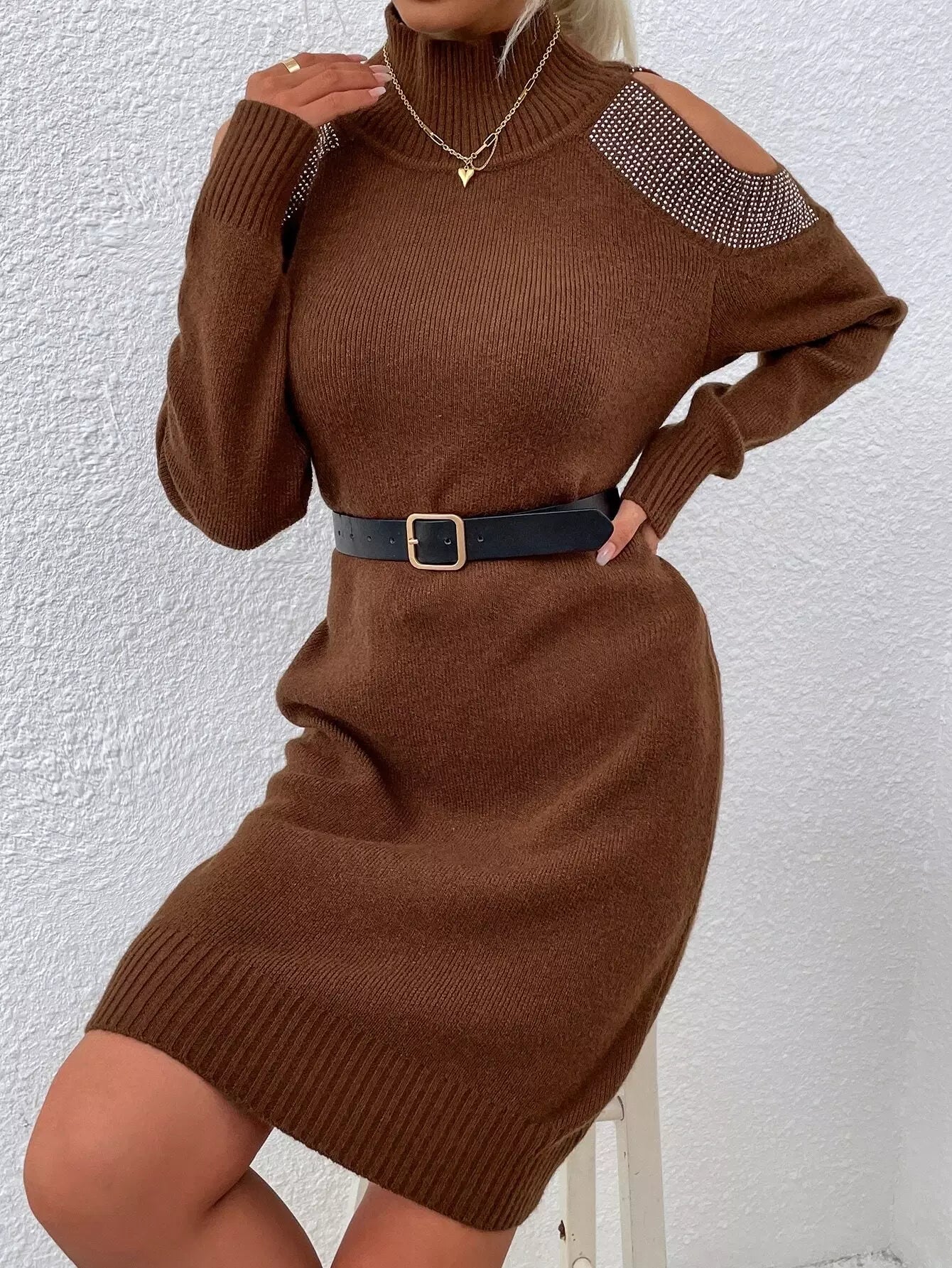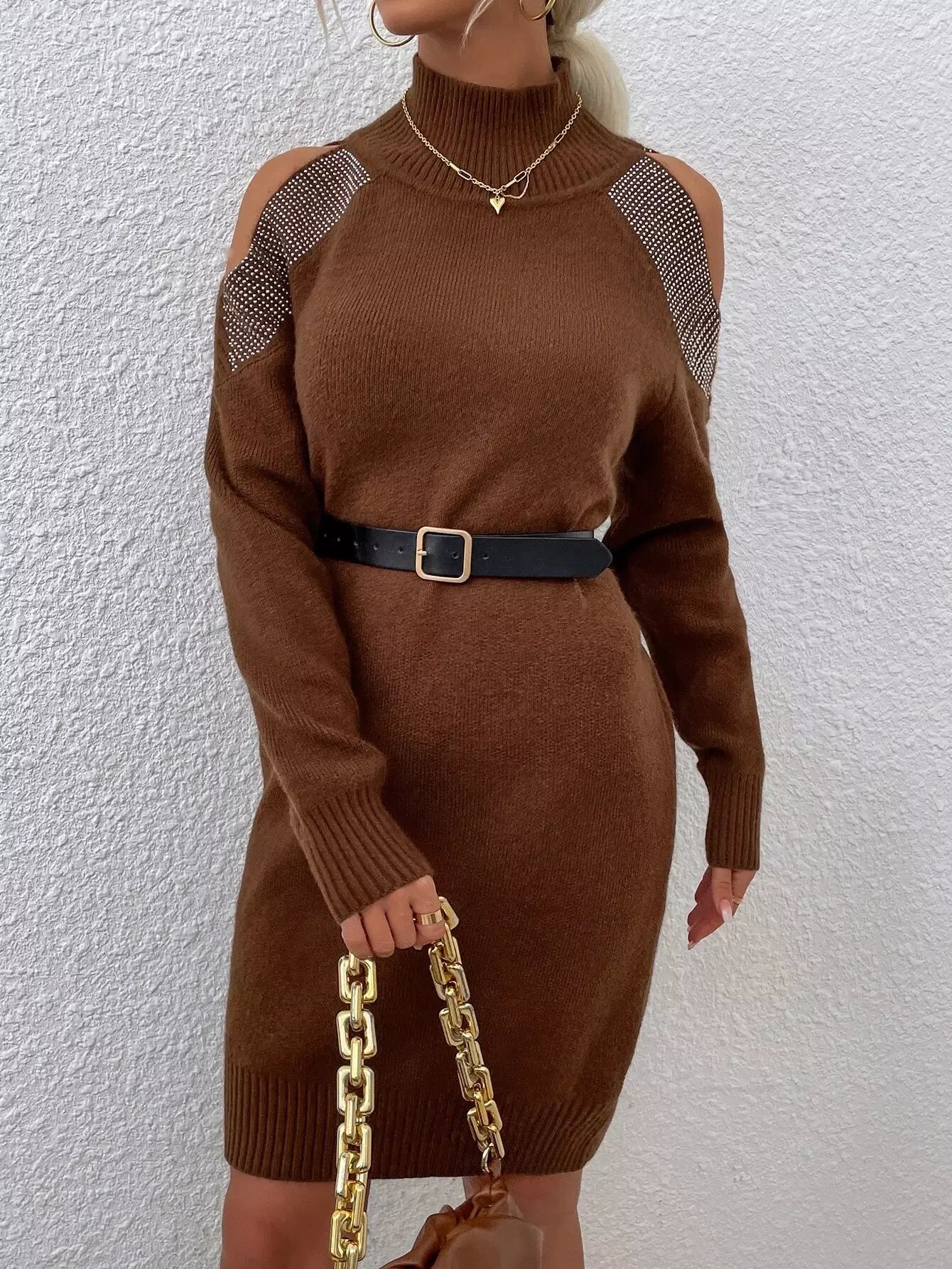 فستان بكتف بارد بنقشة حجر الراين برقبة عالية بدون حزام