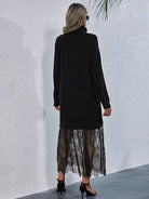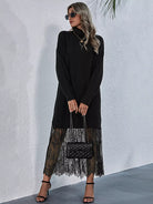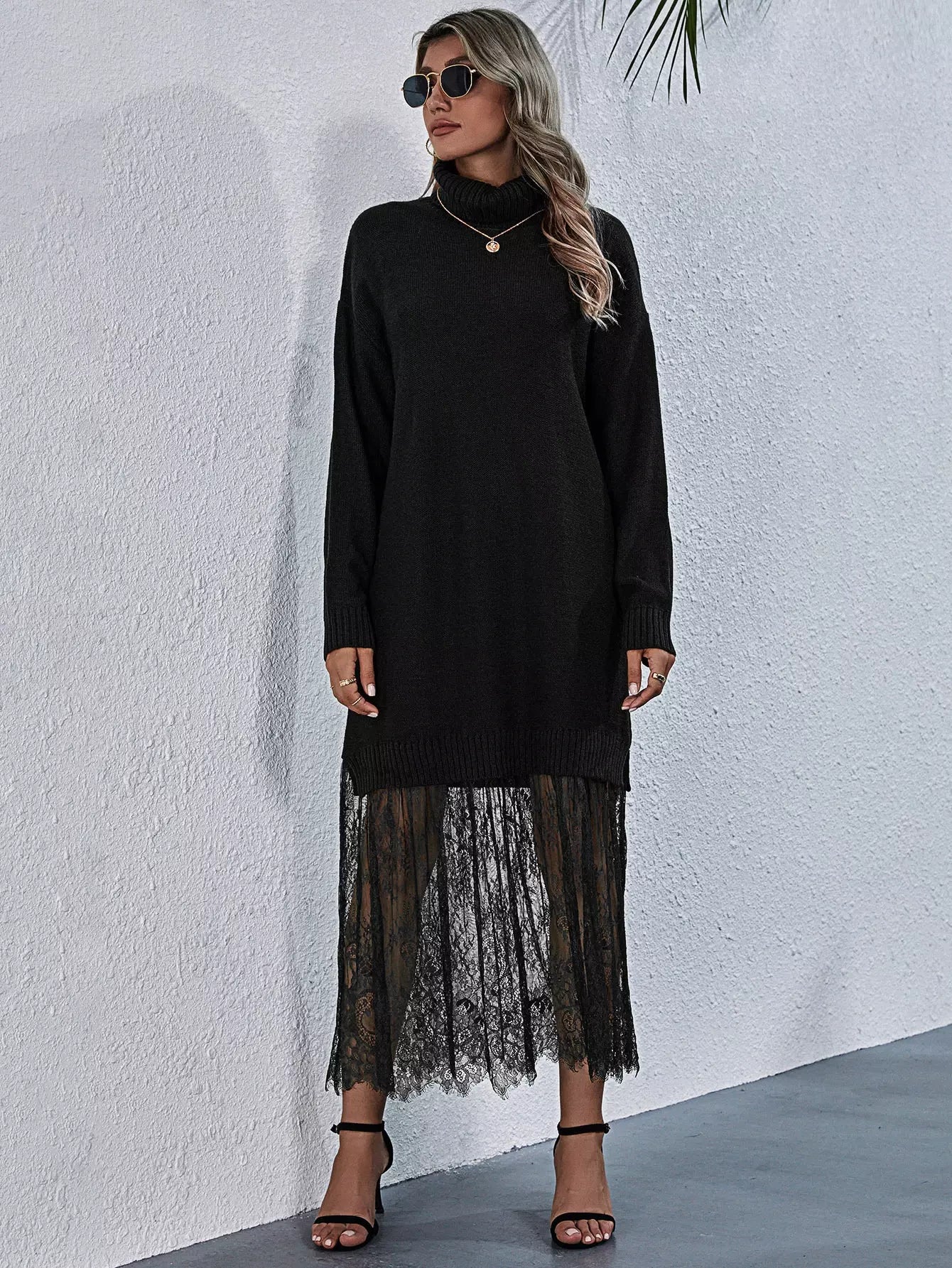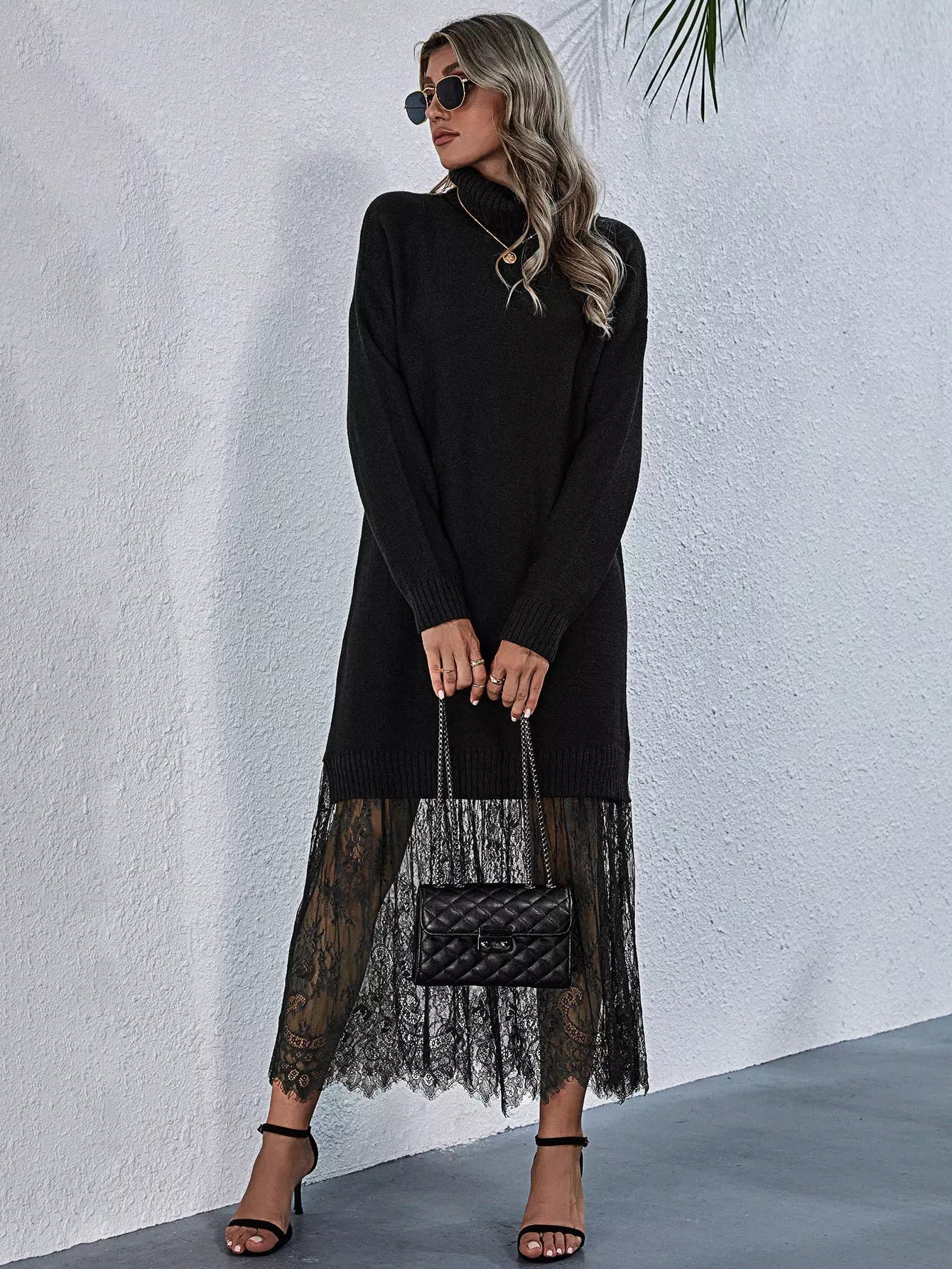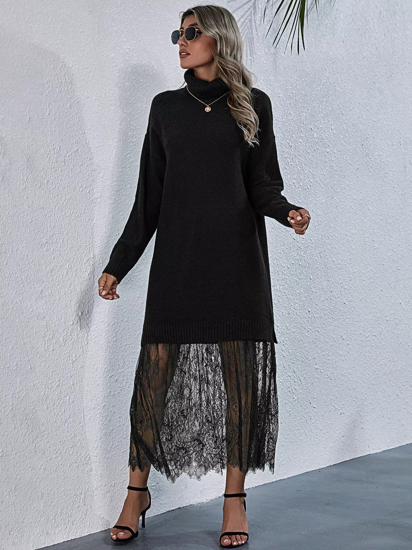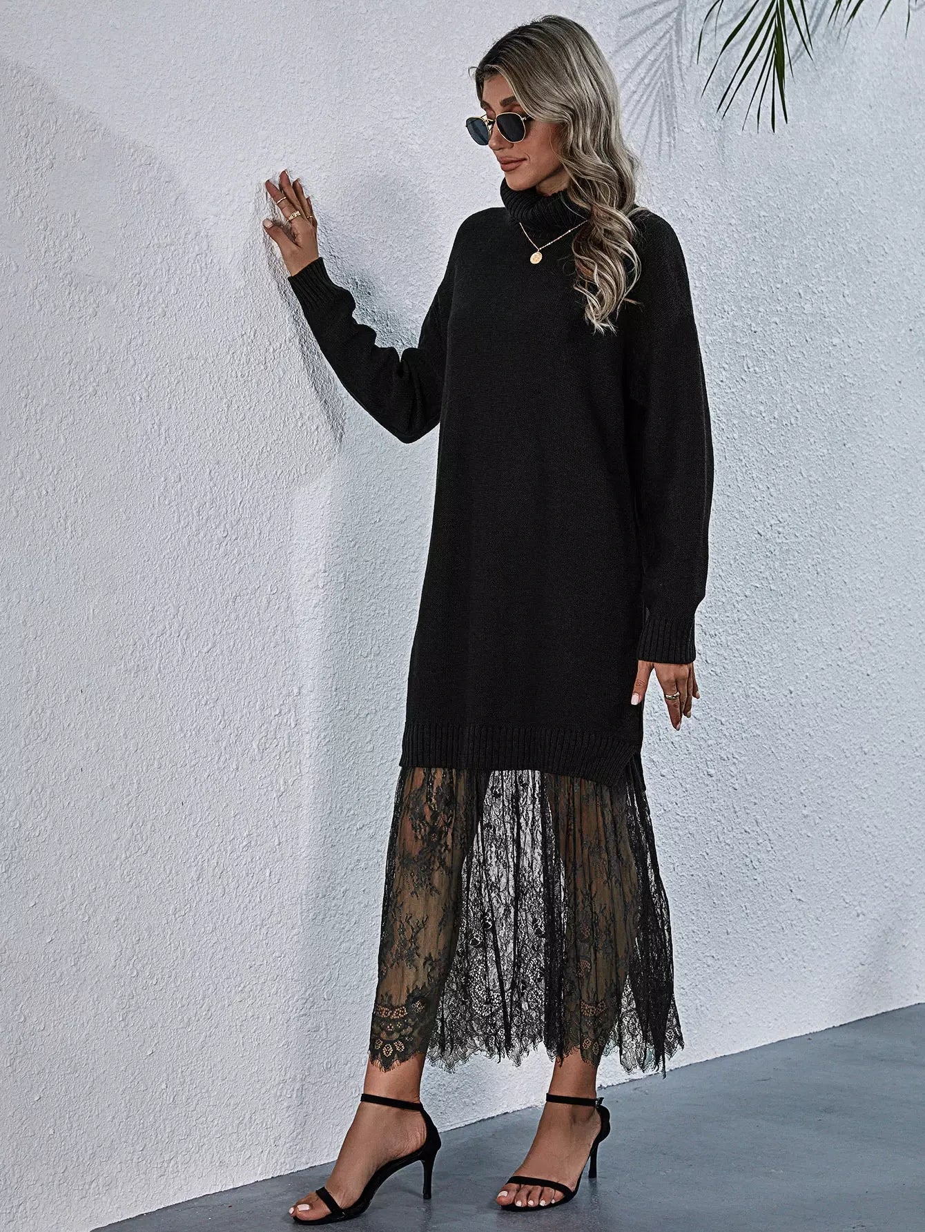 فستان بحاشية من الدانتيل بلون مغاير بياقة مدورة