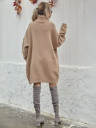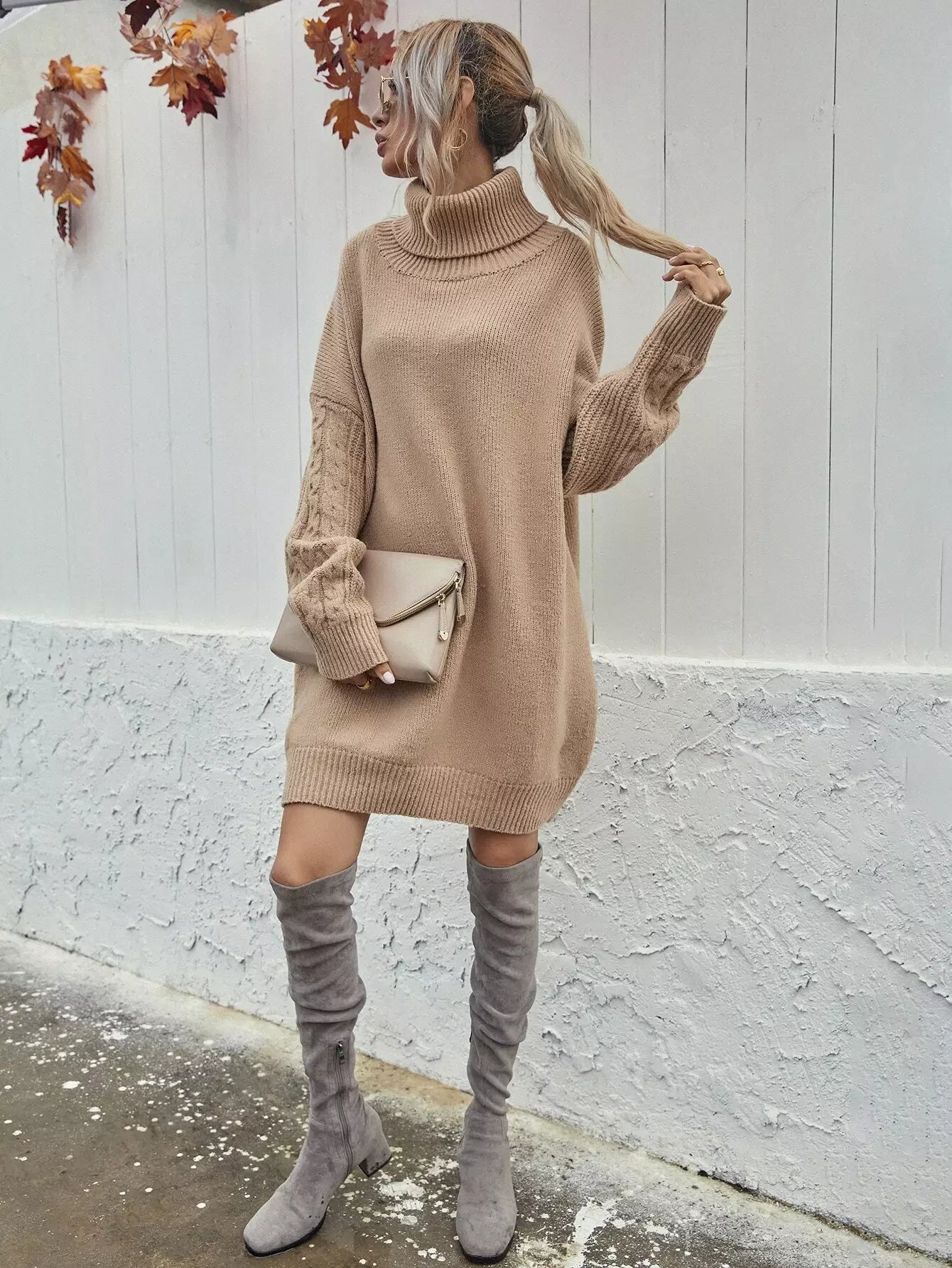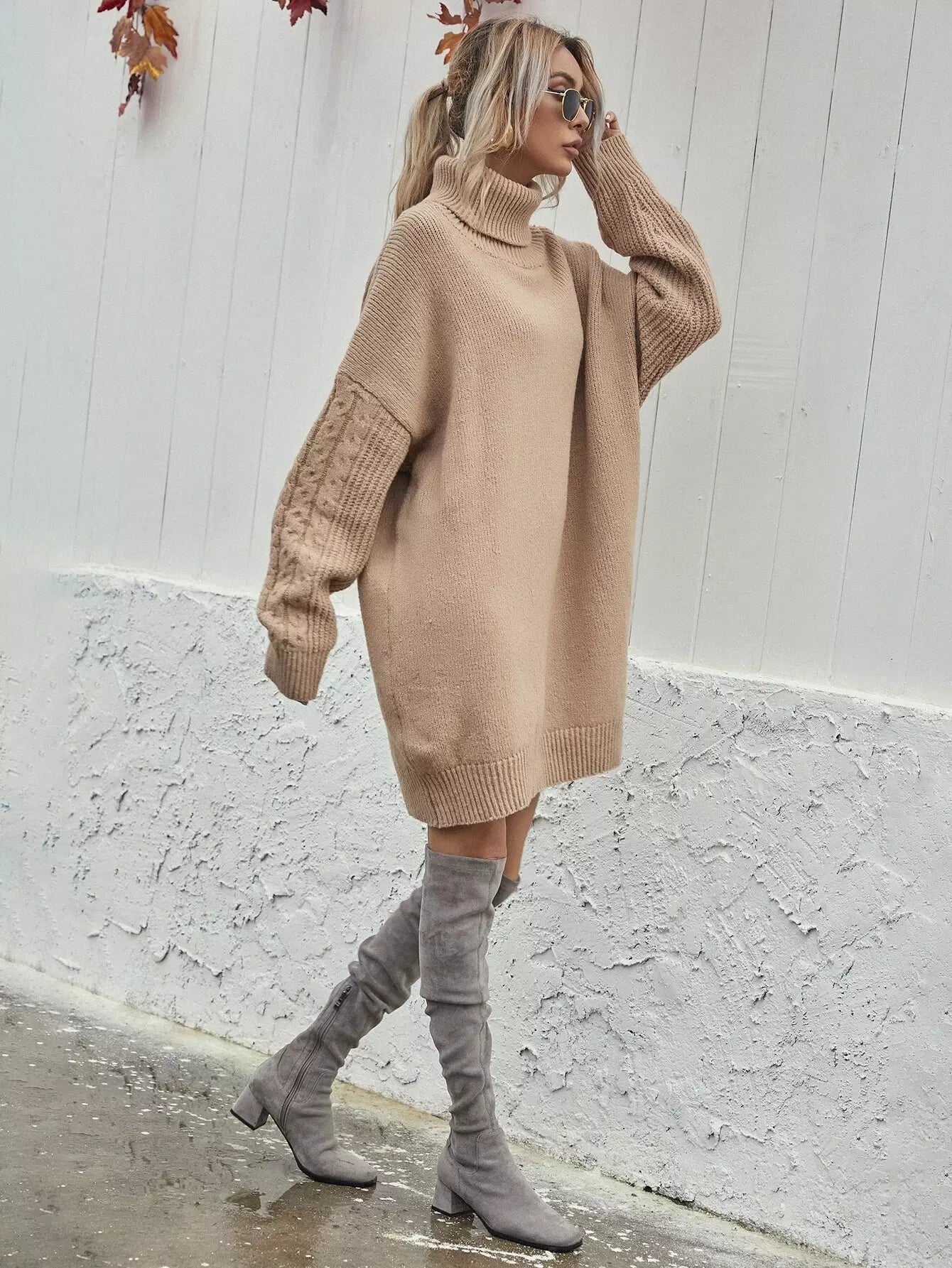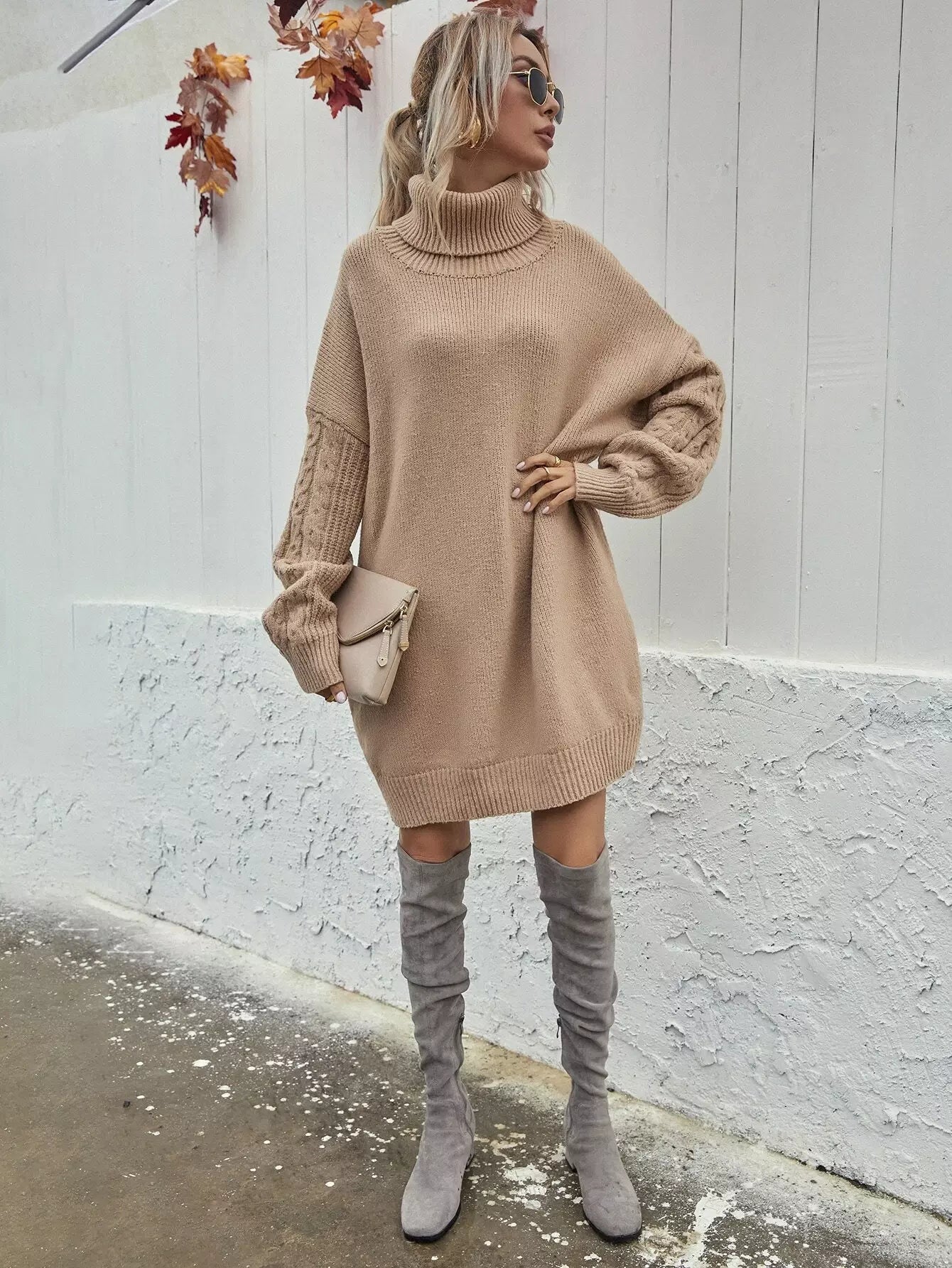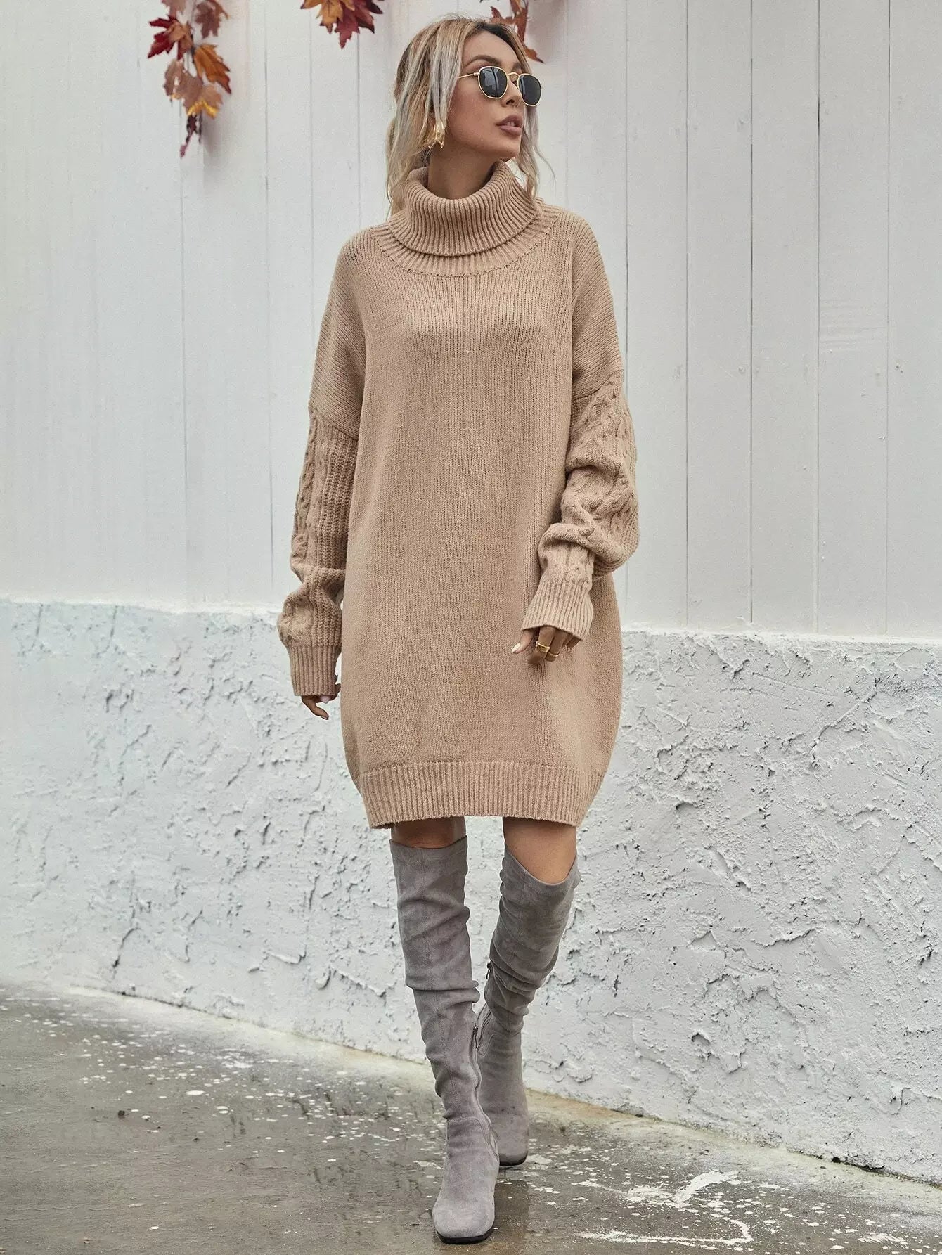 فستان بأكتاف منسدلة بأكمام كبيرة متماسكة بكابل محبوكة