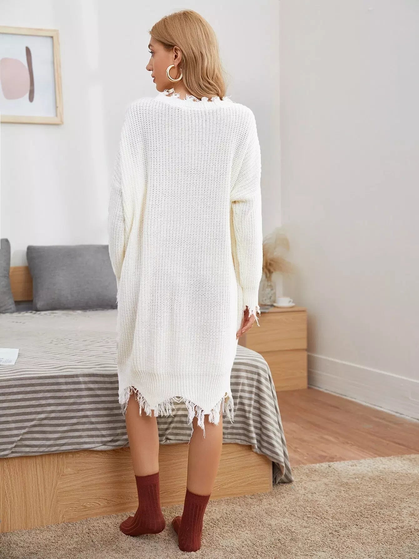 فستان سويت شيرت سادة ذو حافة متهالكة بدون حزام