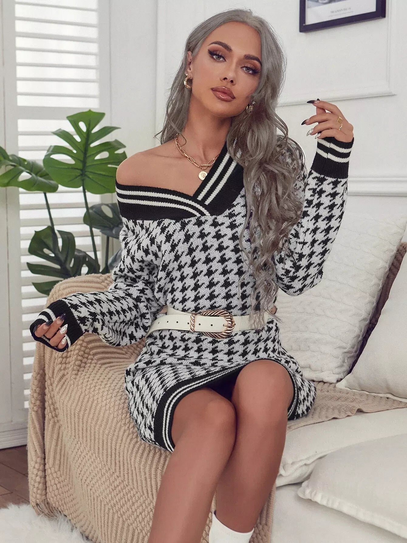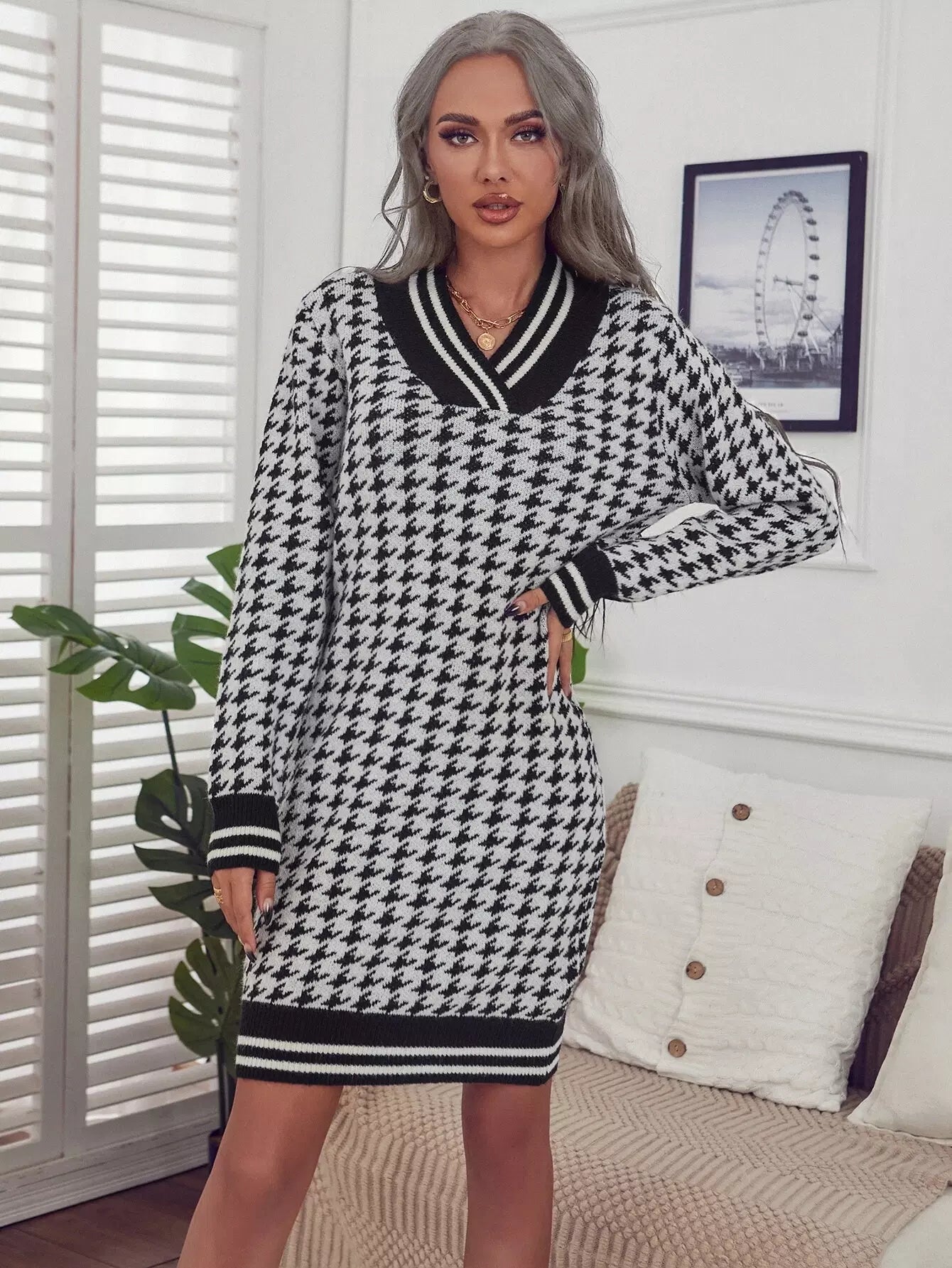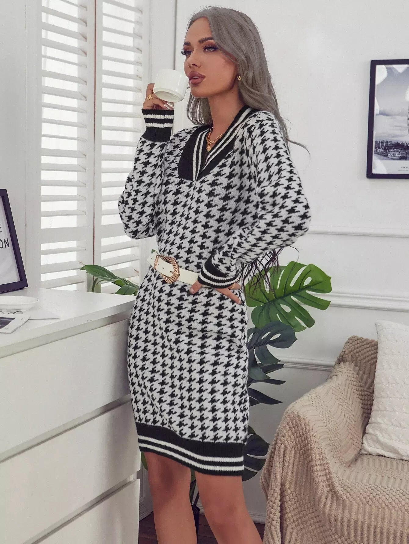 فستان سترة بنقشة مربعة ومخططة بدون حزام
