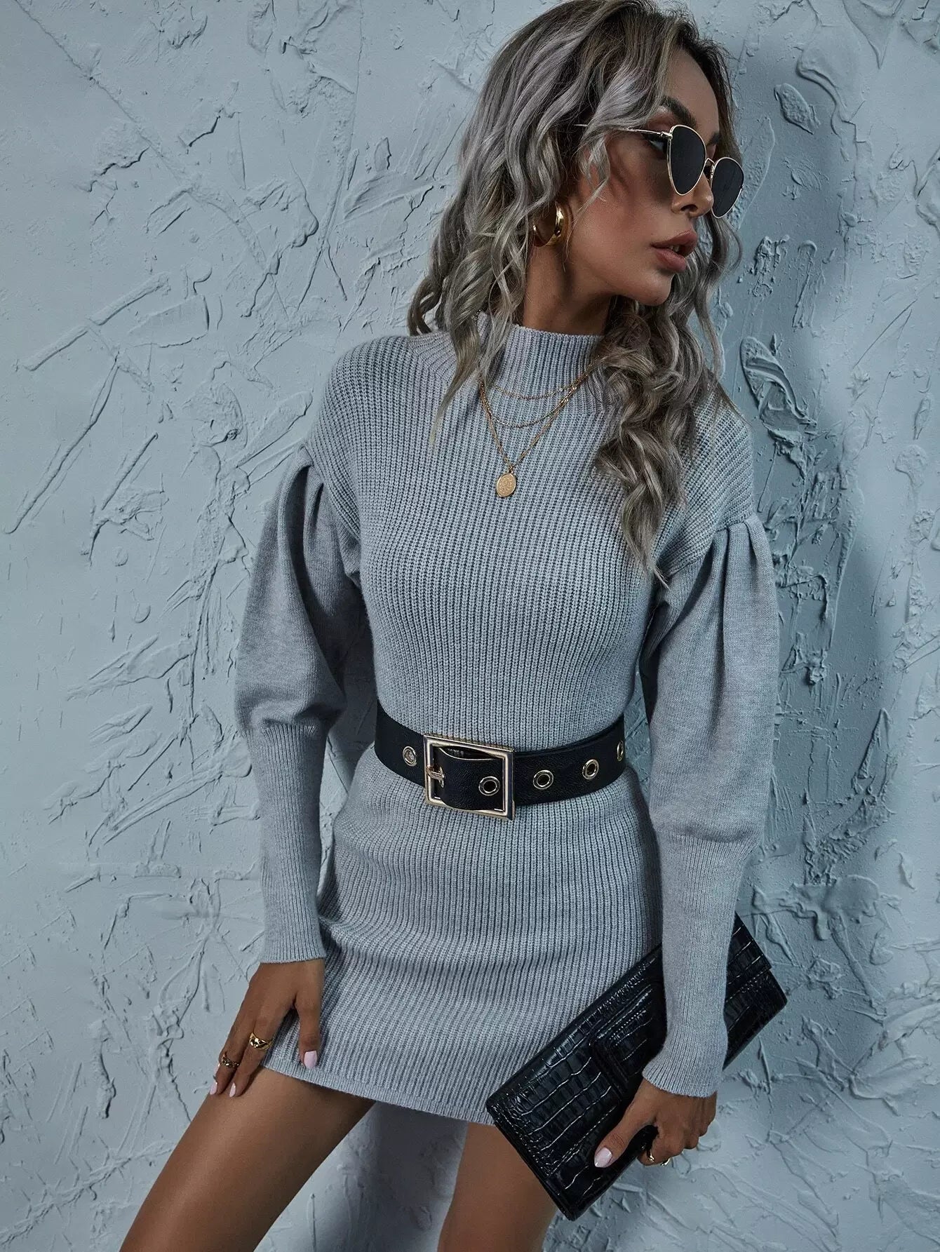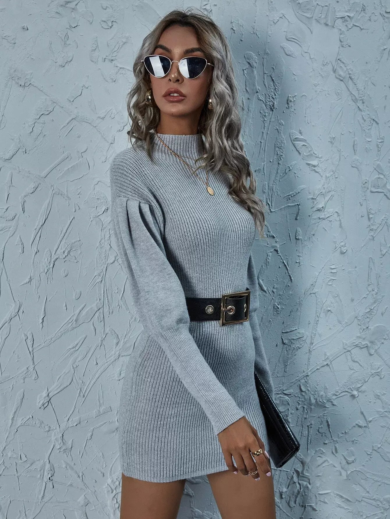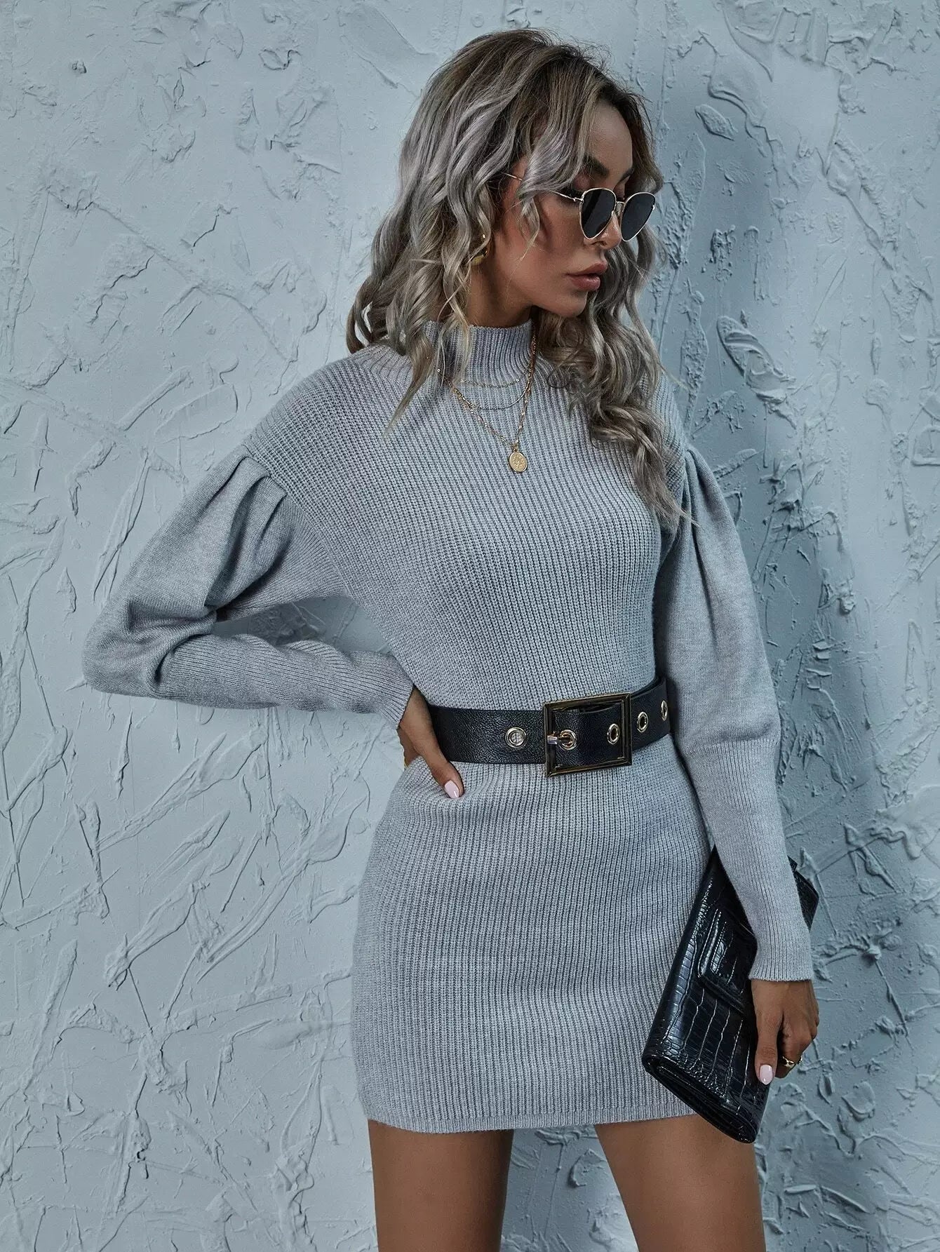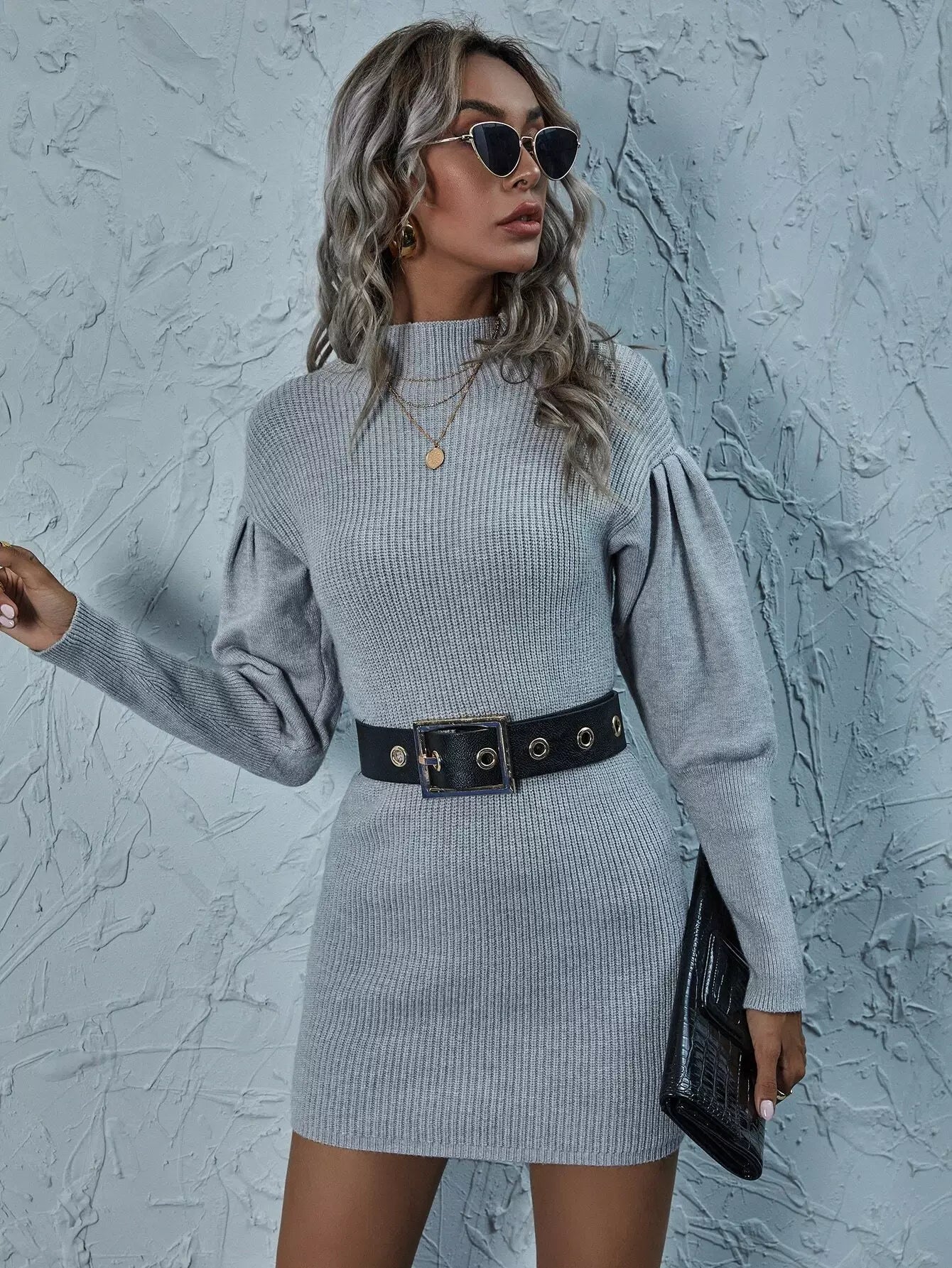 فستان برقبة وهمية بأكمام جيجوت بدون حزام