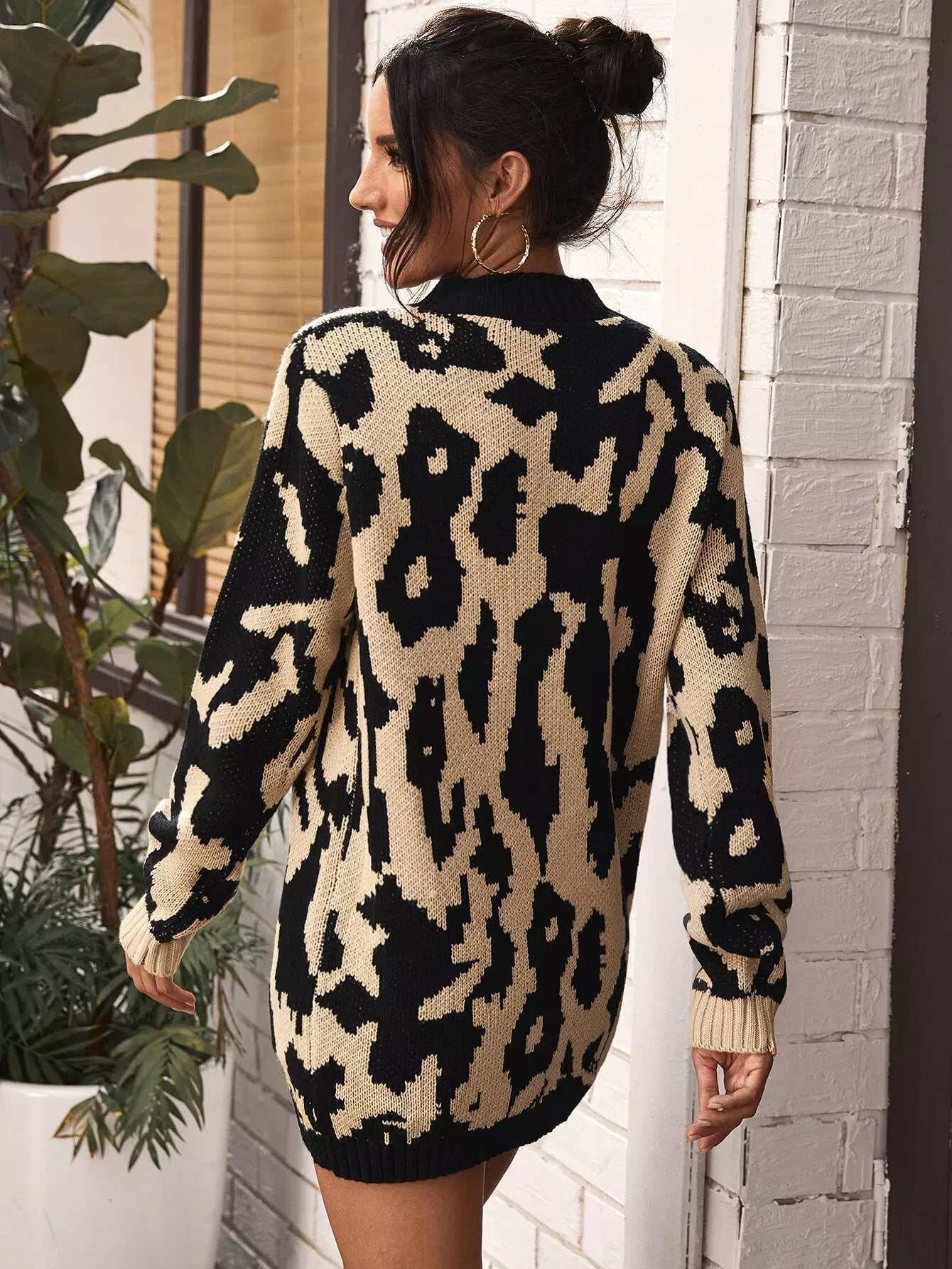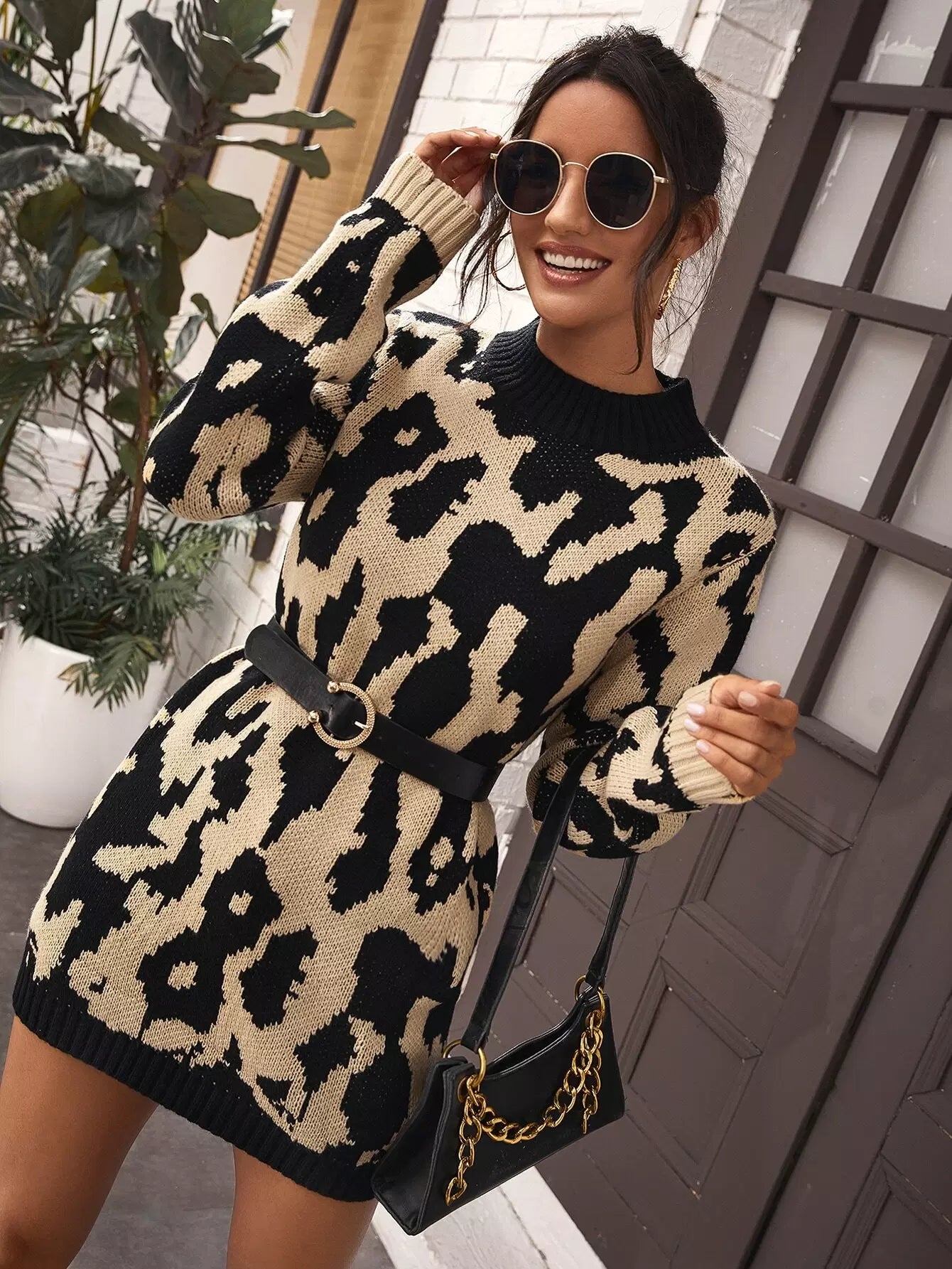 كنزة برقبة وهمية بنقشة جرافيك بنقشة جرافيك طويلة بدون حزام