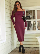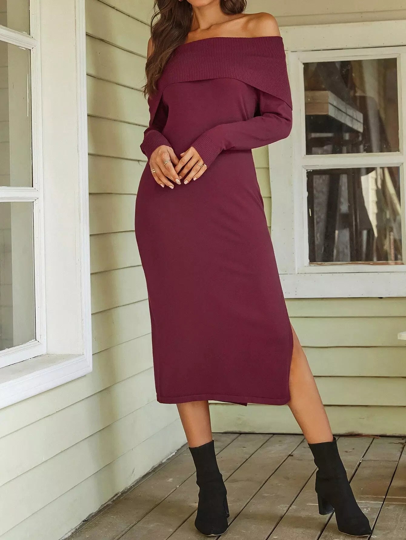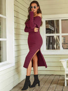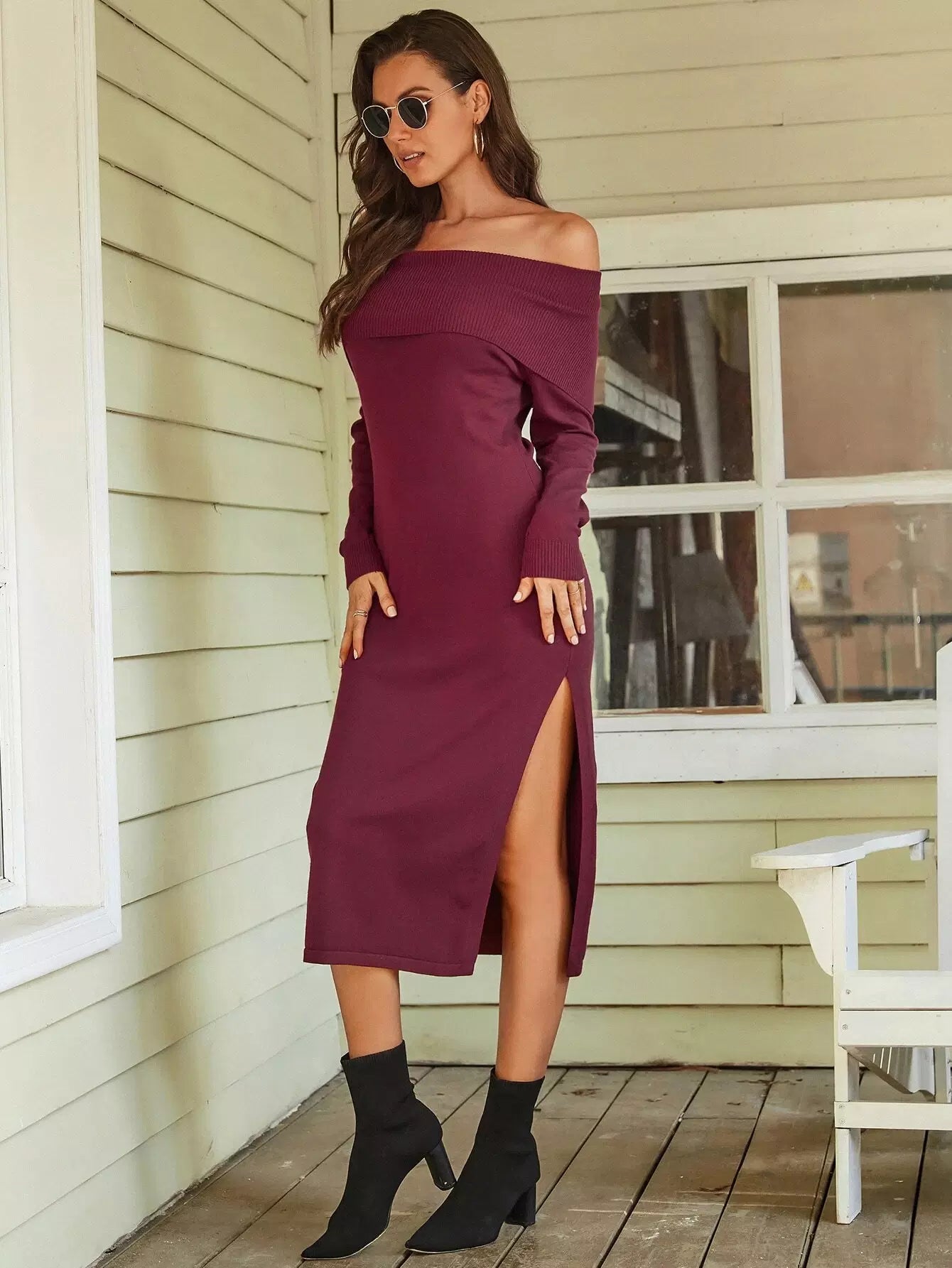 فستان مكشوف الأكتاف مطوي على الأكتاف ومفتوح من الفخذين