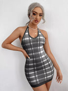فستان قصير منقوش برقبة رقبة رسن منقوشة بدون أكمام