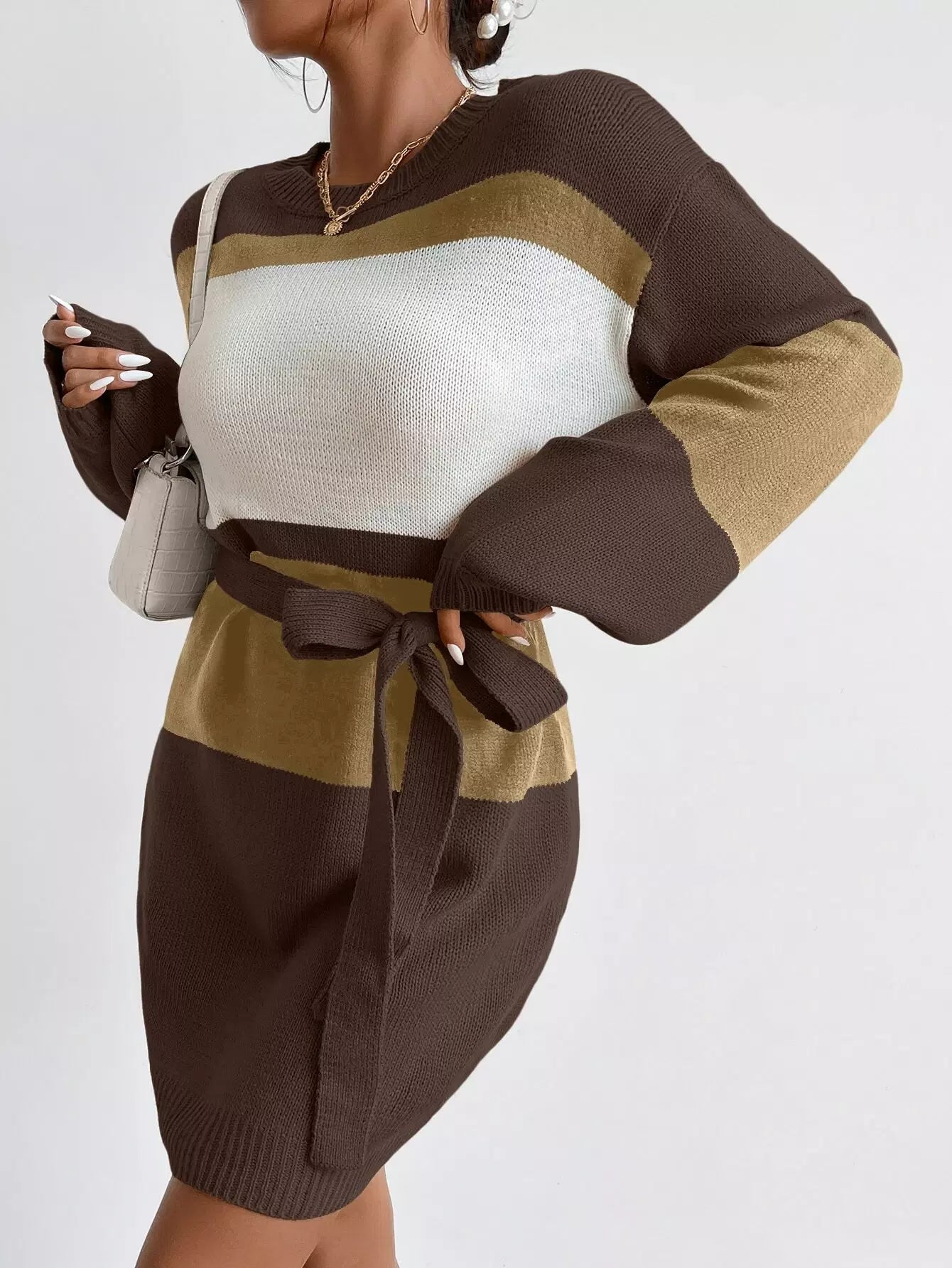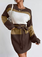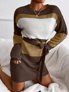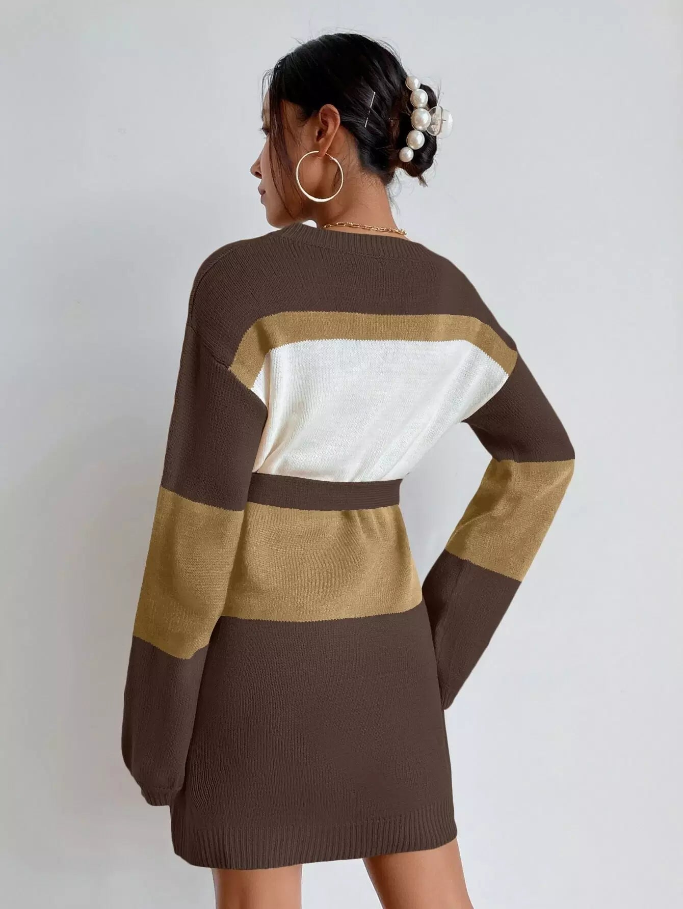 فستان سترة مخطط بكتف منسدل ومنسوج مضلع بدون حزام