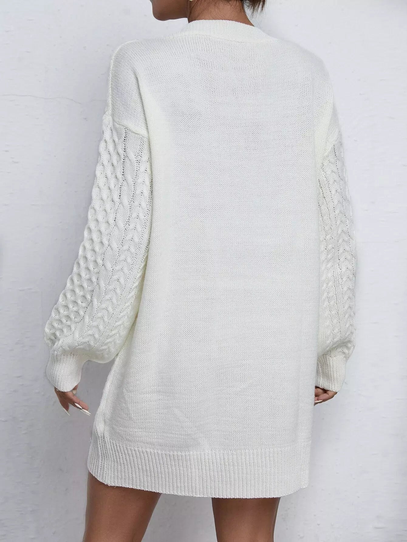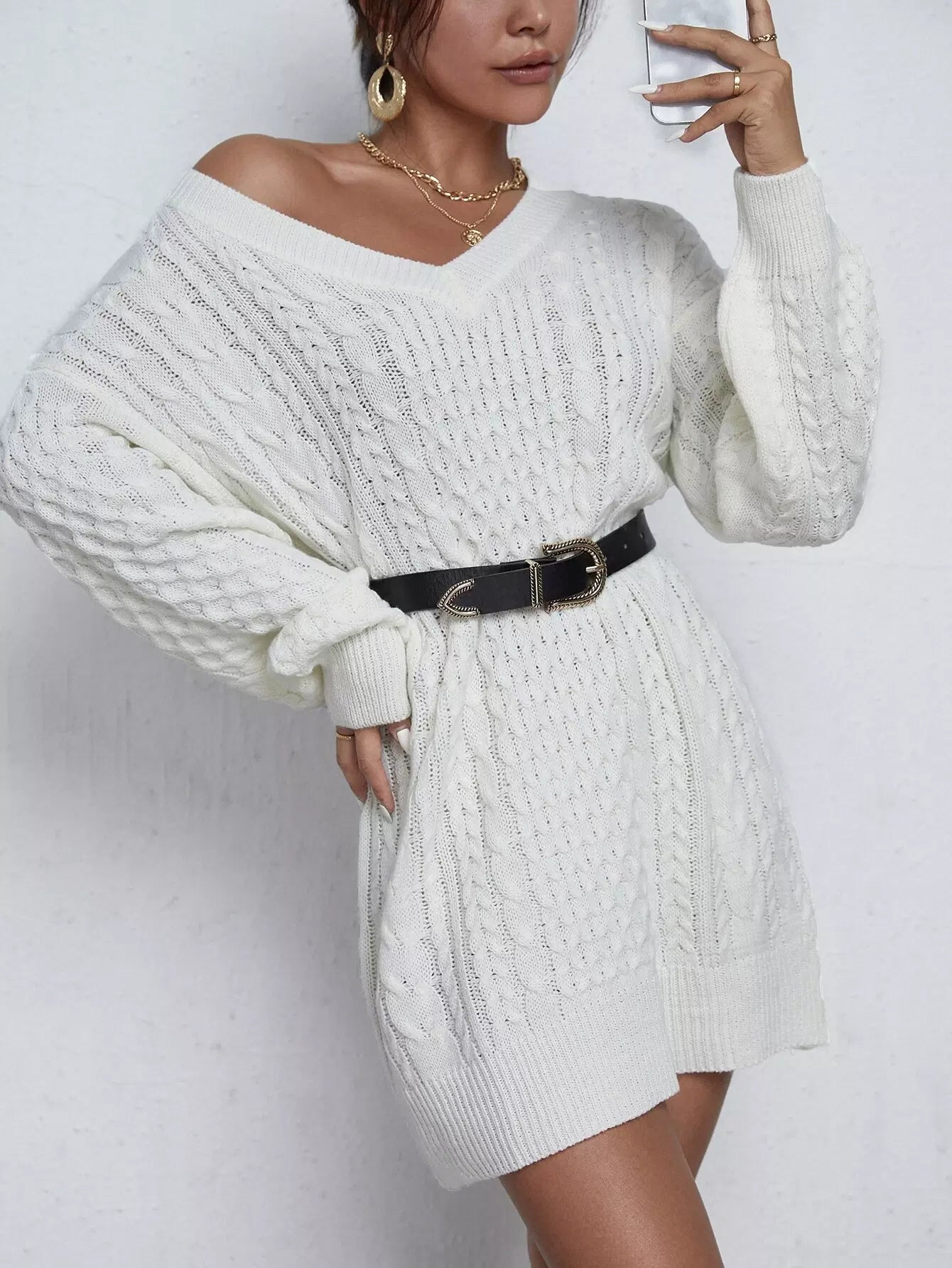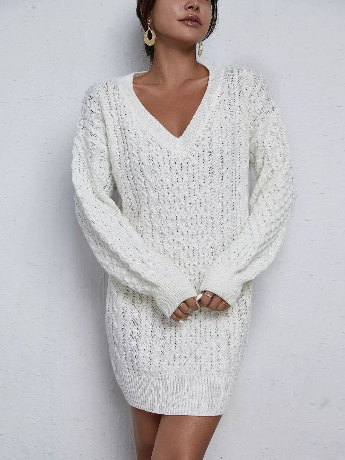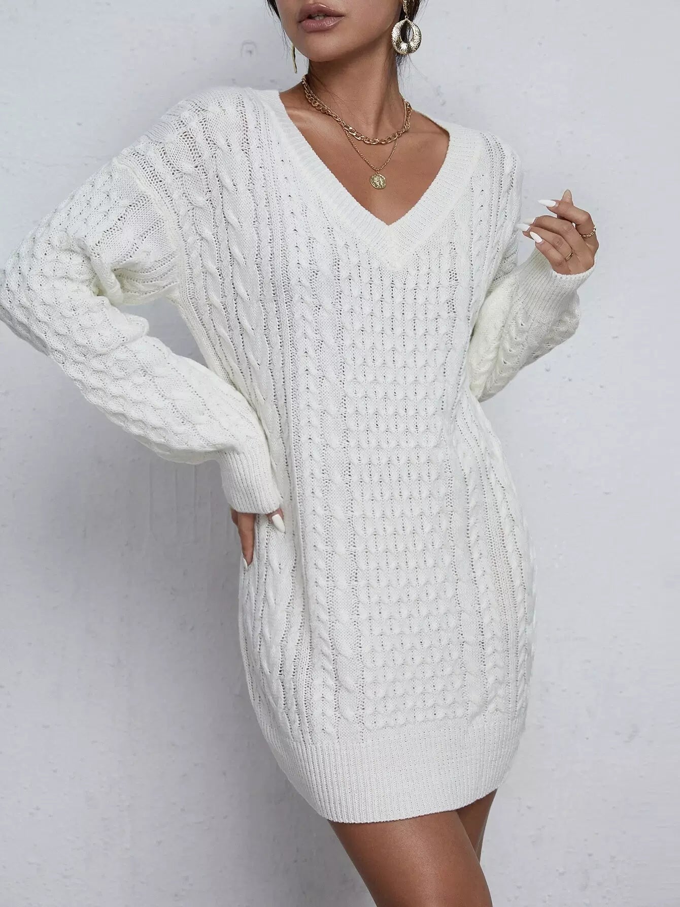 فستان سترة متماسكة برقبة على شكل V وأكتاف منسدلة بدون حزام