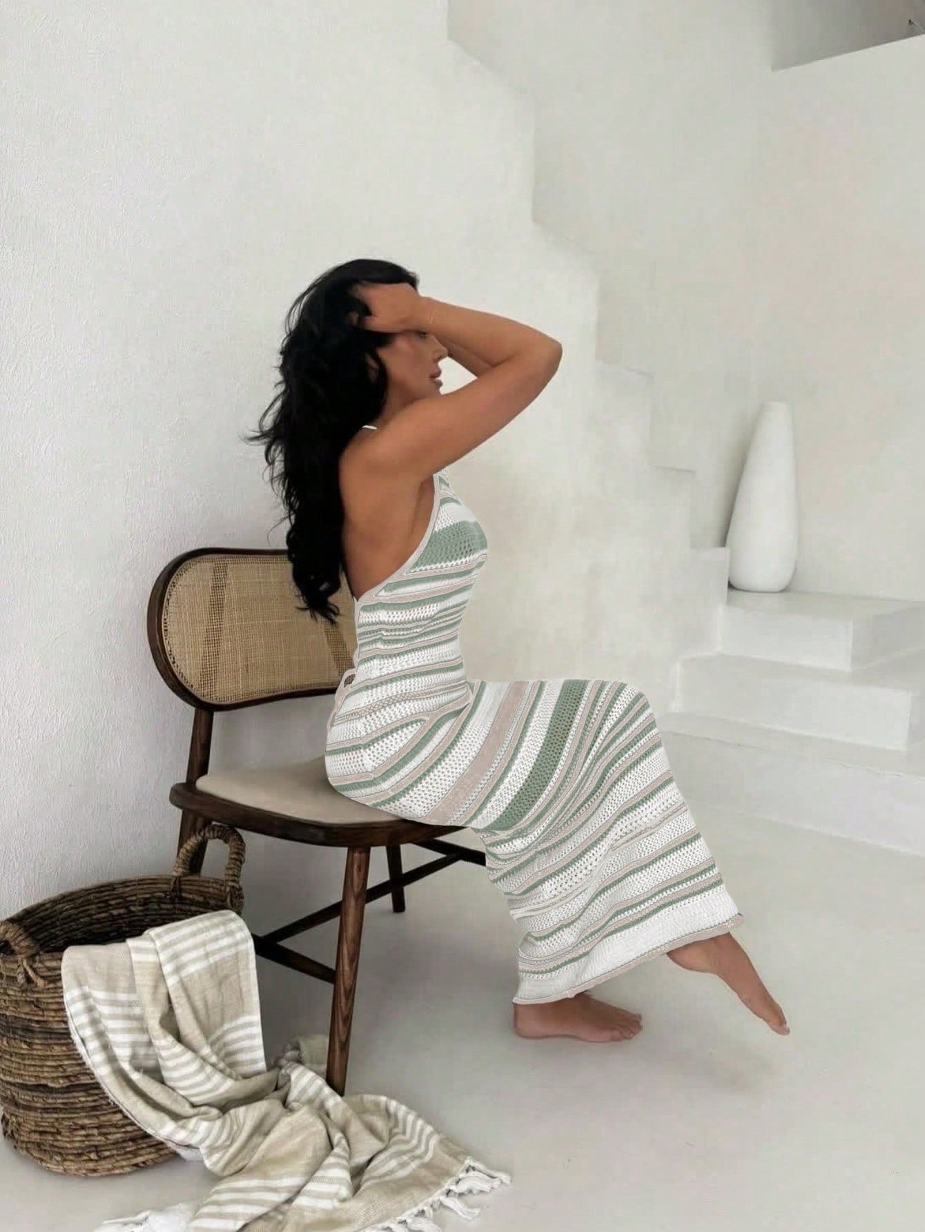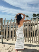 فستان شاطئي أنيق وجذاب بتصميم مجوف بدون أكمام، ضيق ومخطط، مصنوع من نسيج محبوك