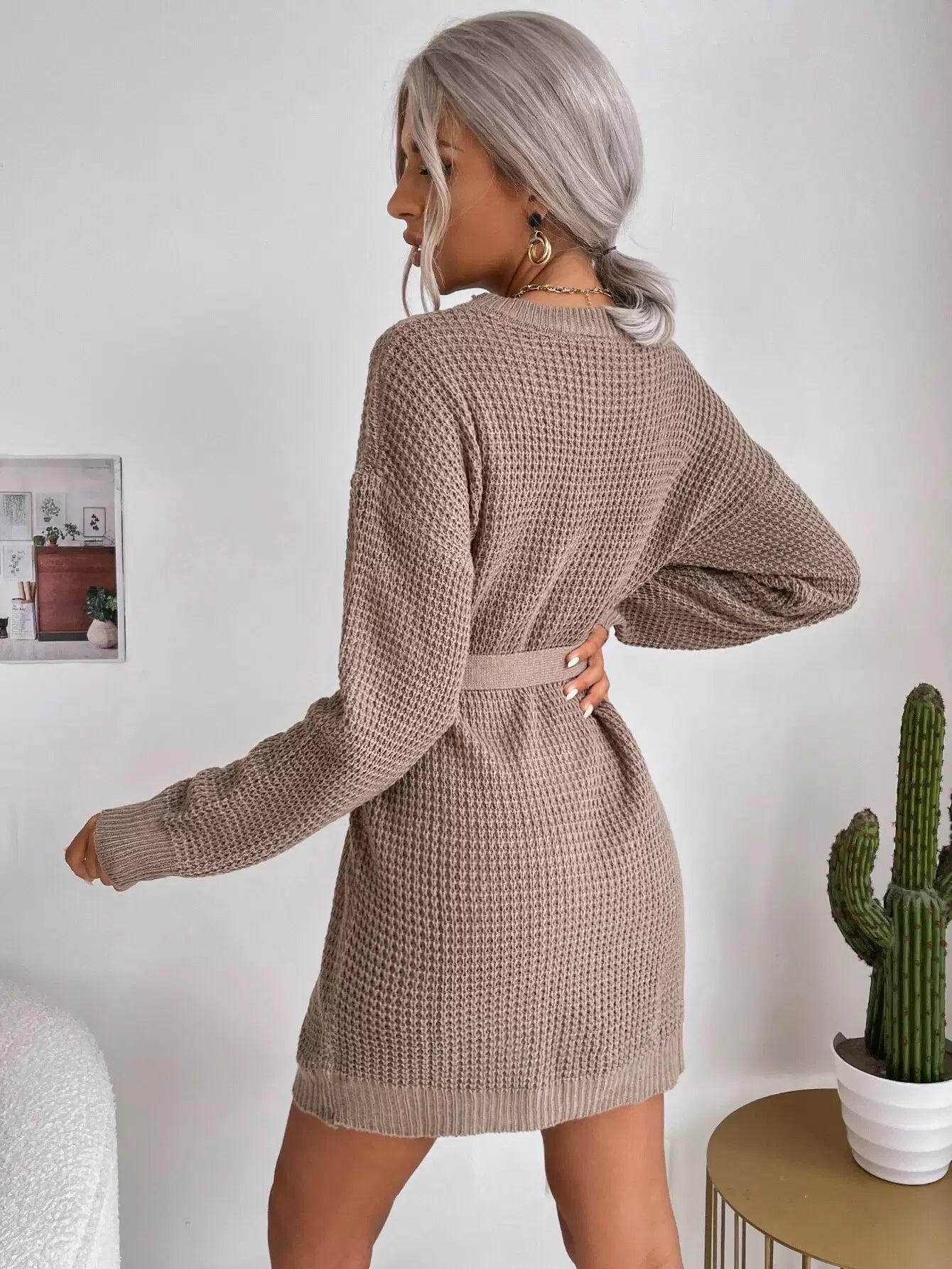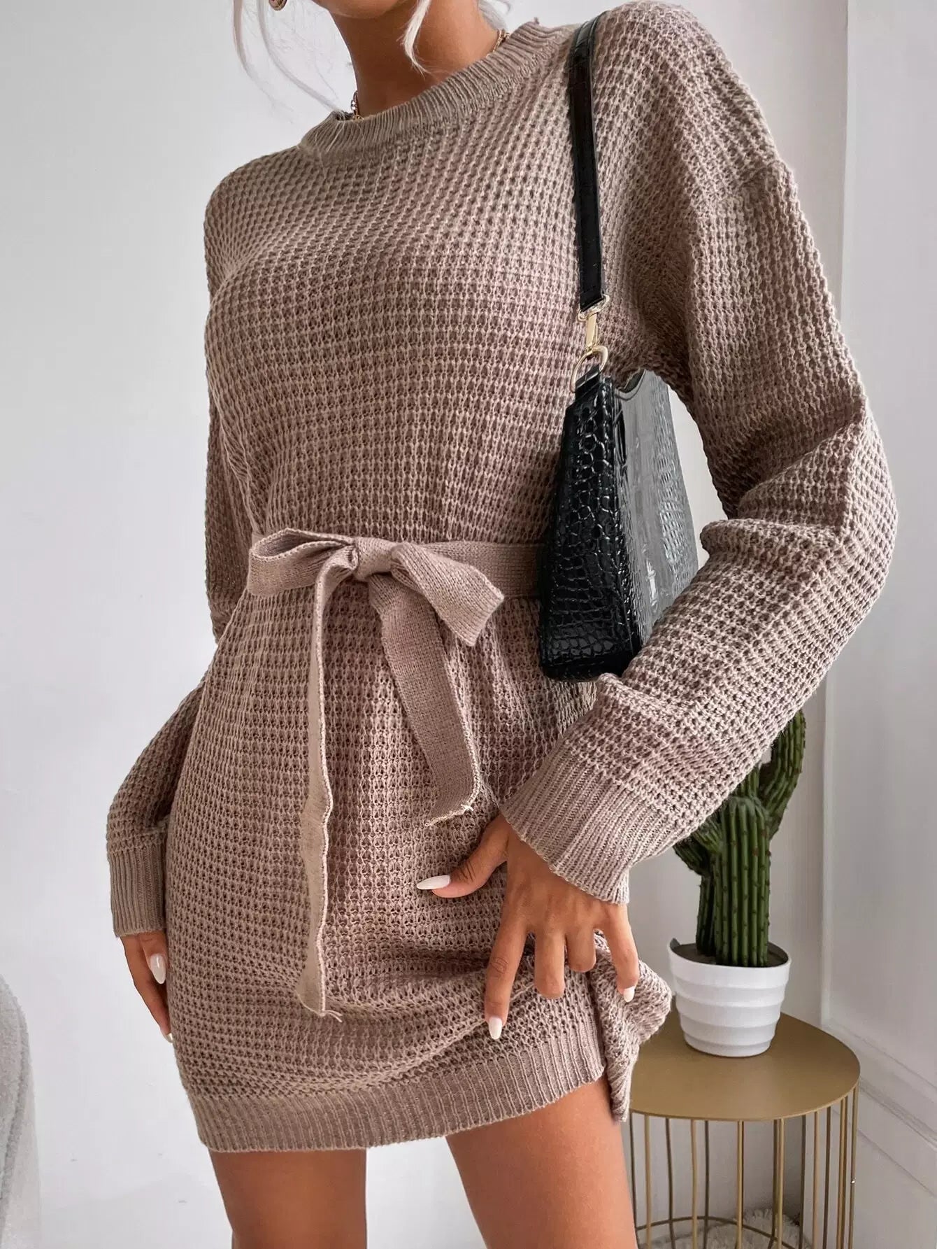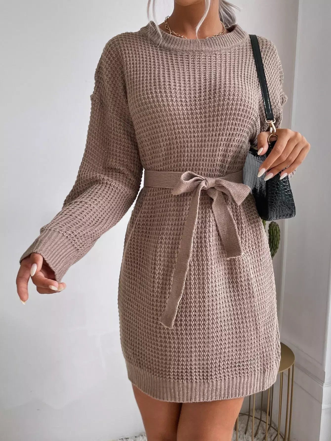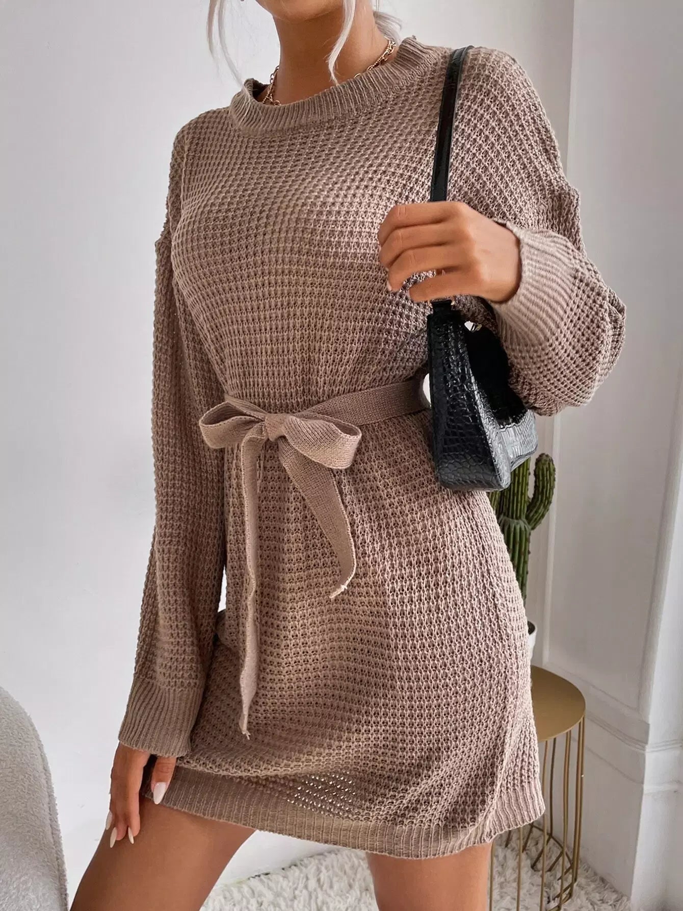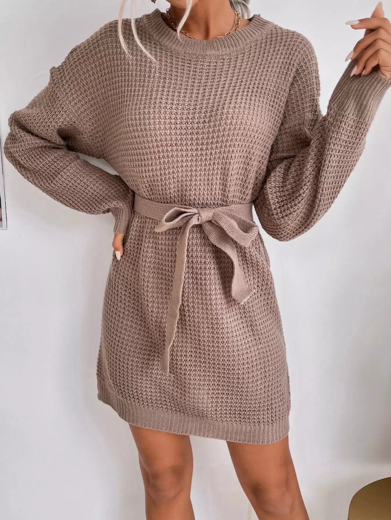 فستان سترة منسوج بكتف منسدل بدون حزام