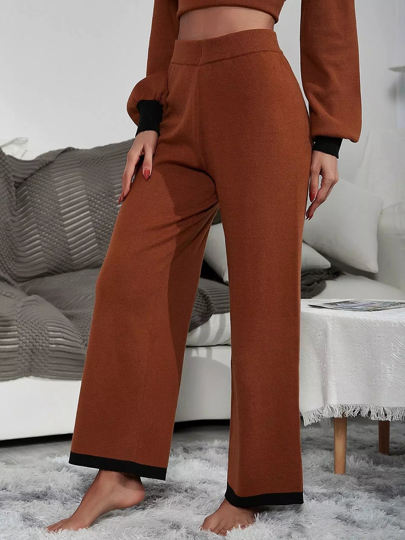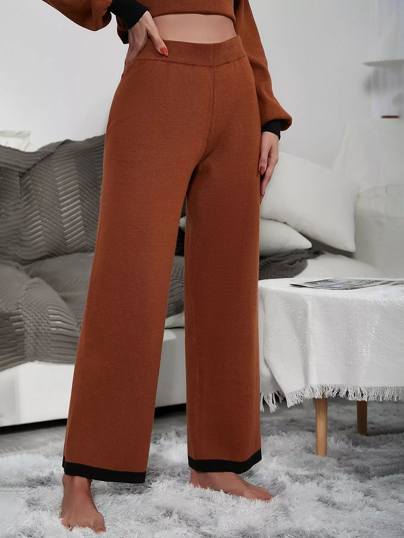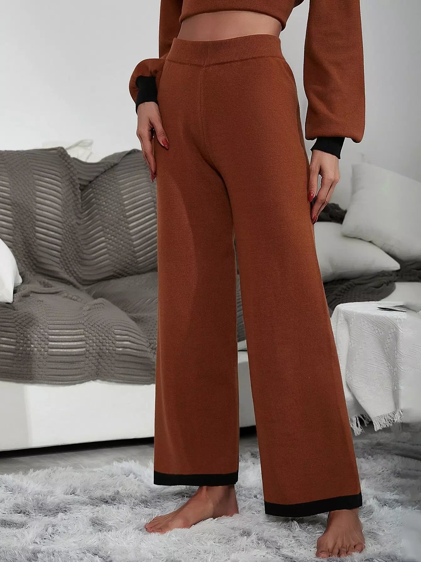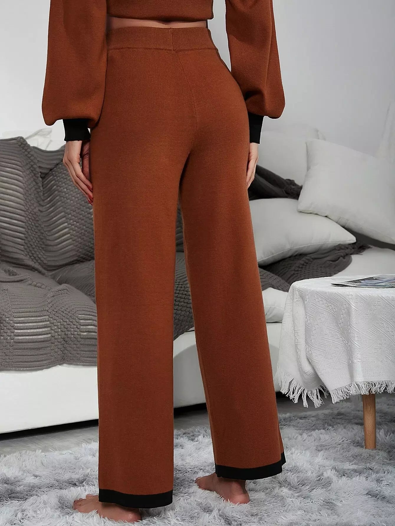بنطلون محبوك ذو خصر عالٍ بلون مغاير بلون مغاير وساق واسعة