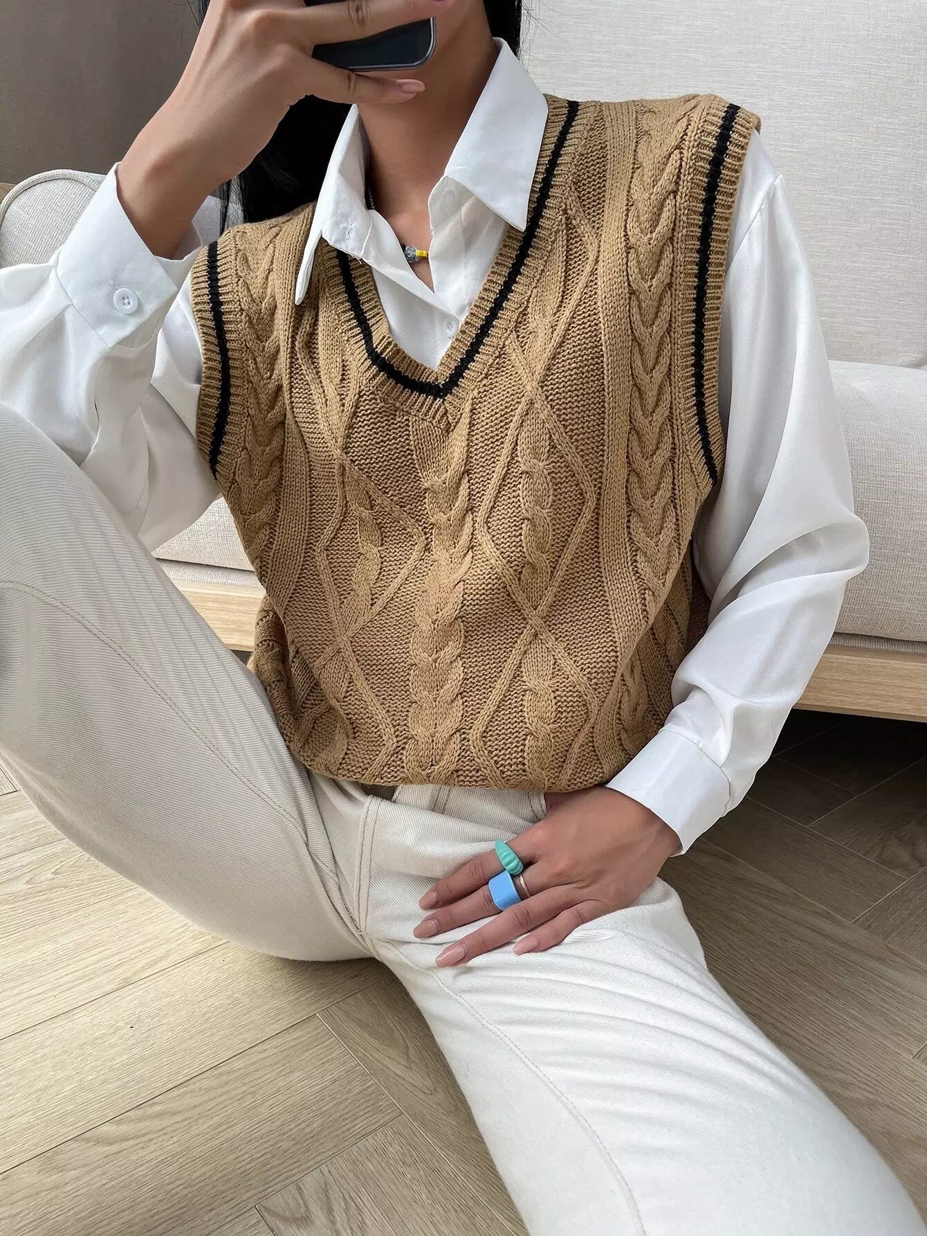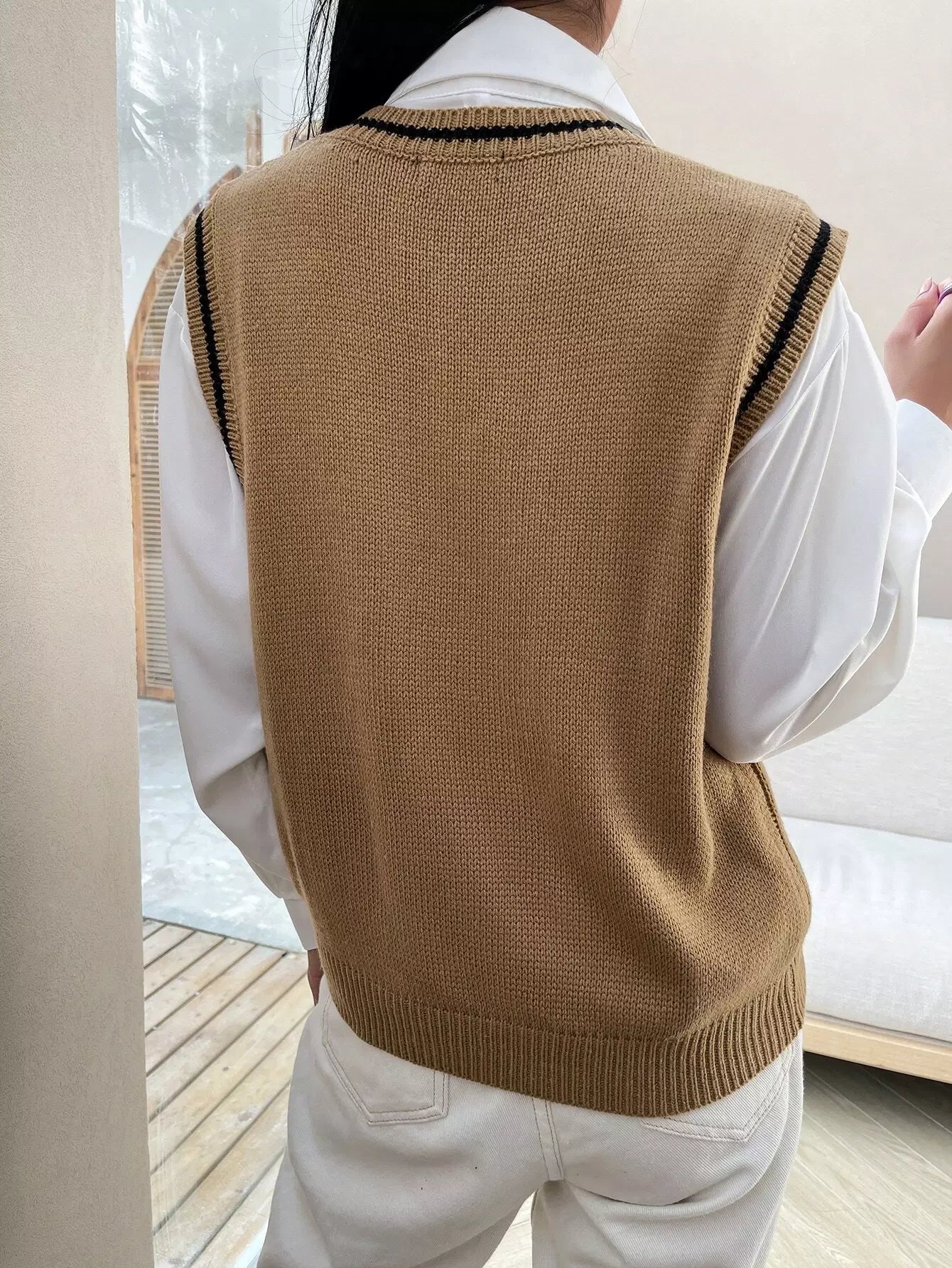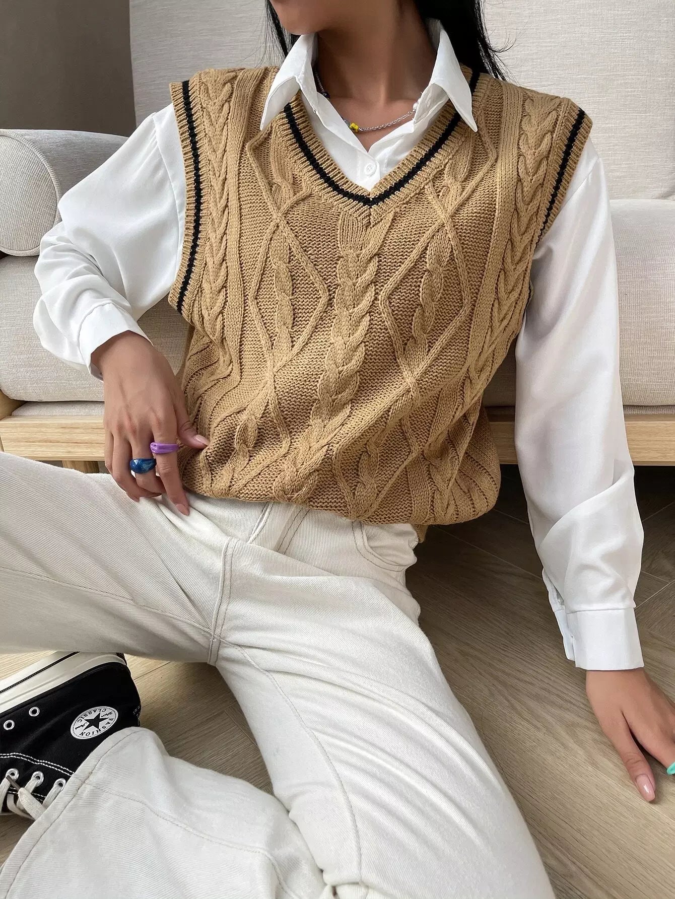 سترة كنزة بحياكة كبلية مخططة بدون بلوزة