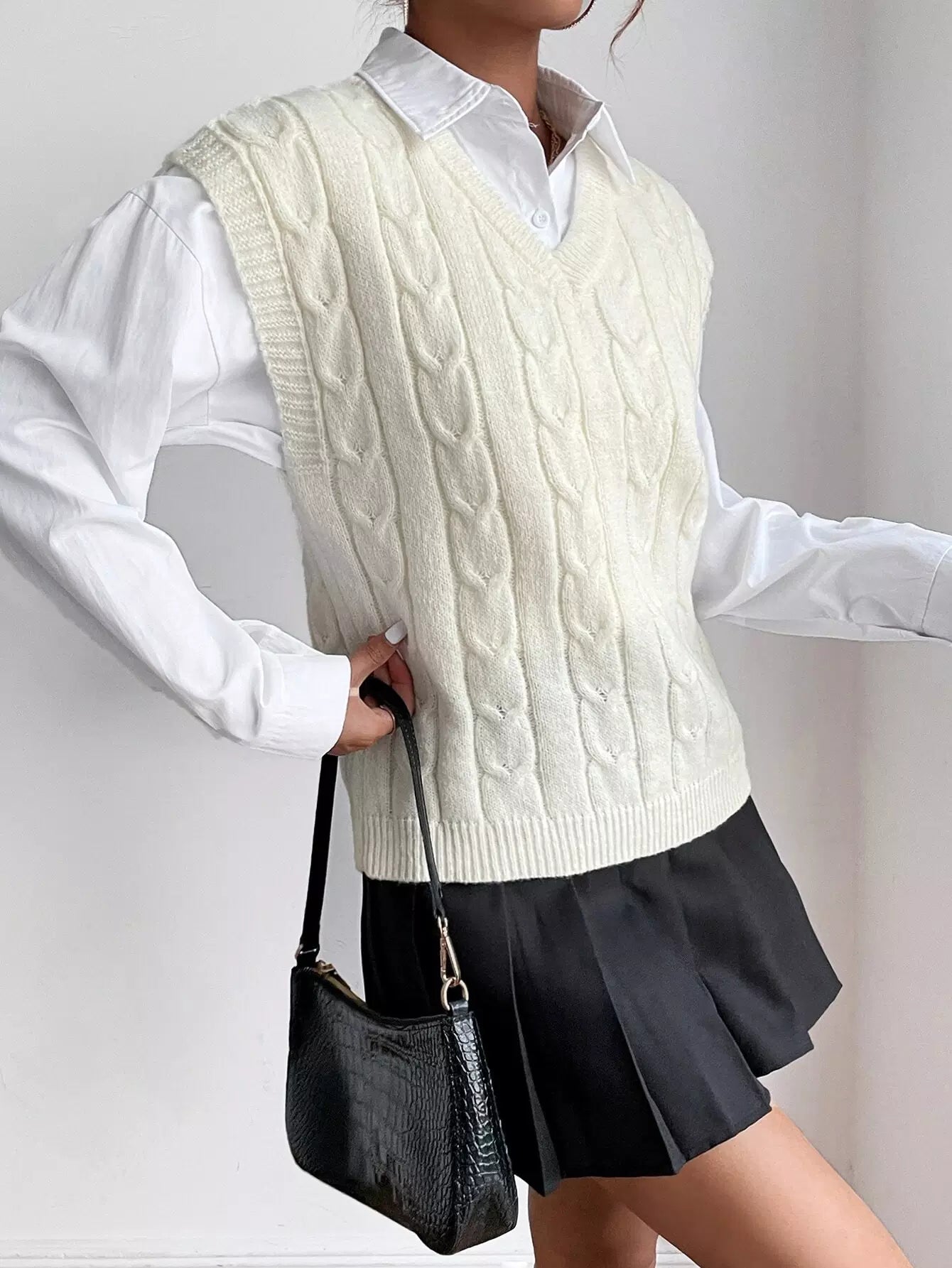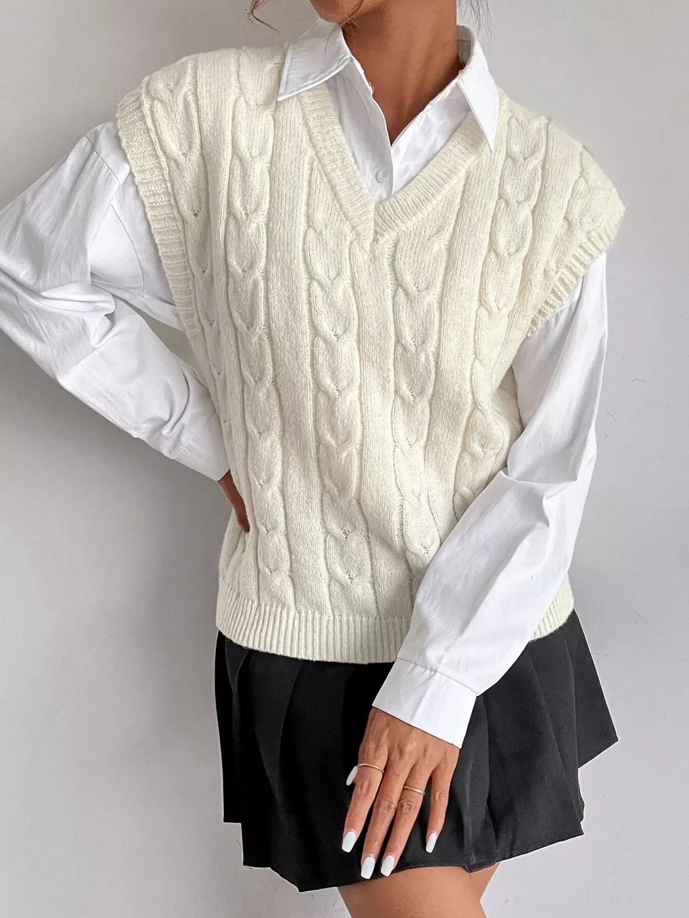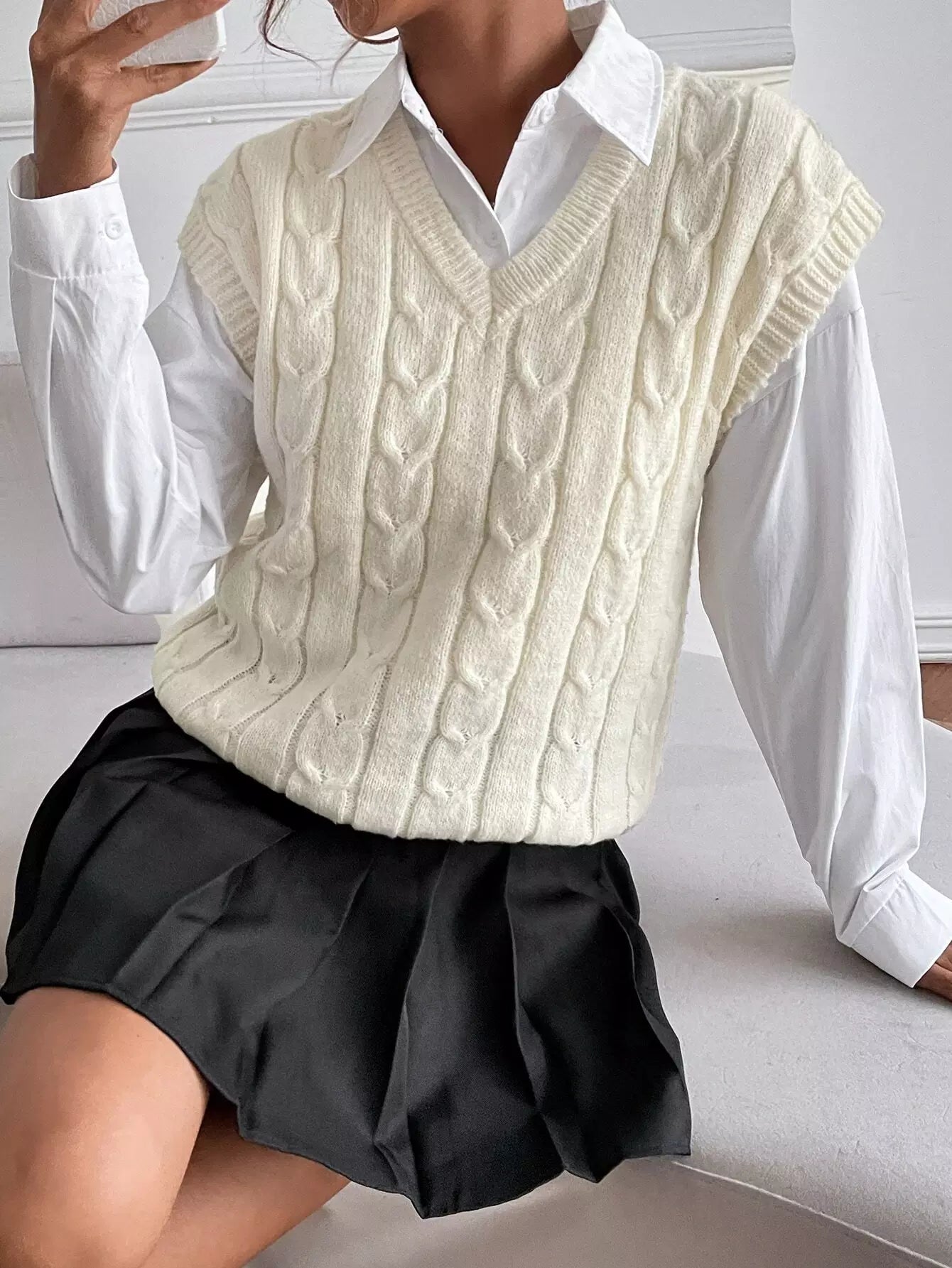 سترة كنزة صوفية محبوكة بكابلات بدون بلوزة