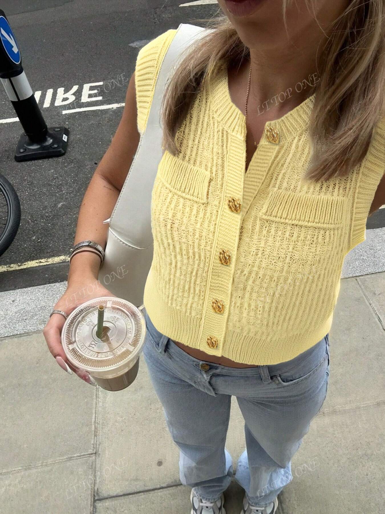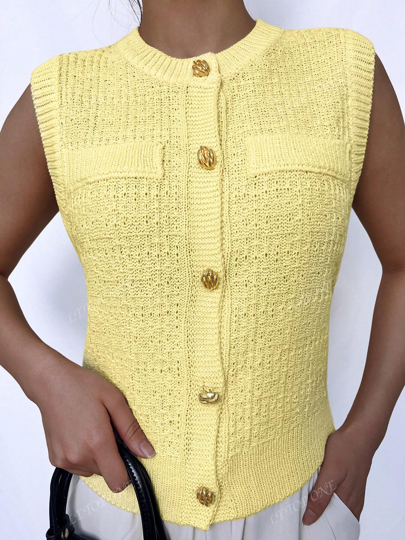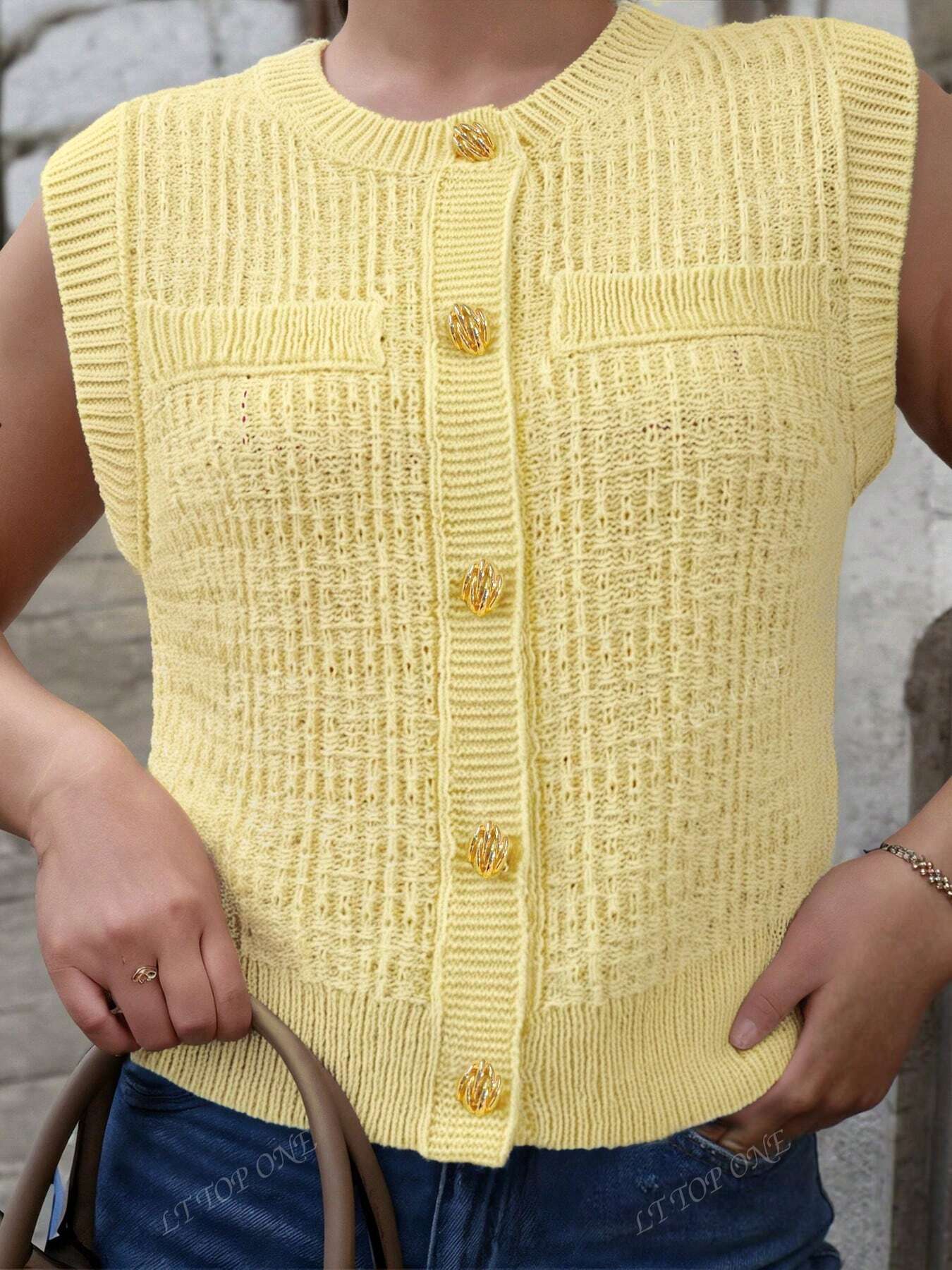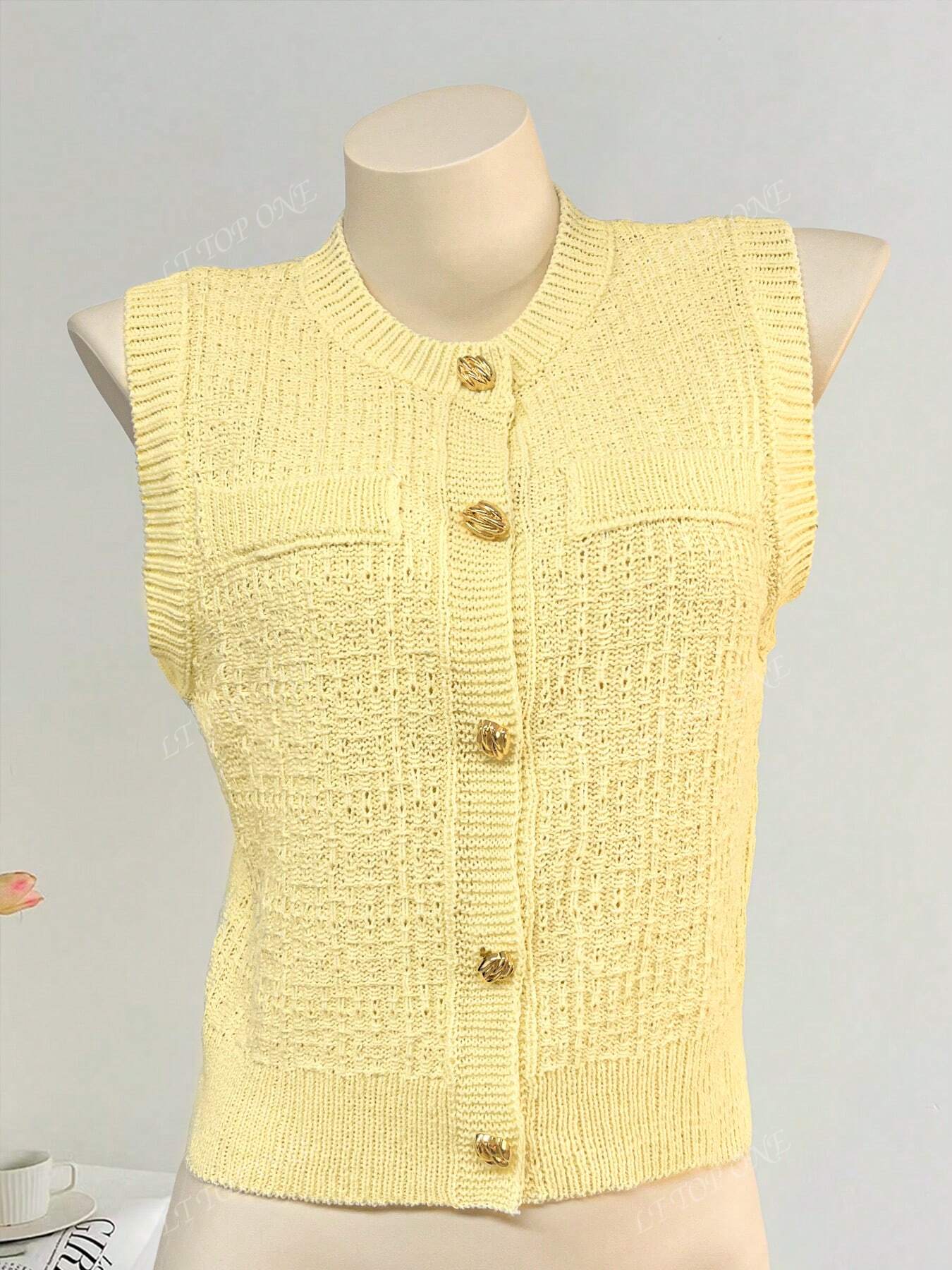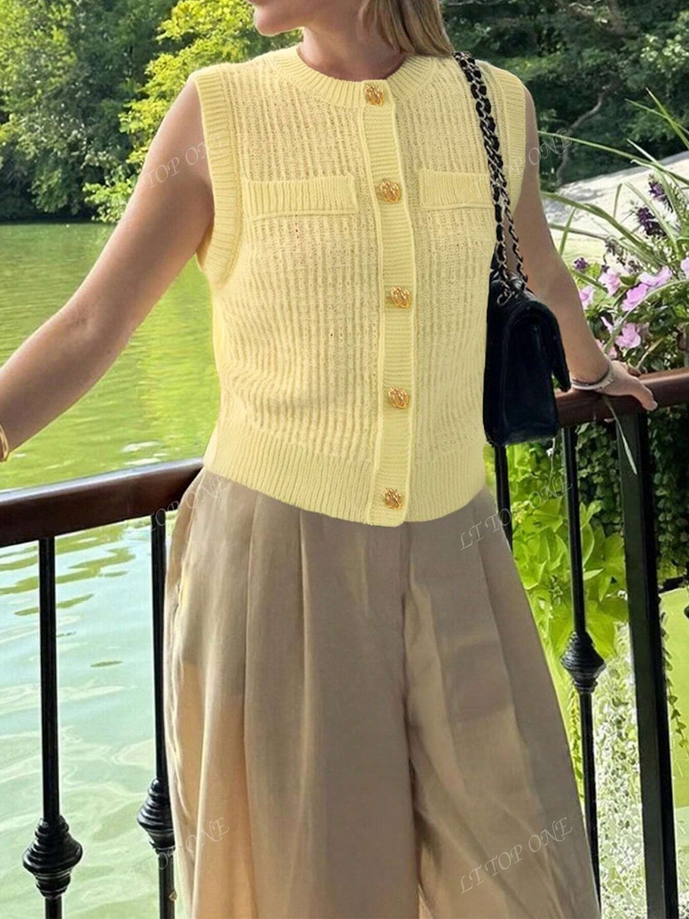 New Women's Summer Casual Butter Yellow Round-Neck Sleeveless Button-Knitted Vest Top, Work/Office