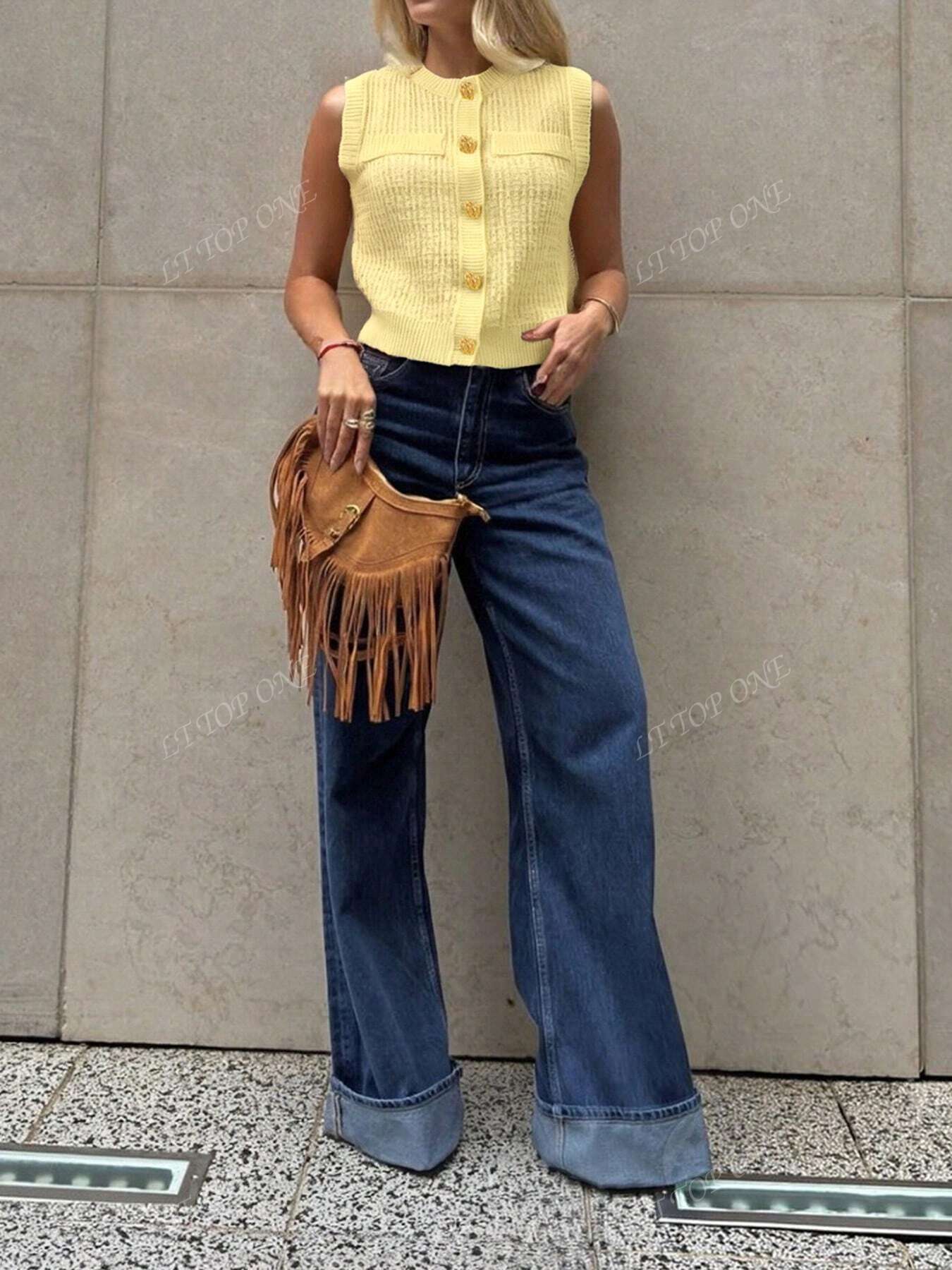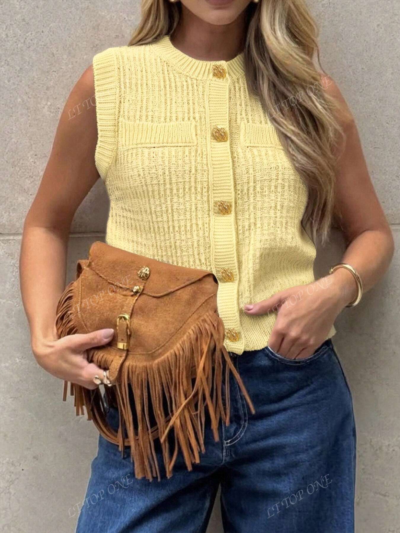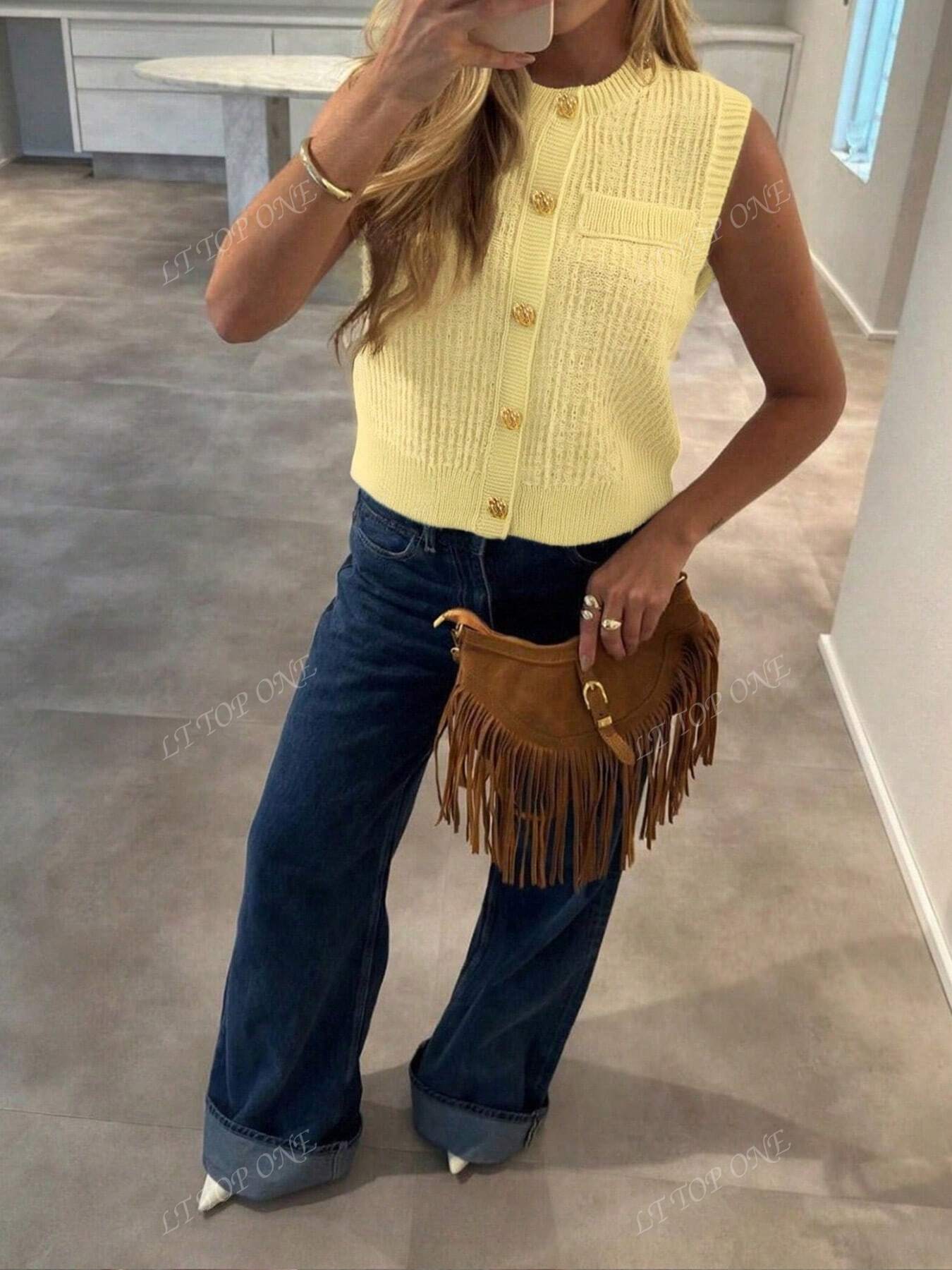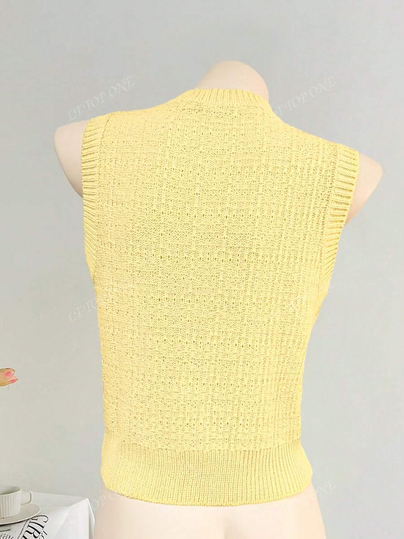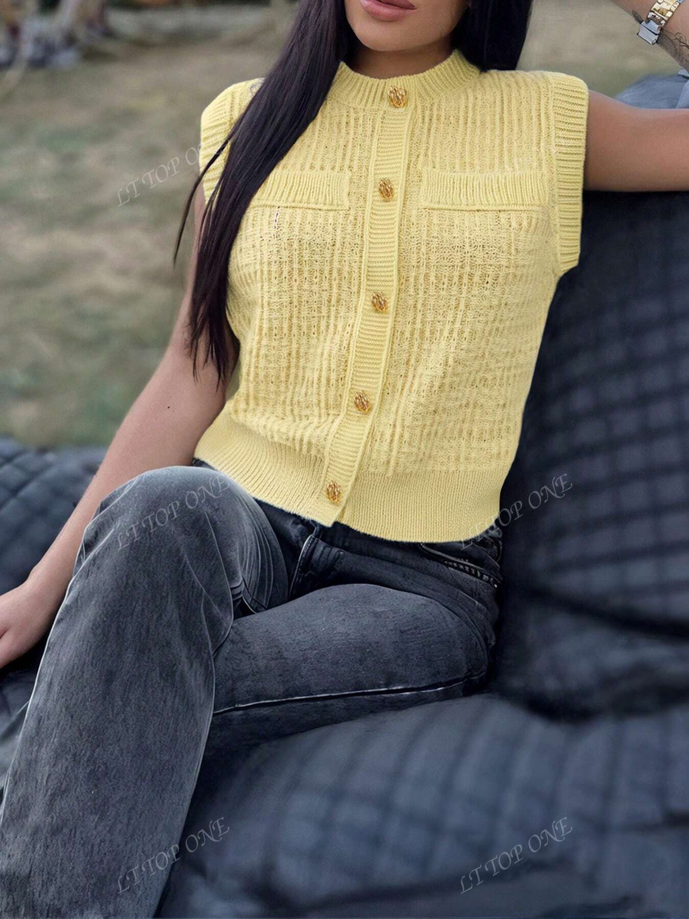 New Women's Summer Casual Butter Yellow Round-Neck Sleeveless Button-Knitted Vest Top, Work/Office