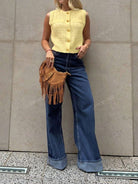 بلوزة صيفية نسائية جديدة غير رسمية باللون الأصفر الزبدة، بدون أكمام، بياقة مستديرة، محبوكة بأزرار، للعمل/المكتب