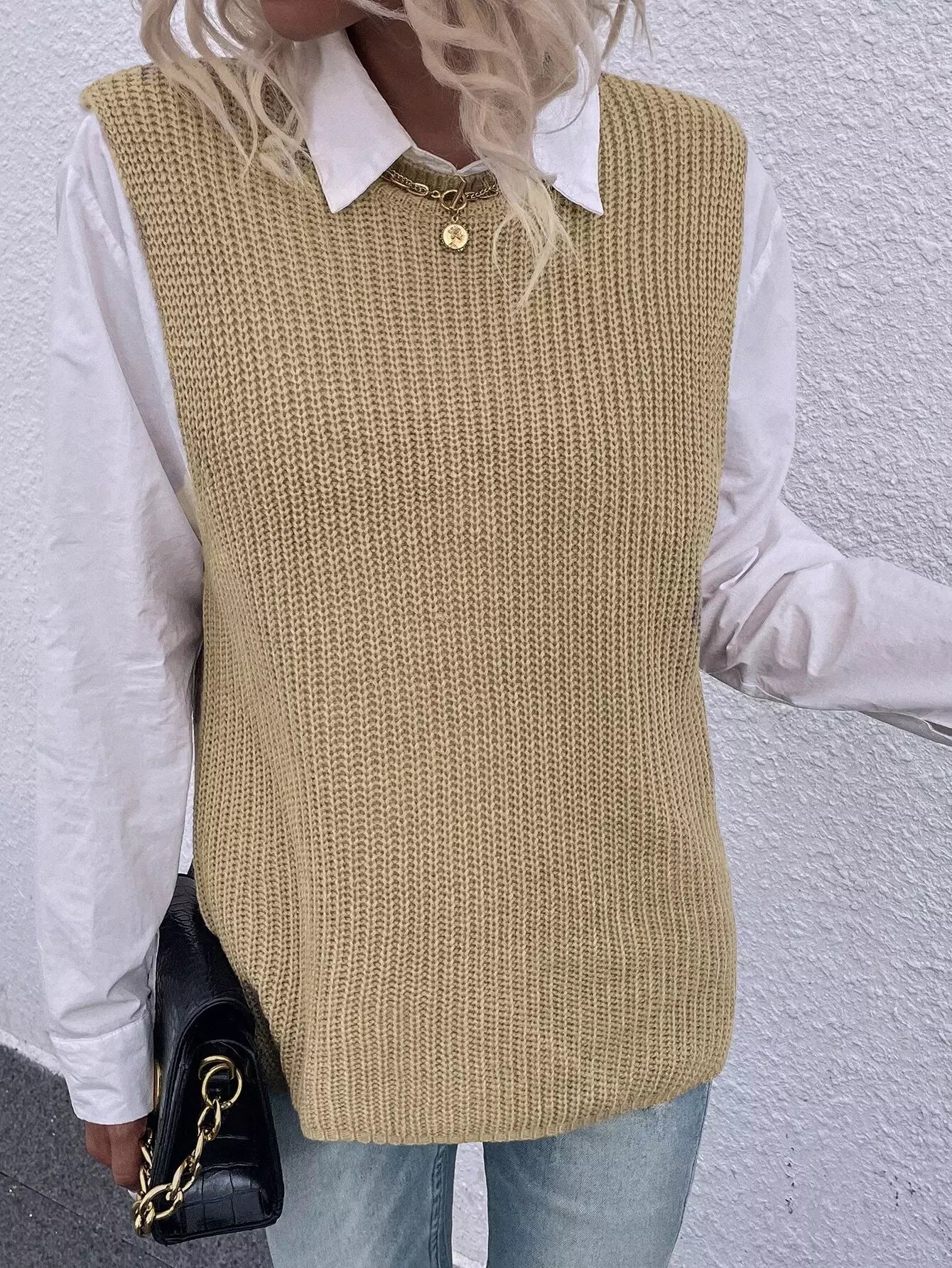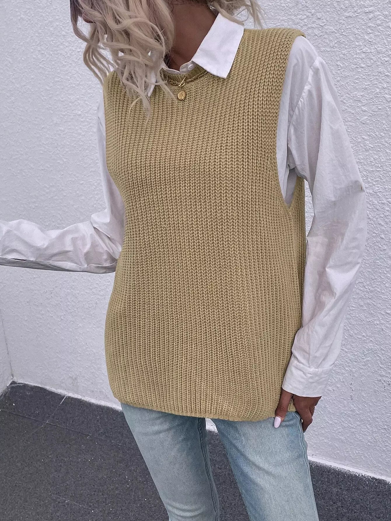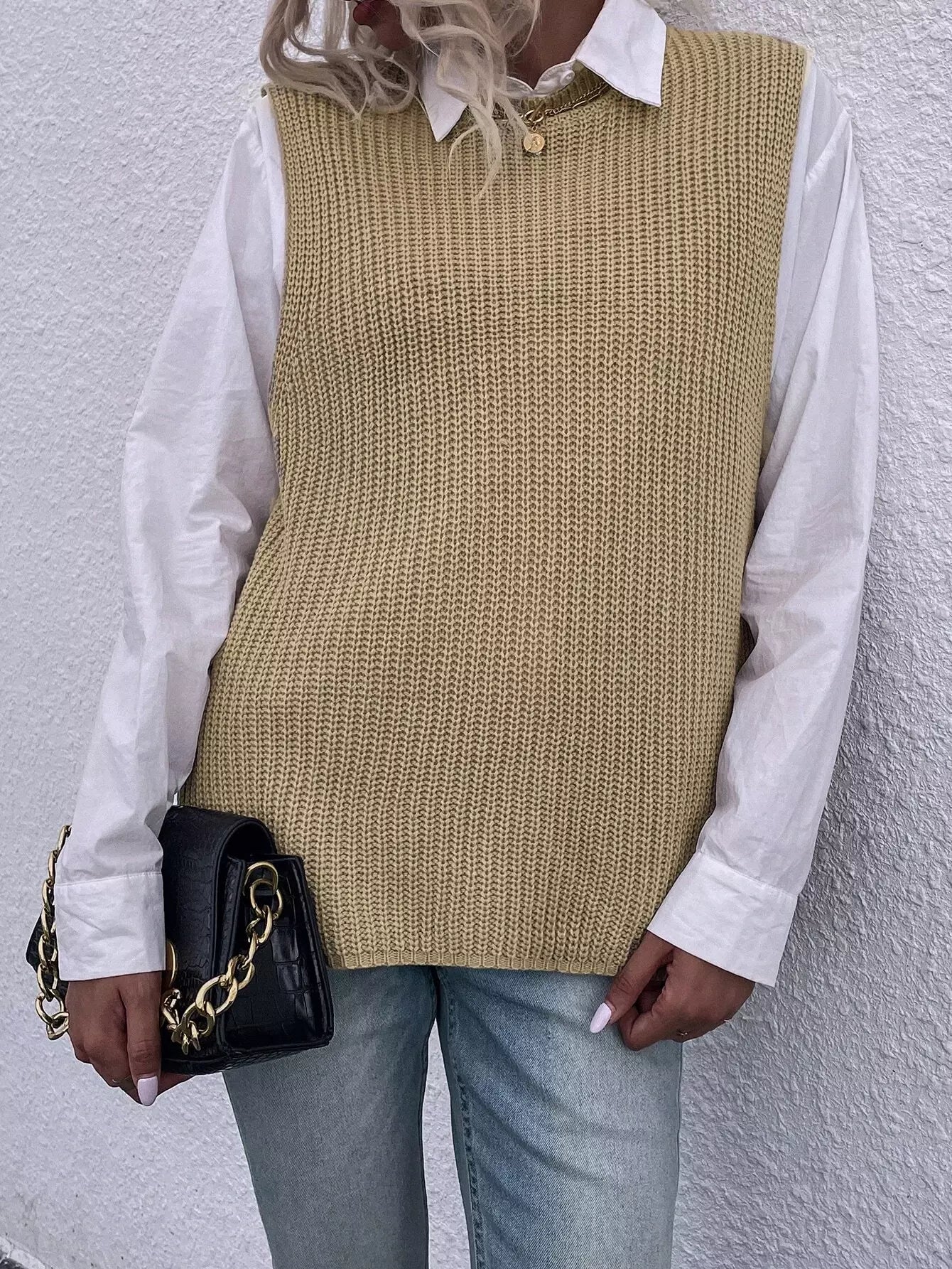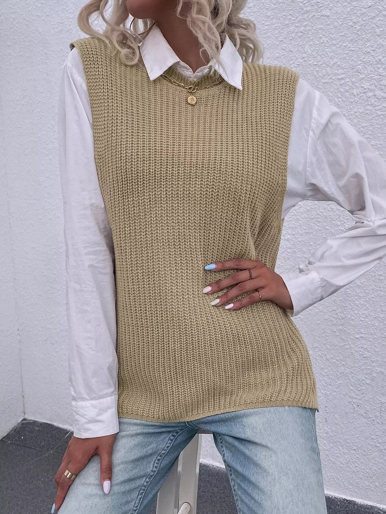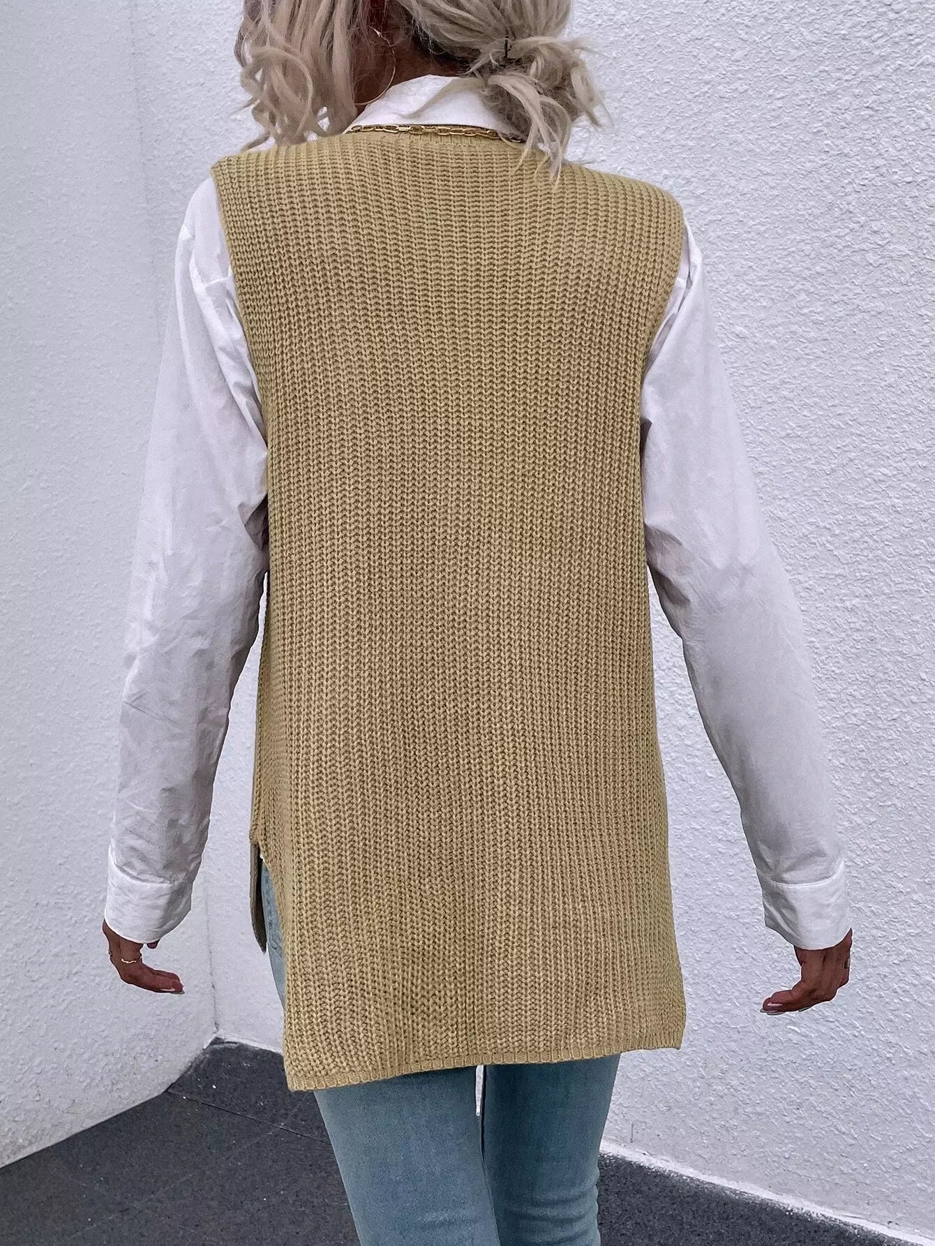 سترة كنزة صوفية مضلعة محبوكة منقسمة الحواف بدون بلوزة