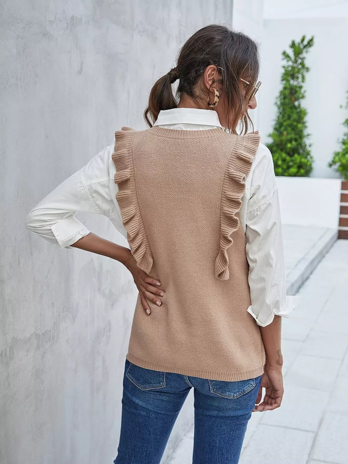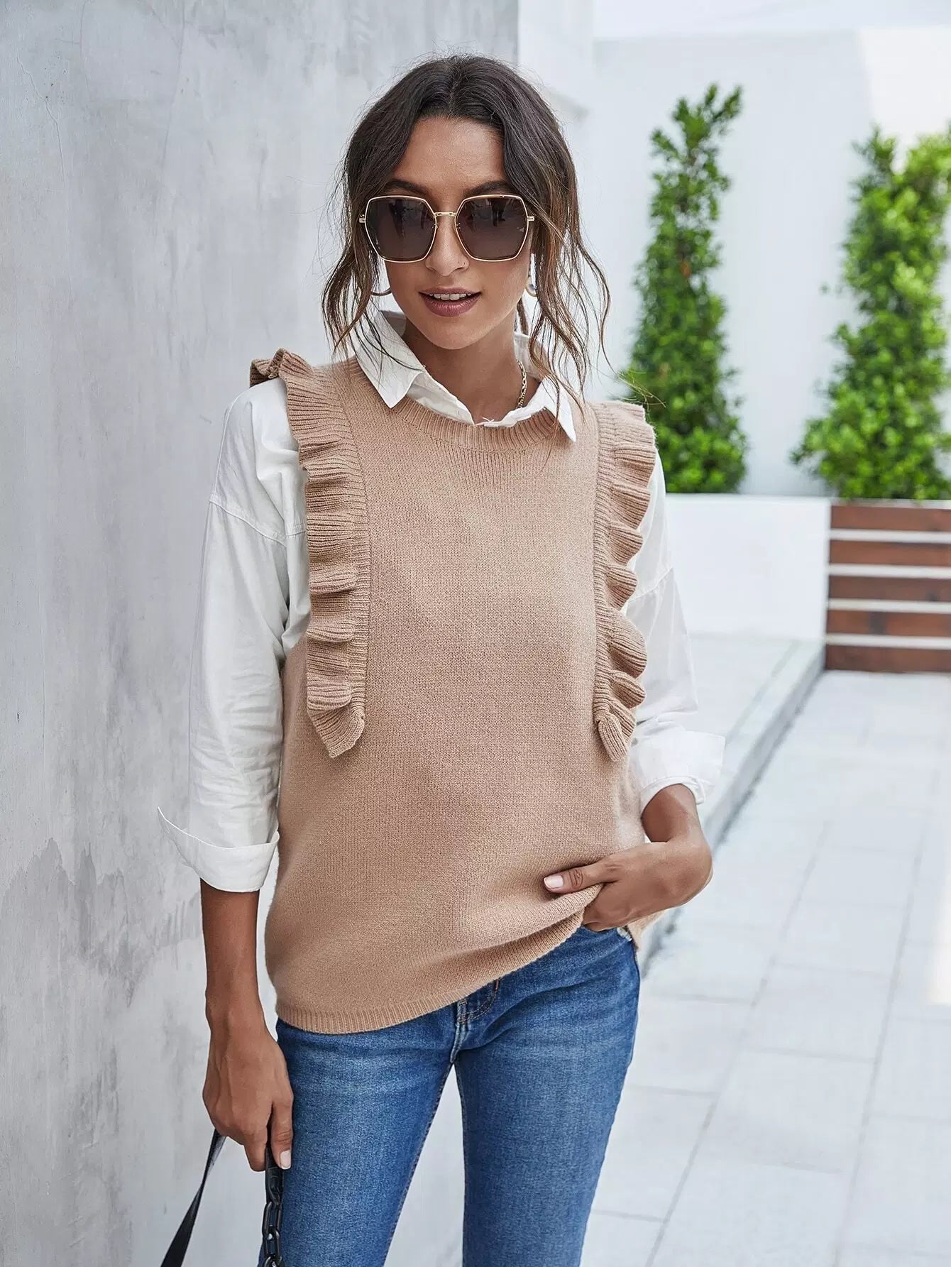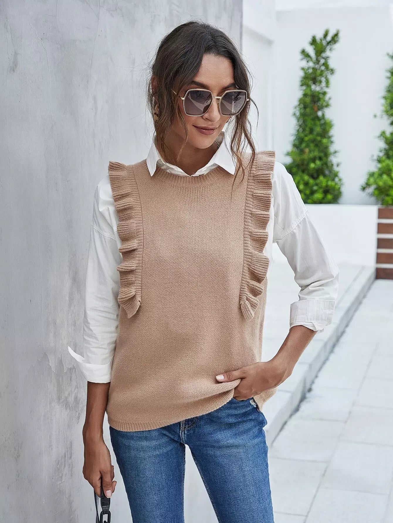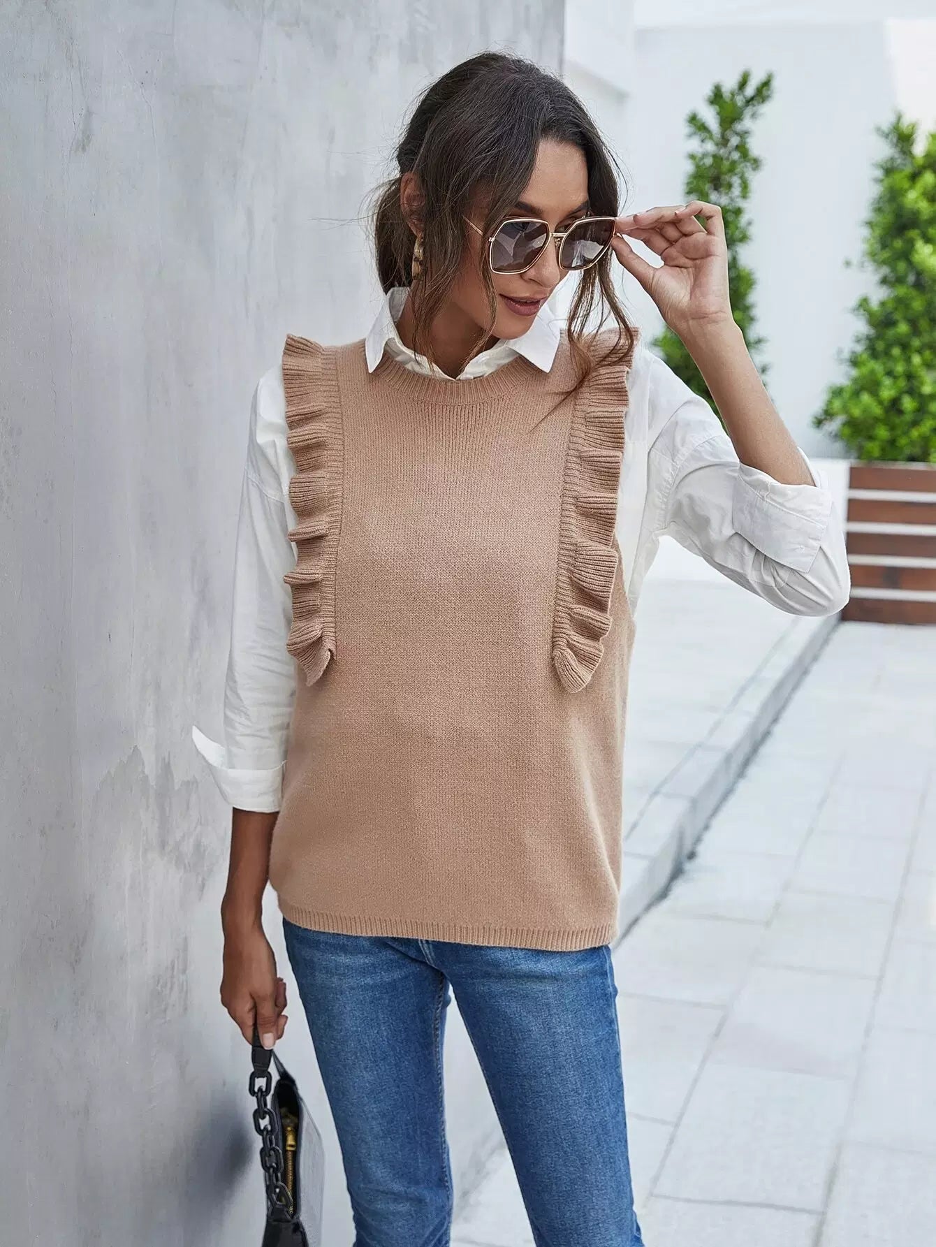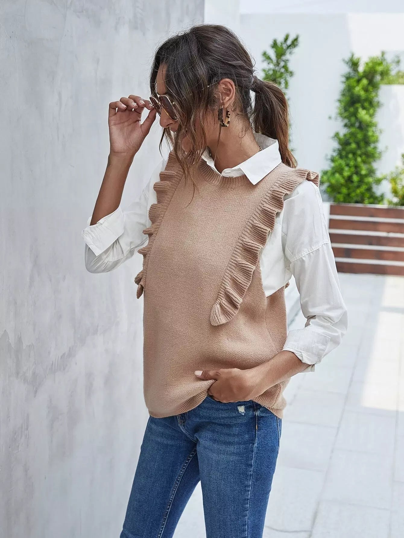 النساء - بلوزة محبوكة بحواف مكشكشة صلبة