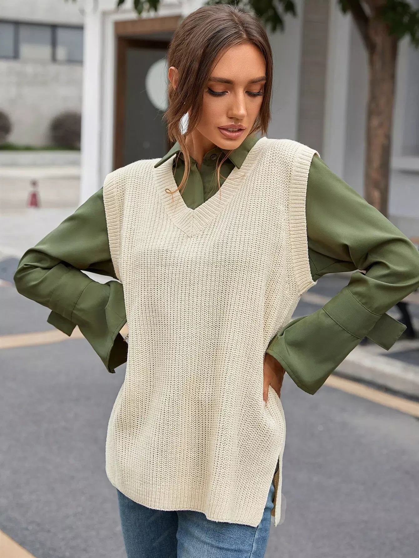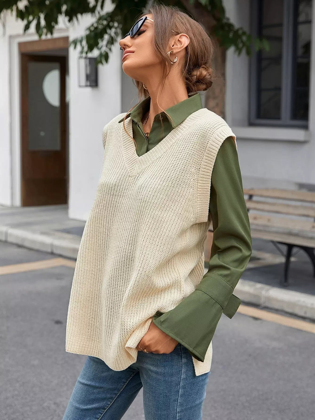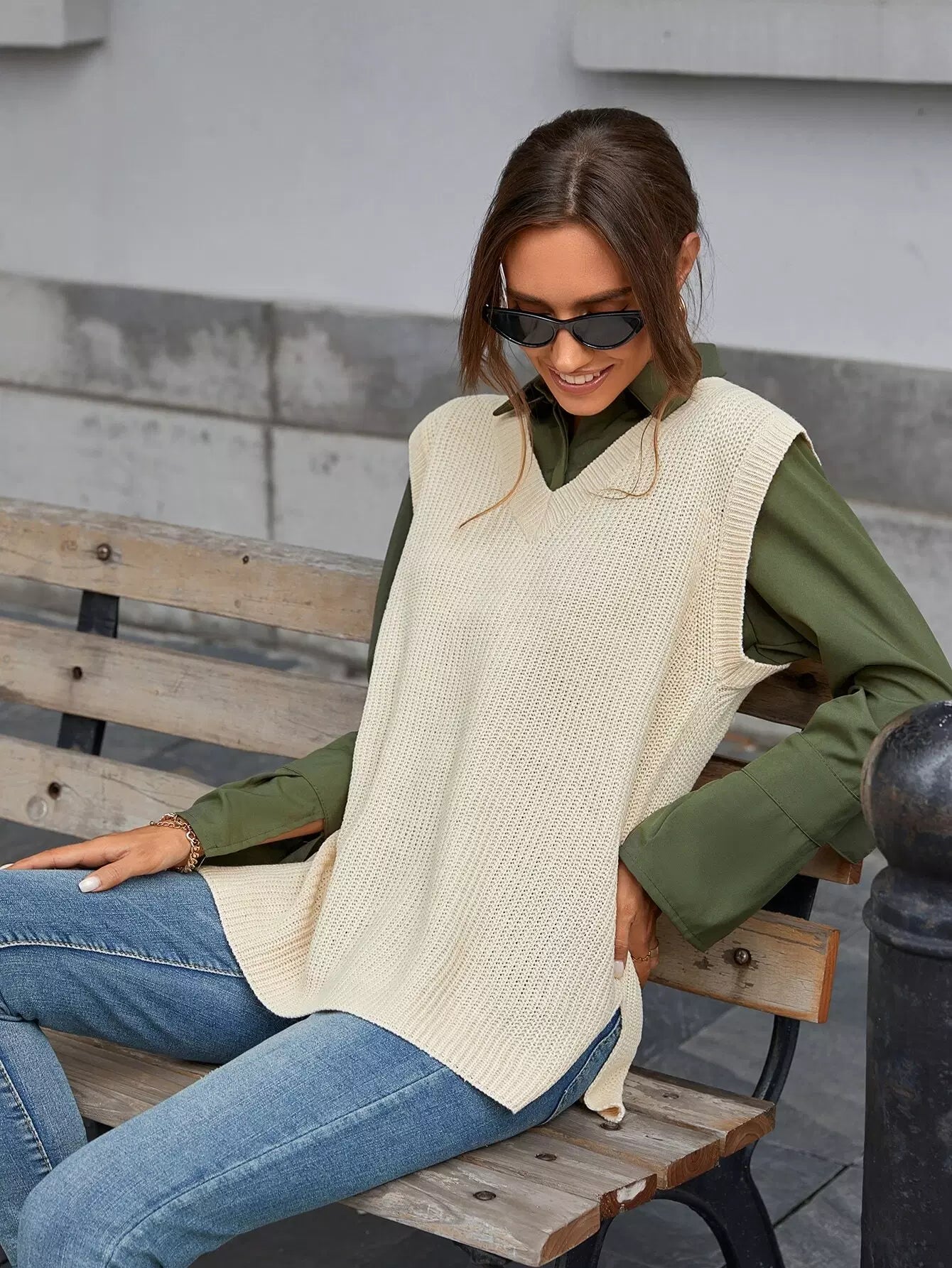 سترة صوفية محبوكة من الوافل بدون بلوزة