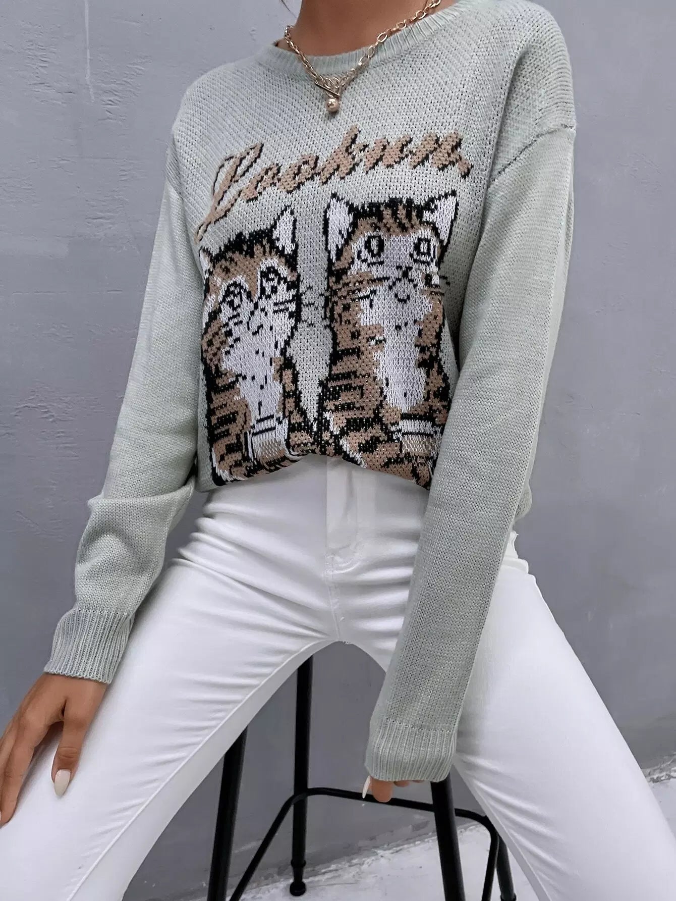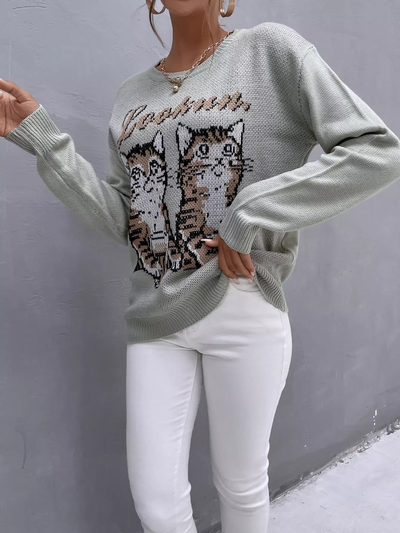 كنزة منسدلة الكتف بنقشة قطة وحروف