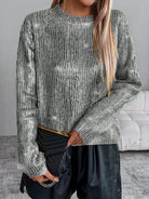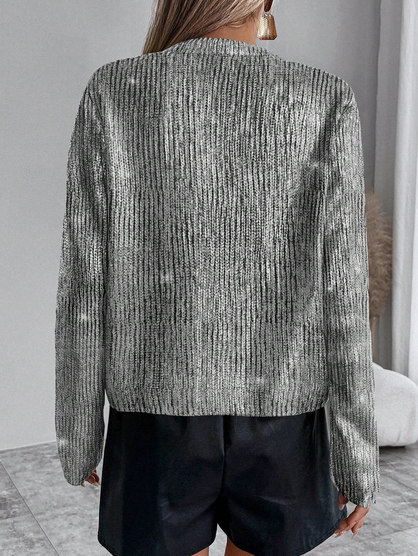 سترة نسائية كاجوال فضفاضة بياقة دائرية وأكمام طويلة مع طباعة معدنية، بلوفر محبوك لفصل الخريف/الشتاء