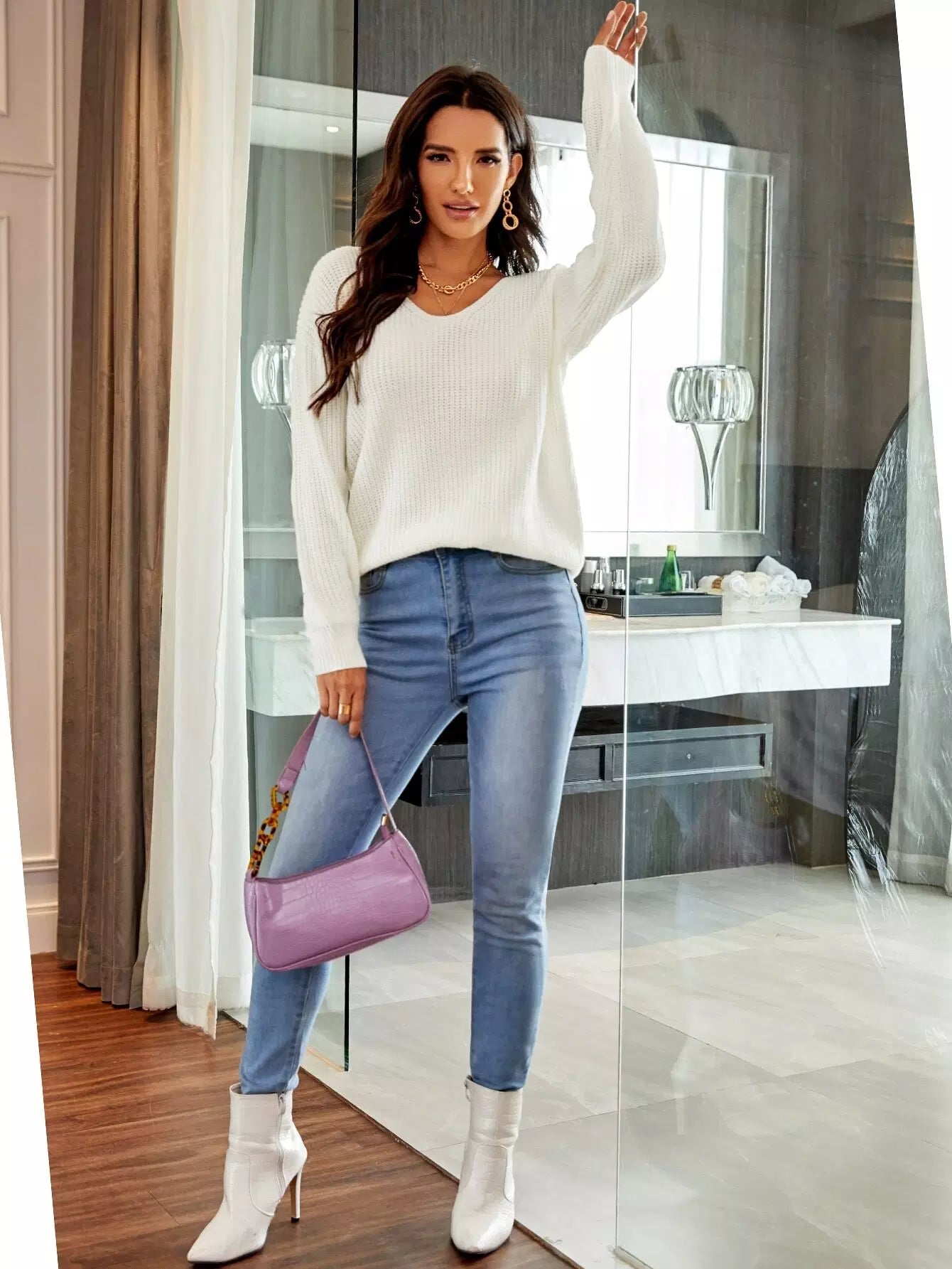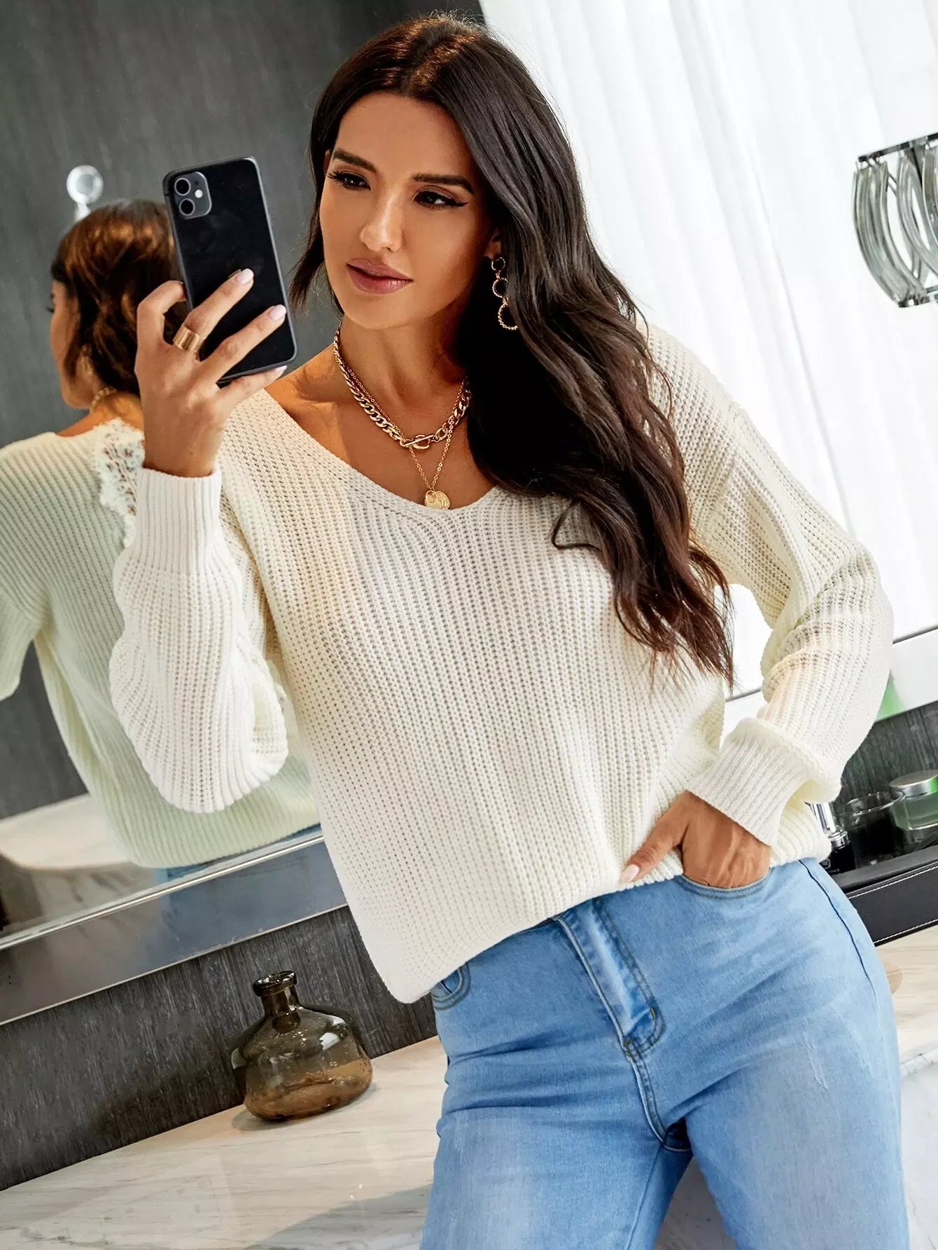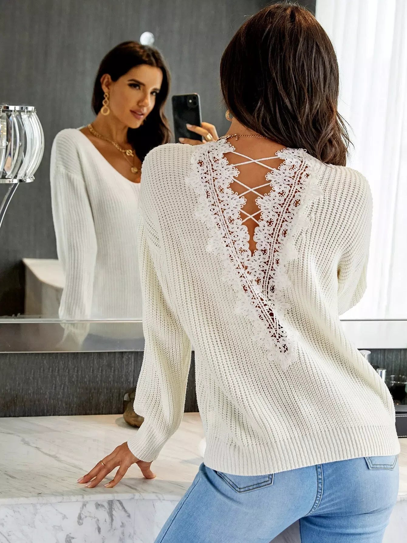 سترة محبوكة من الدانتيل بلون مغاير من الخلف بحياكة ضلع مضلع