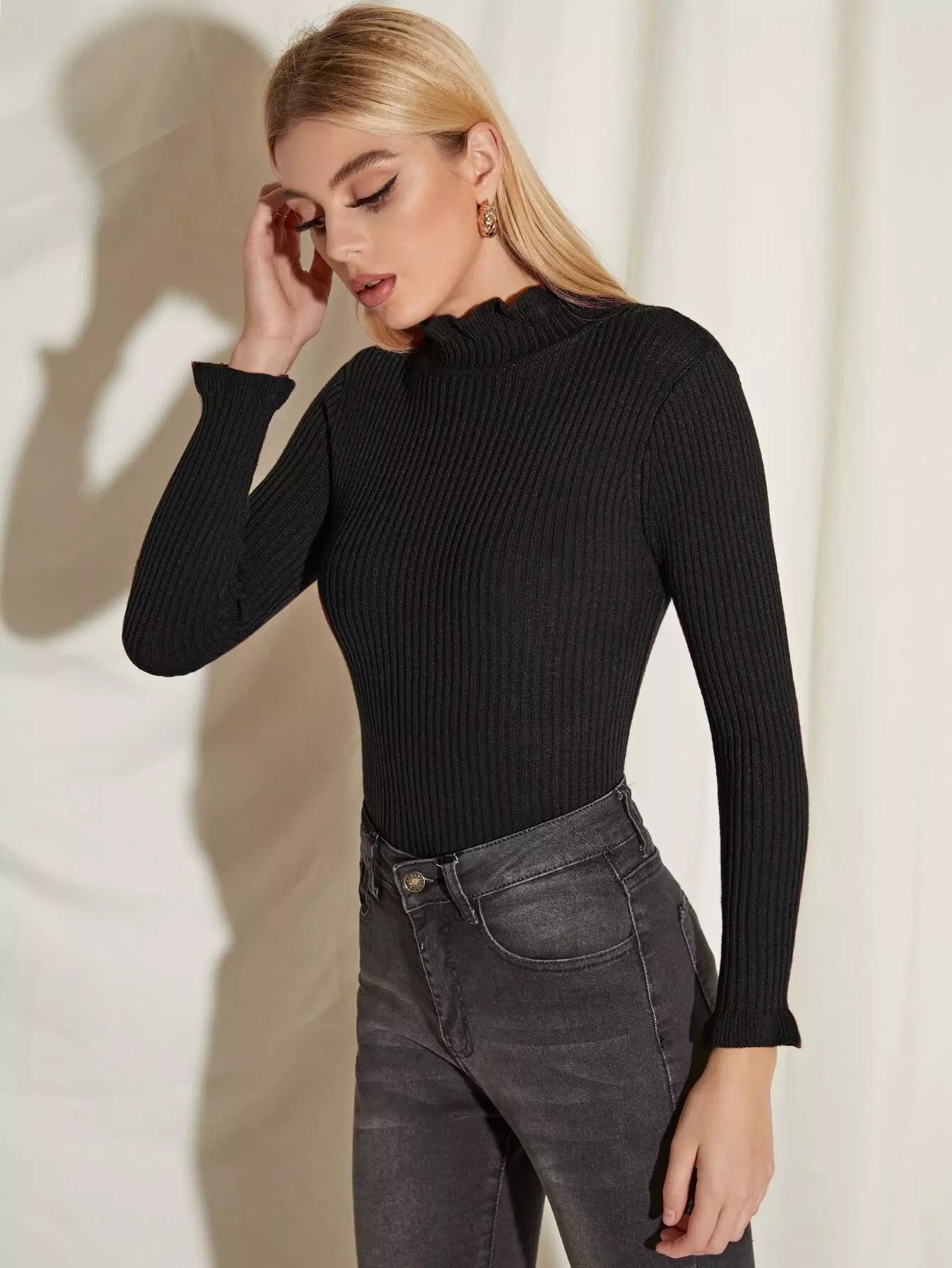 كنزة بياقة كشكش برقبة جورب محبوكة على شكل ضلع