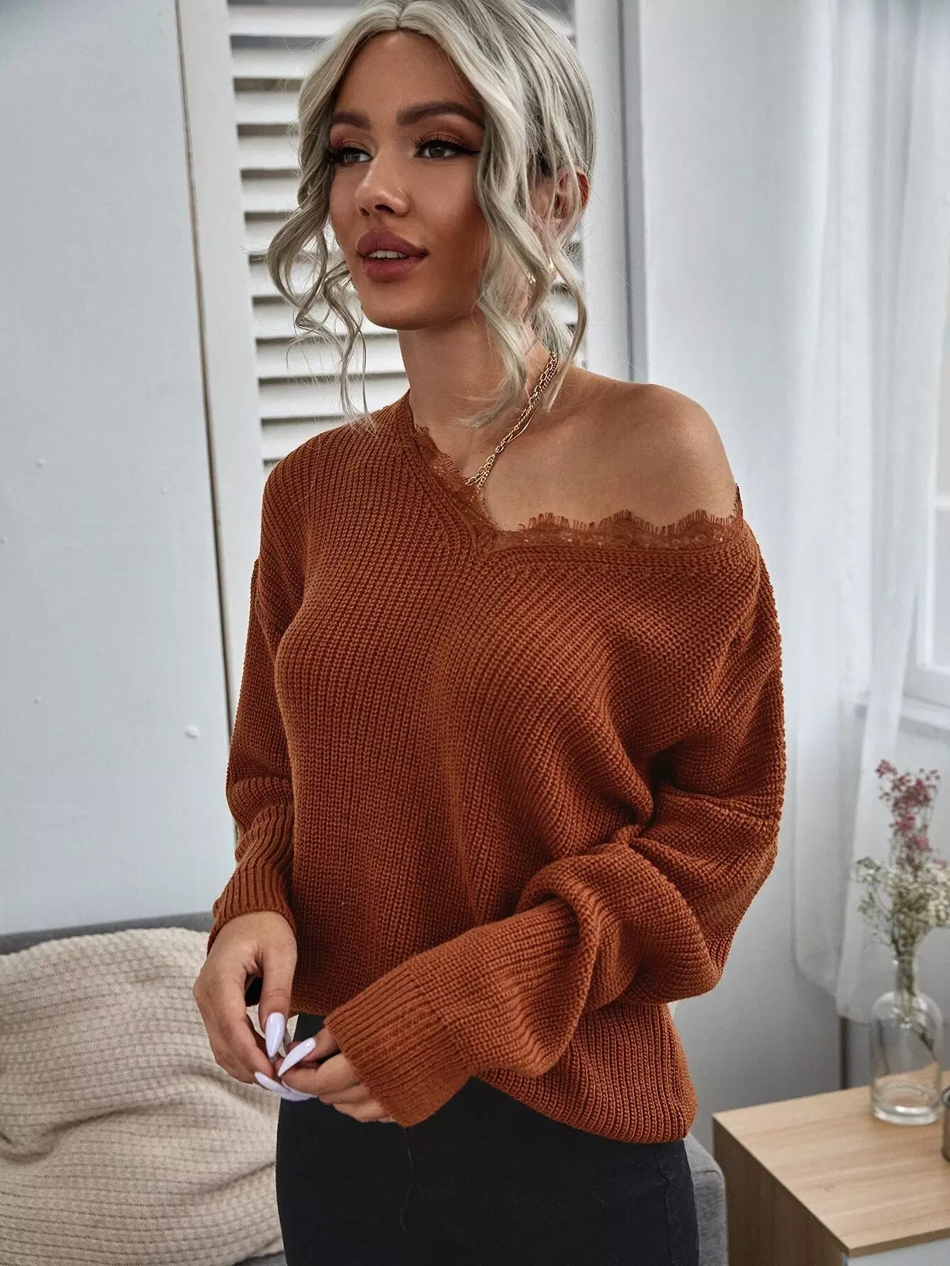 سترة منسدلة الكتفين بحواف من الدانتيل محبوكة منسدلة الكتفين
