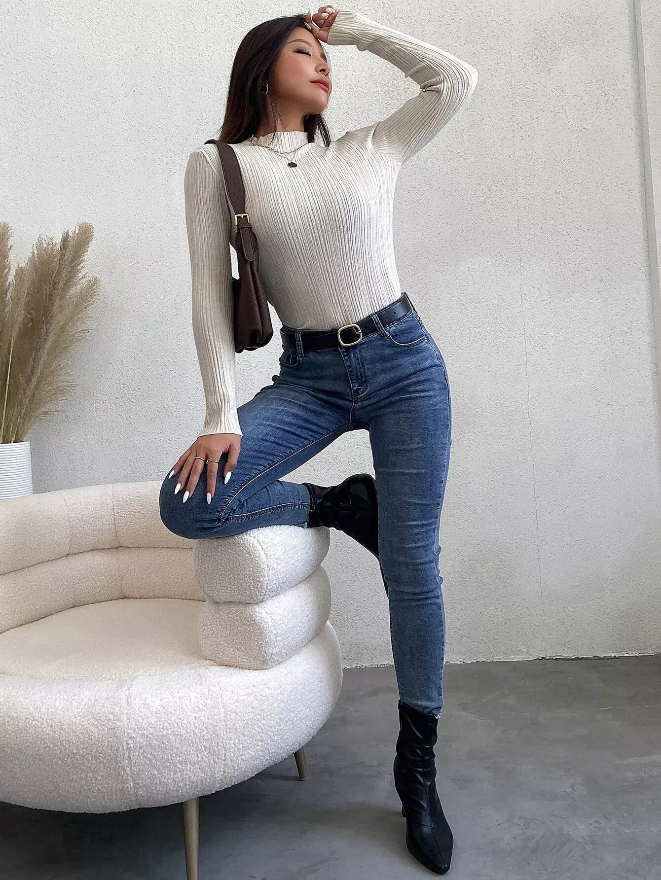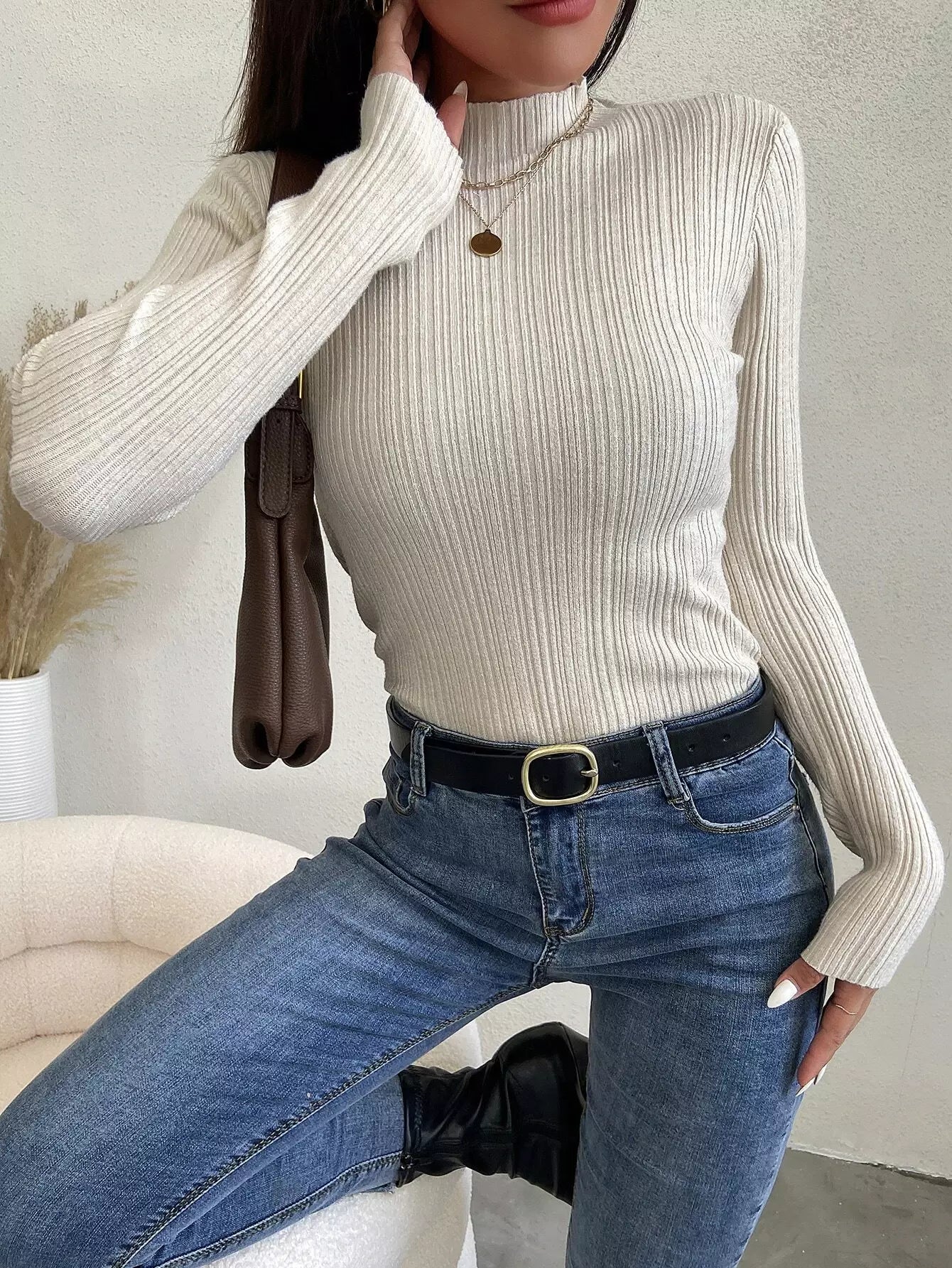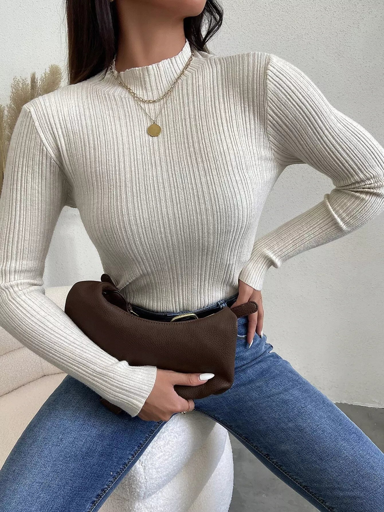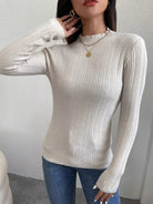 كنزة صوفية برقبة ضلعية مضلعة متماسكة
