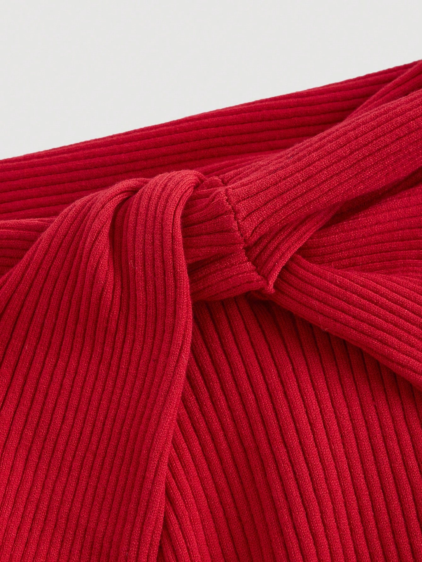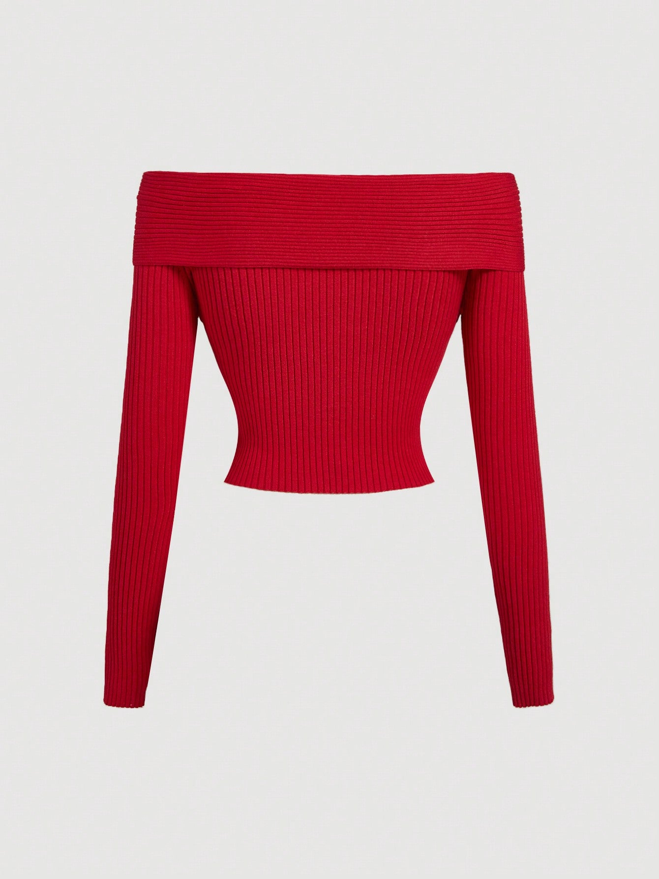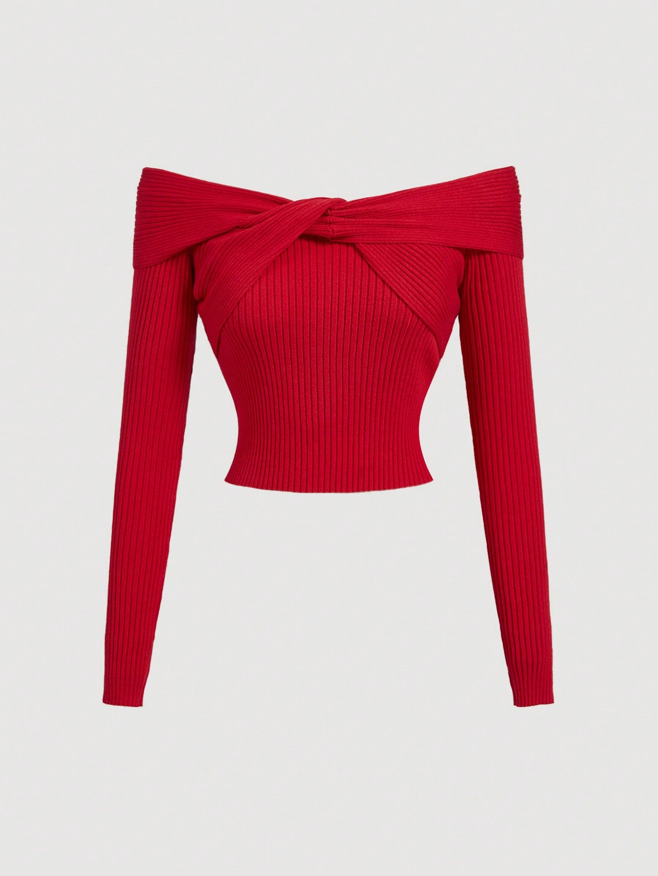MOD Red Off-The-Shoulder Crossover Twist Long Sleeve Sweater,Homecoming Tops,Airport Women Outfits,Halloween