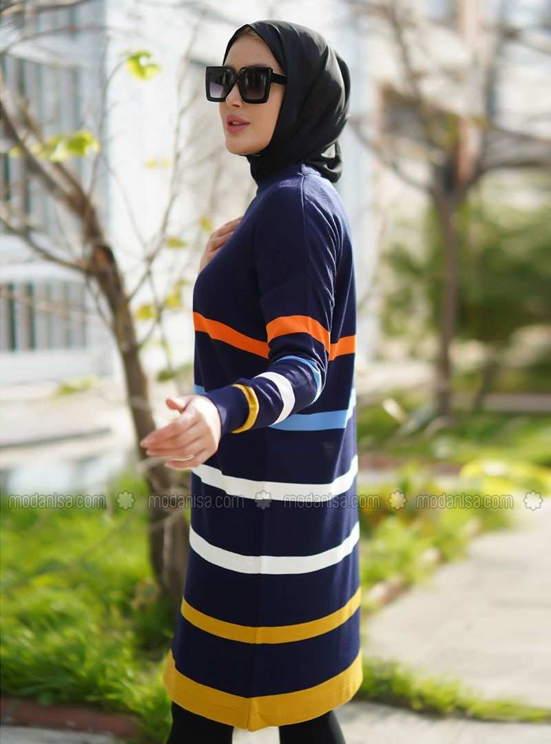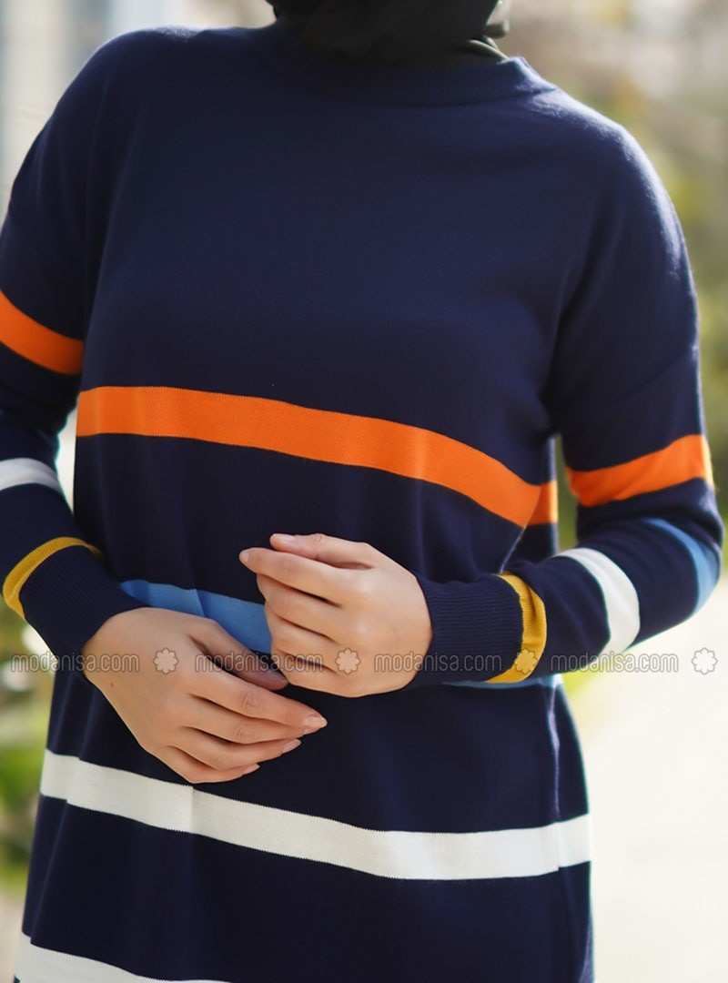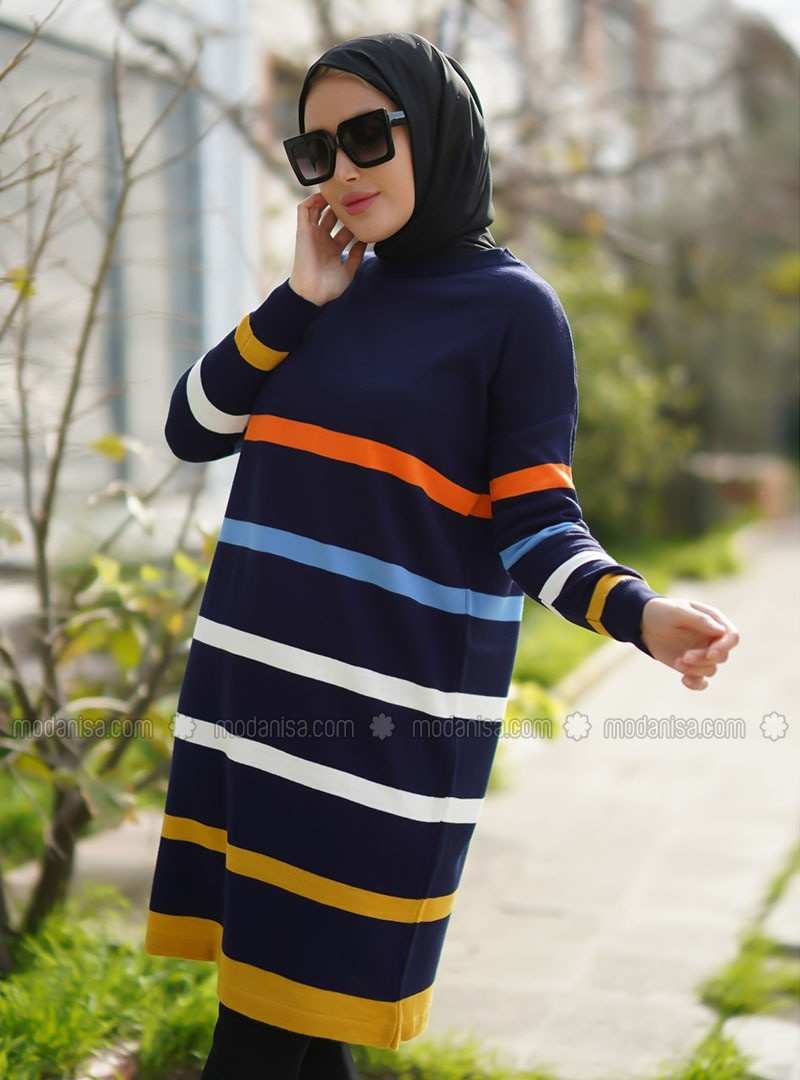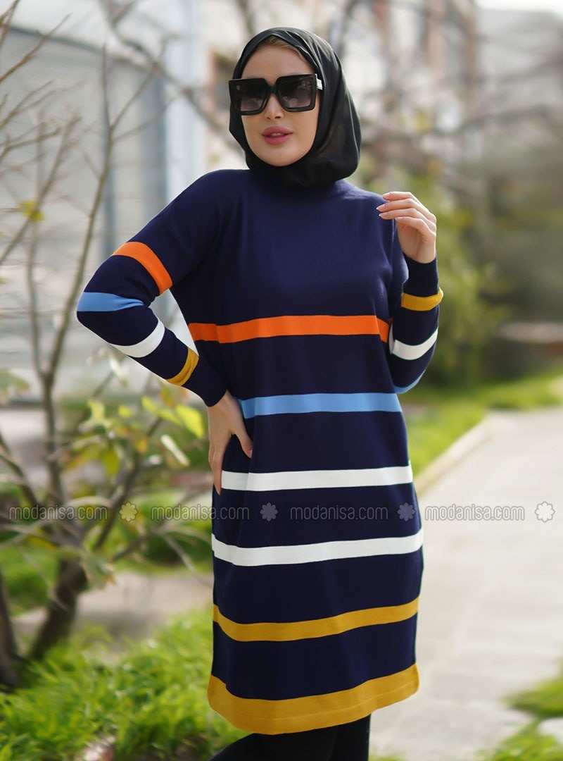تونيك أكريليك متعدد الخطوط بياقة دائرية