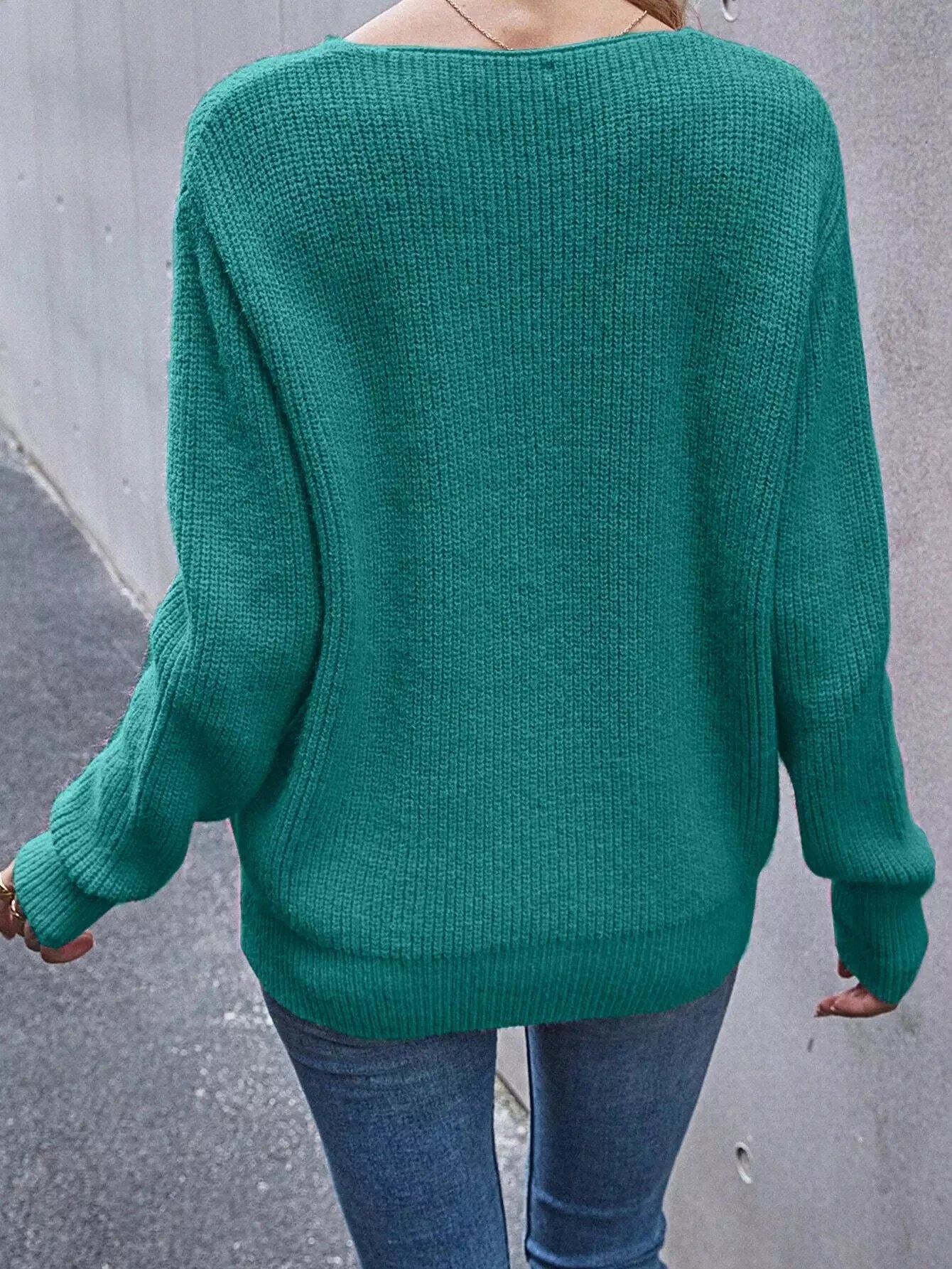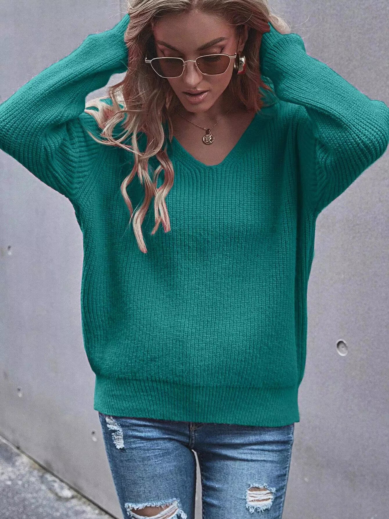 كنزة مضلعة محبوكة برقبة على شكل حرف V منسدلة الكتفين