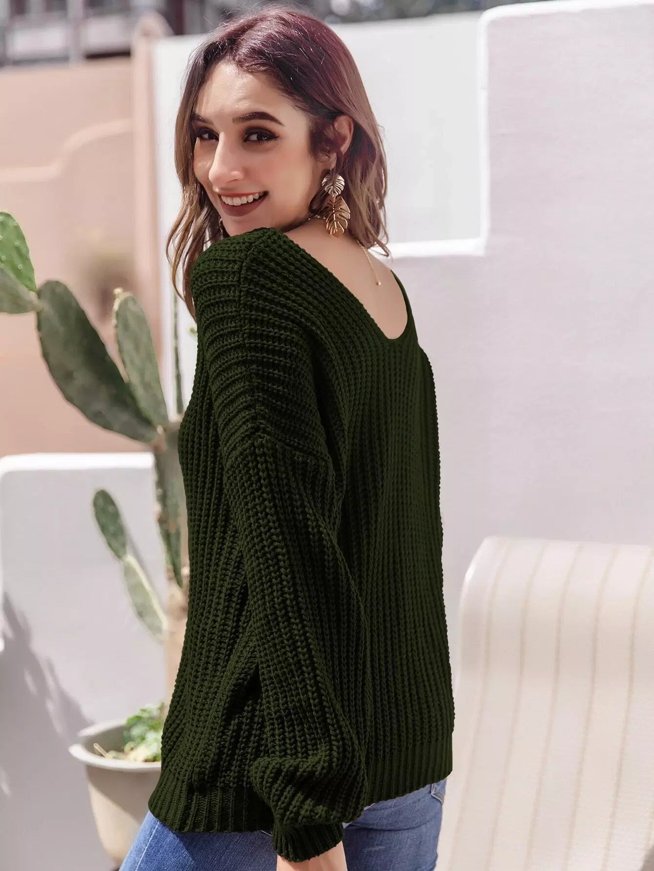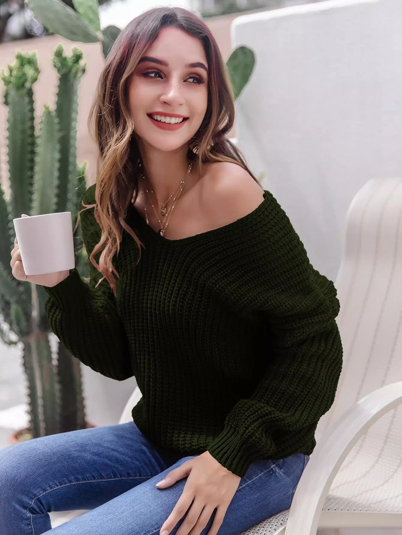 كنزة مضلعة بياقة على شكل حرف V منسدلة الكتف على شكل حرف V