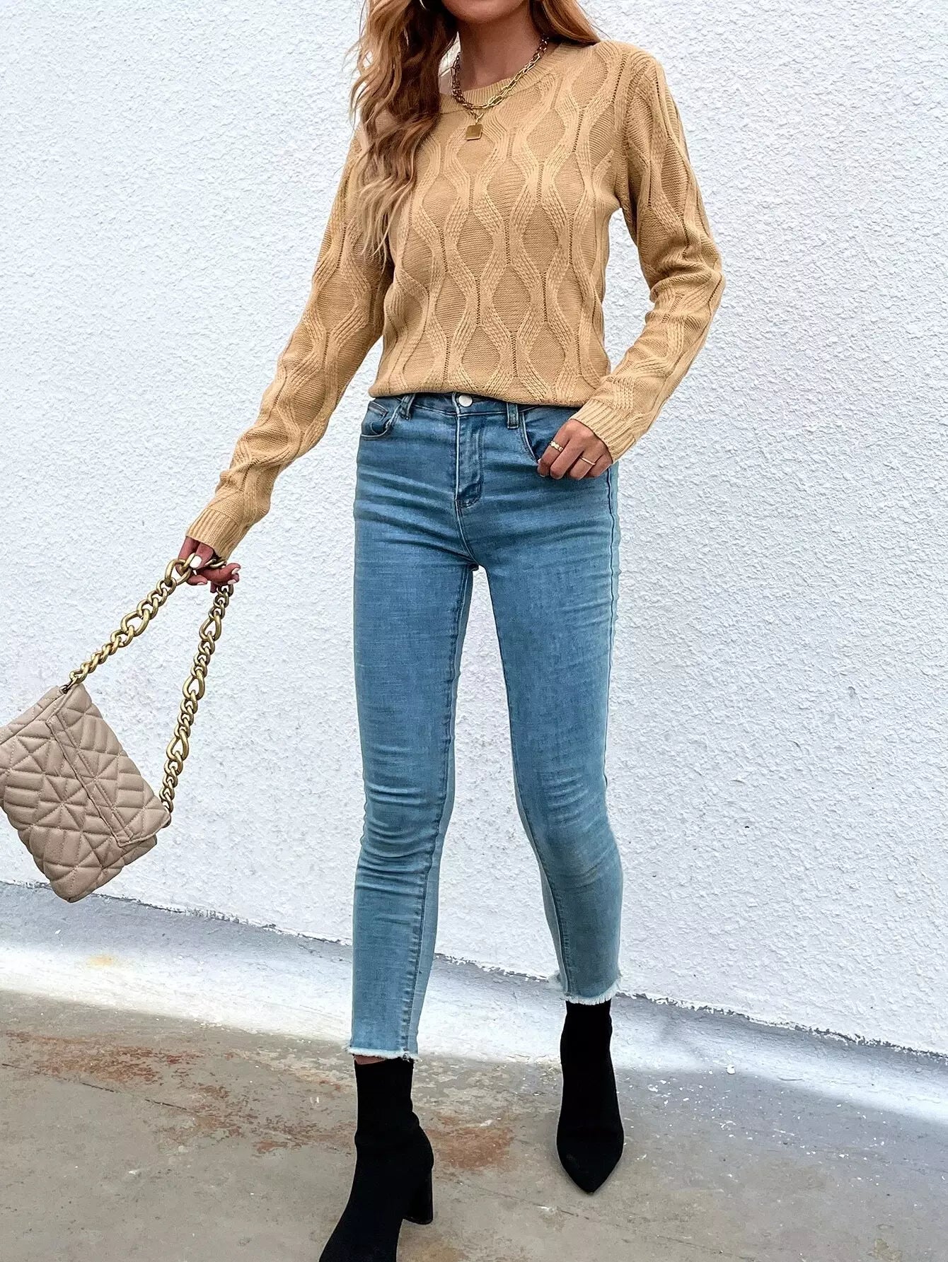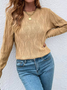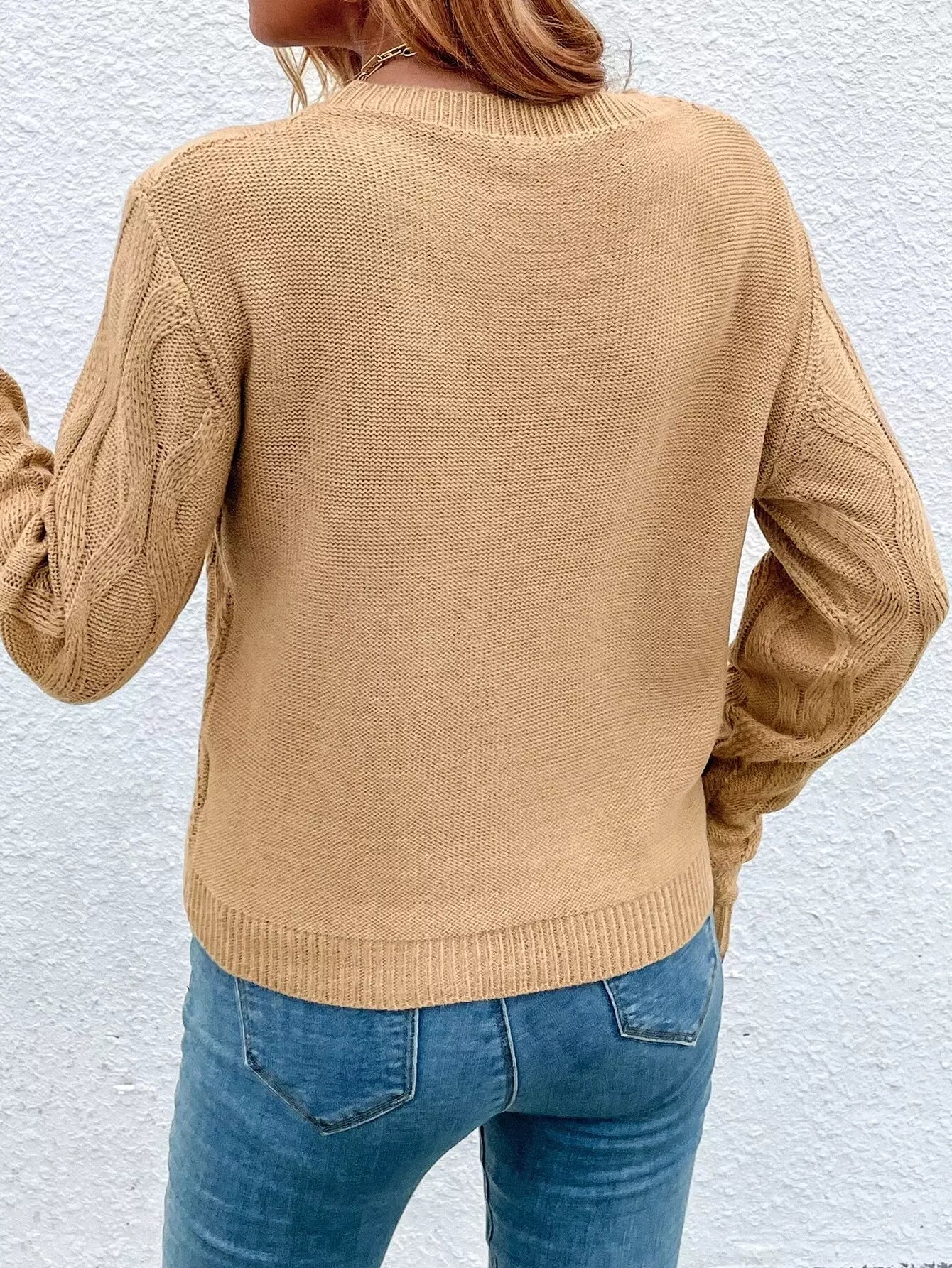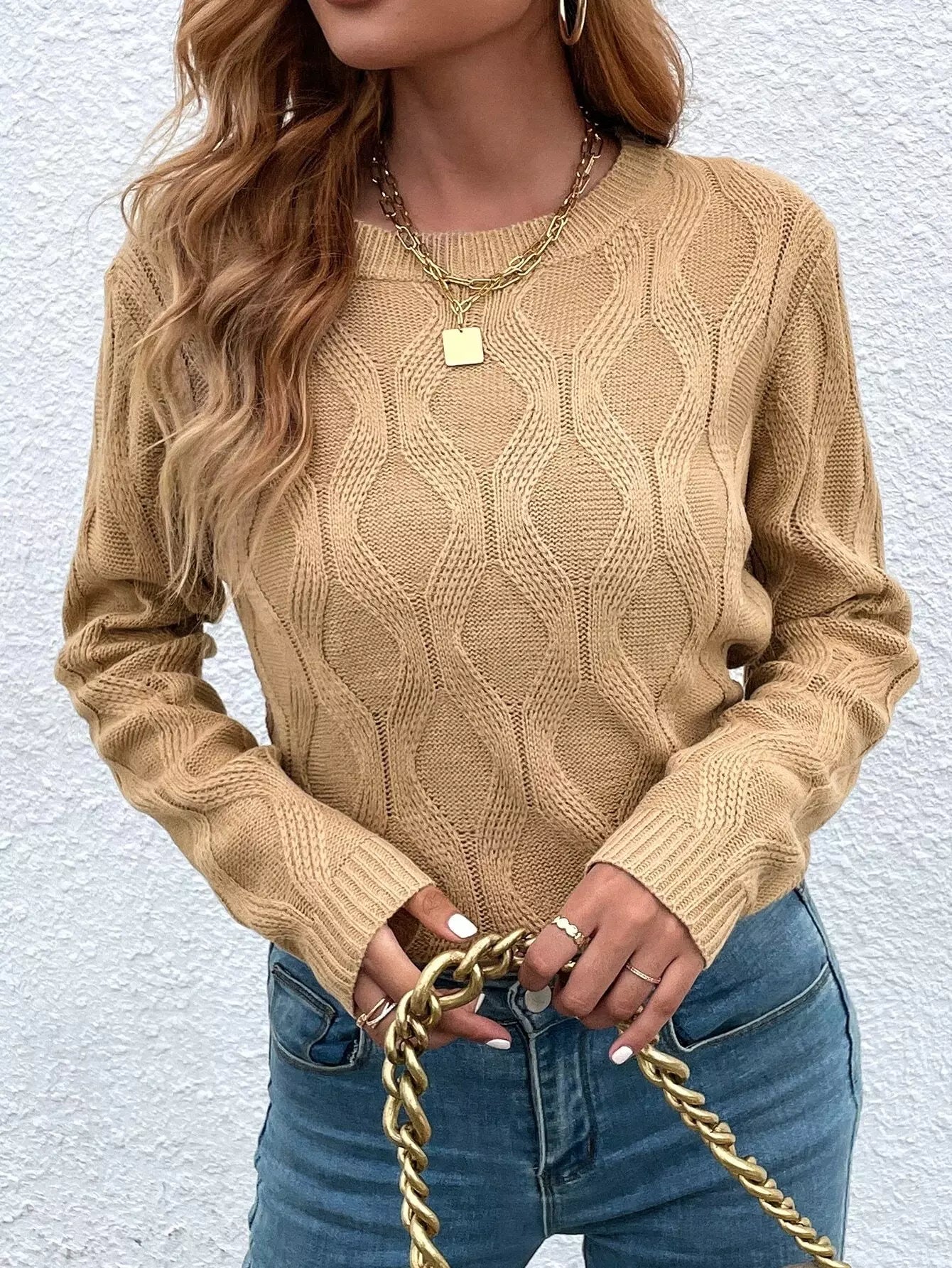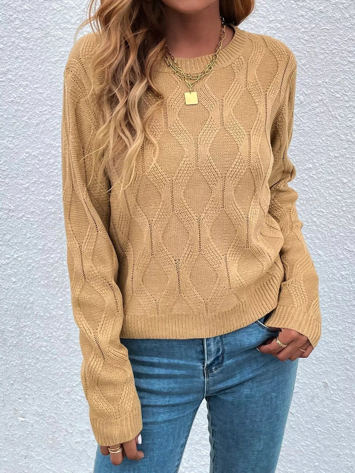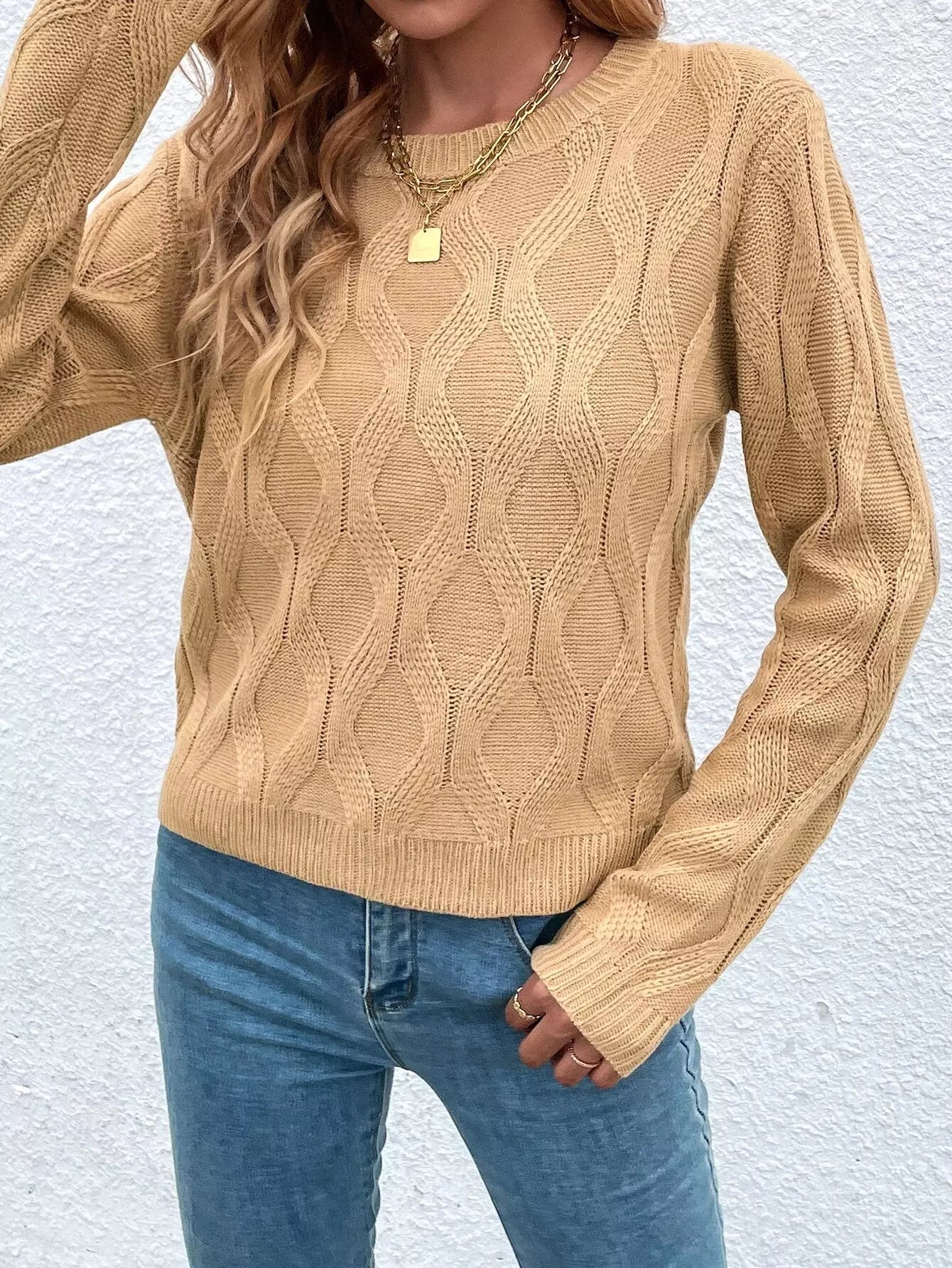كنزة برقبة دائرية كبلية محبوكة