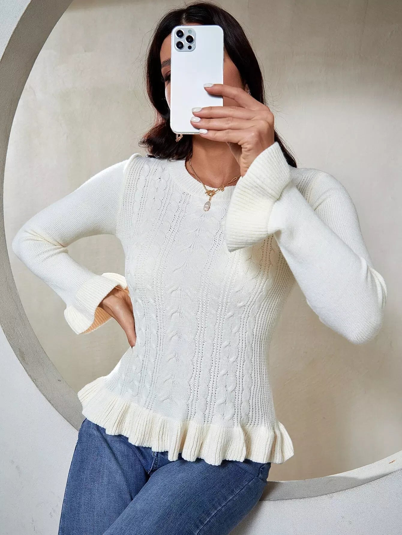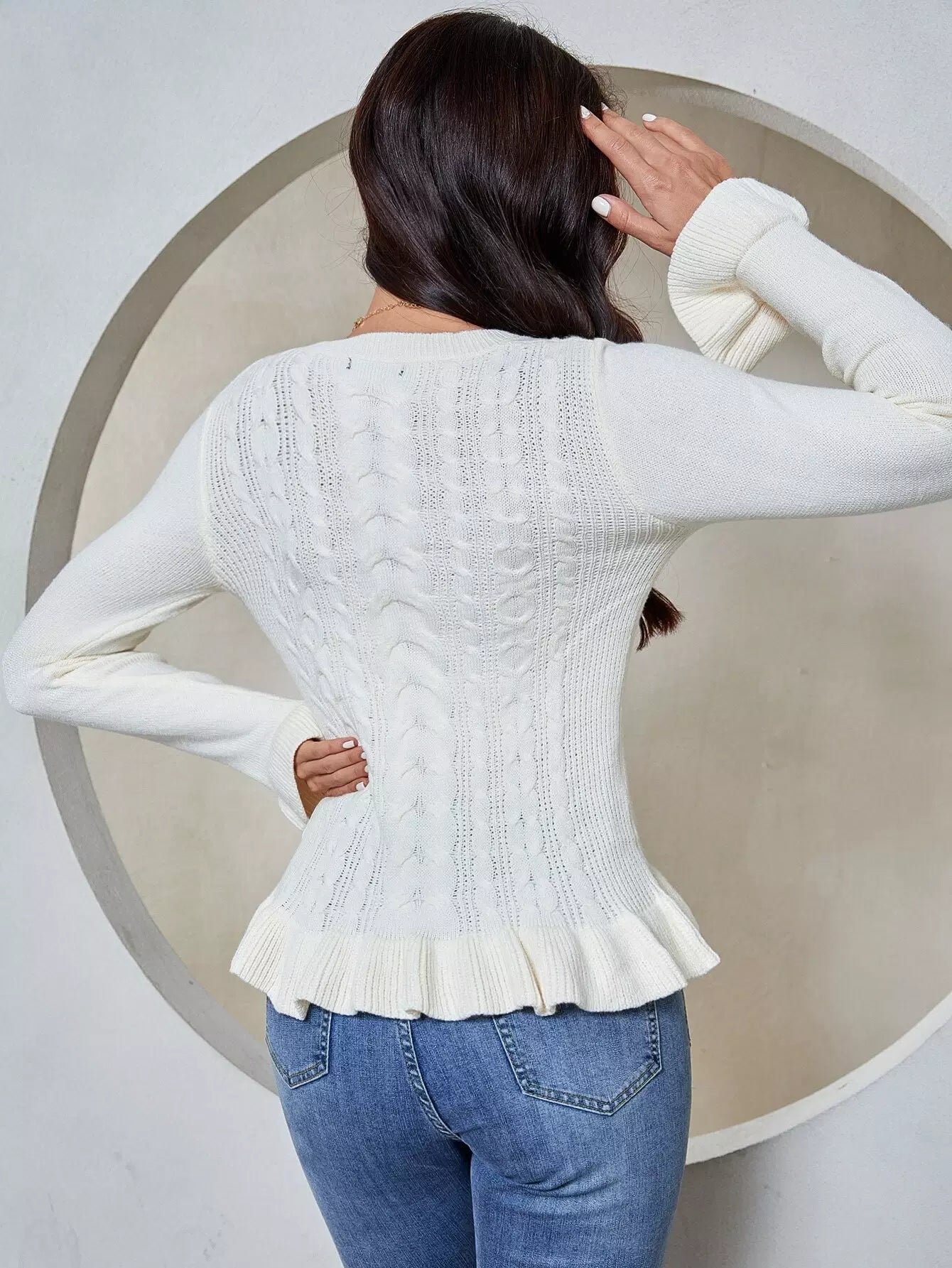 سترة سادة بحواف كشكش بحياكة كبلية متماسكة سادة
