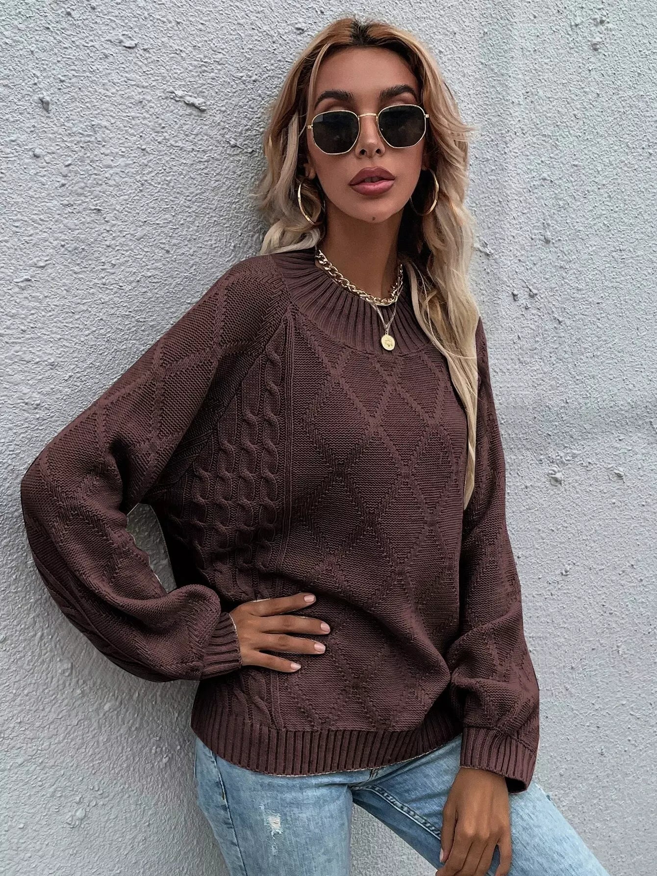 كنزة بأكمام راجلان سادة بأكمام كبلية محبوكة