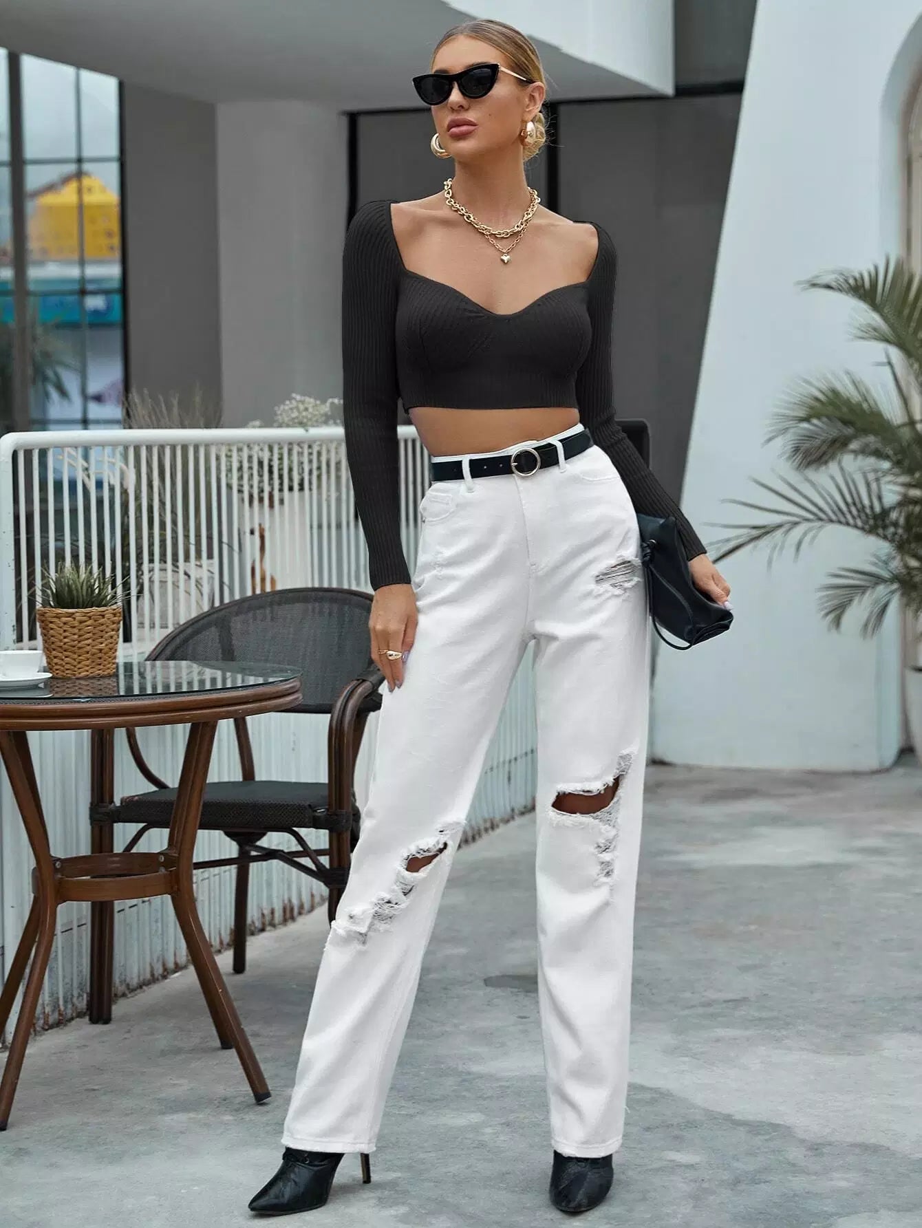 كنزة برقبة عنق مضلعة مضلعة محبوكة بقصّة قصيرة
