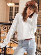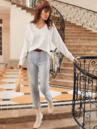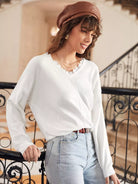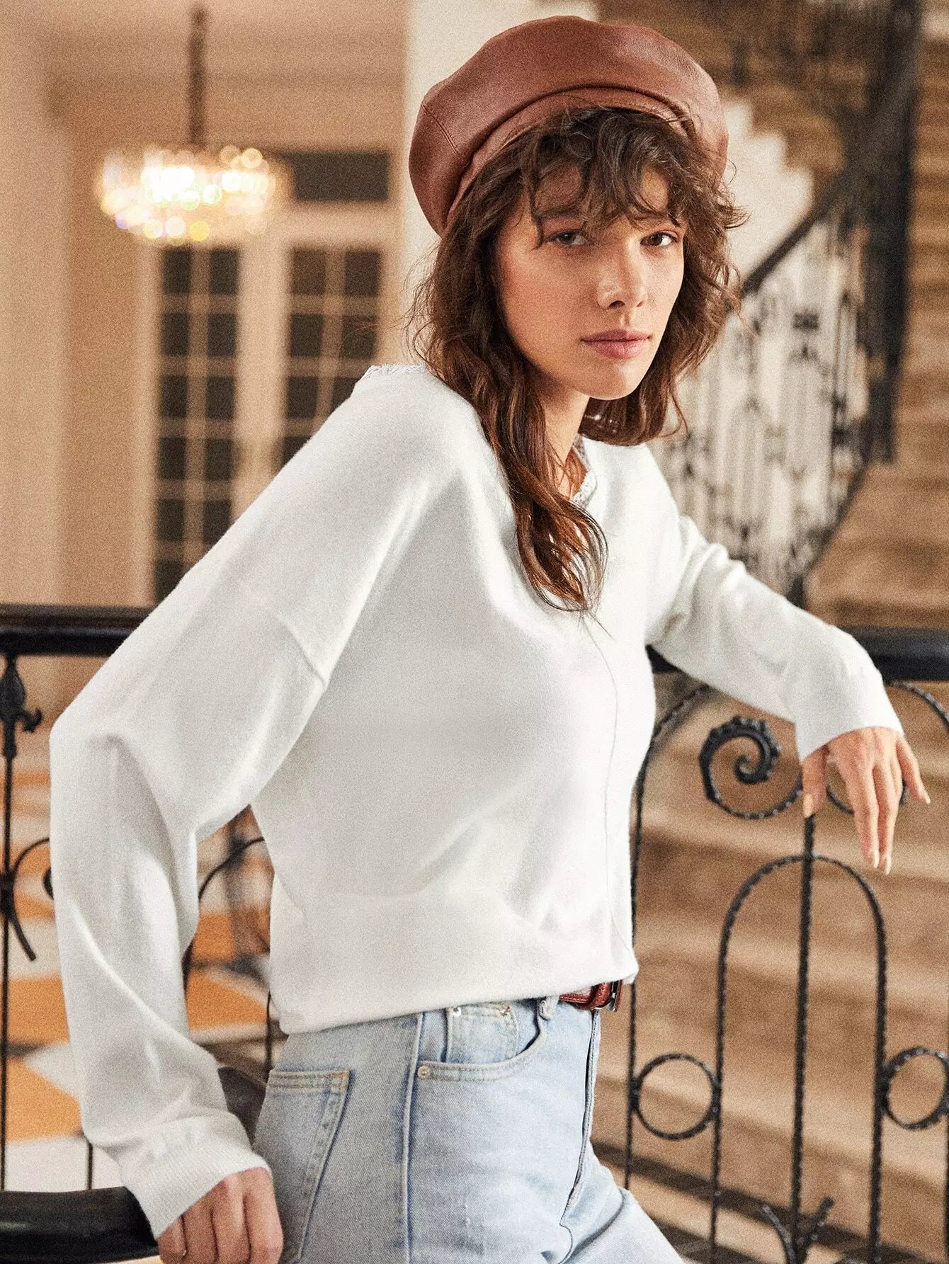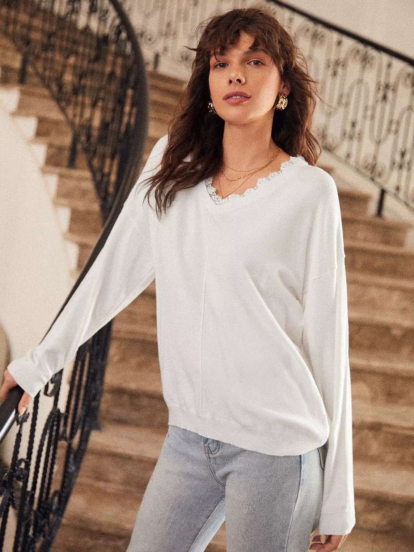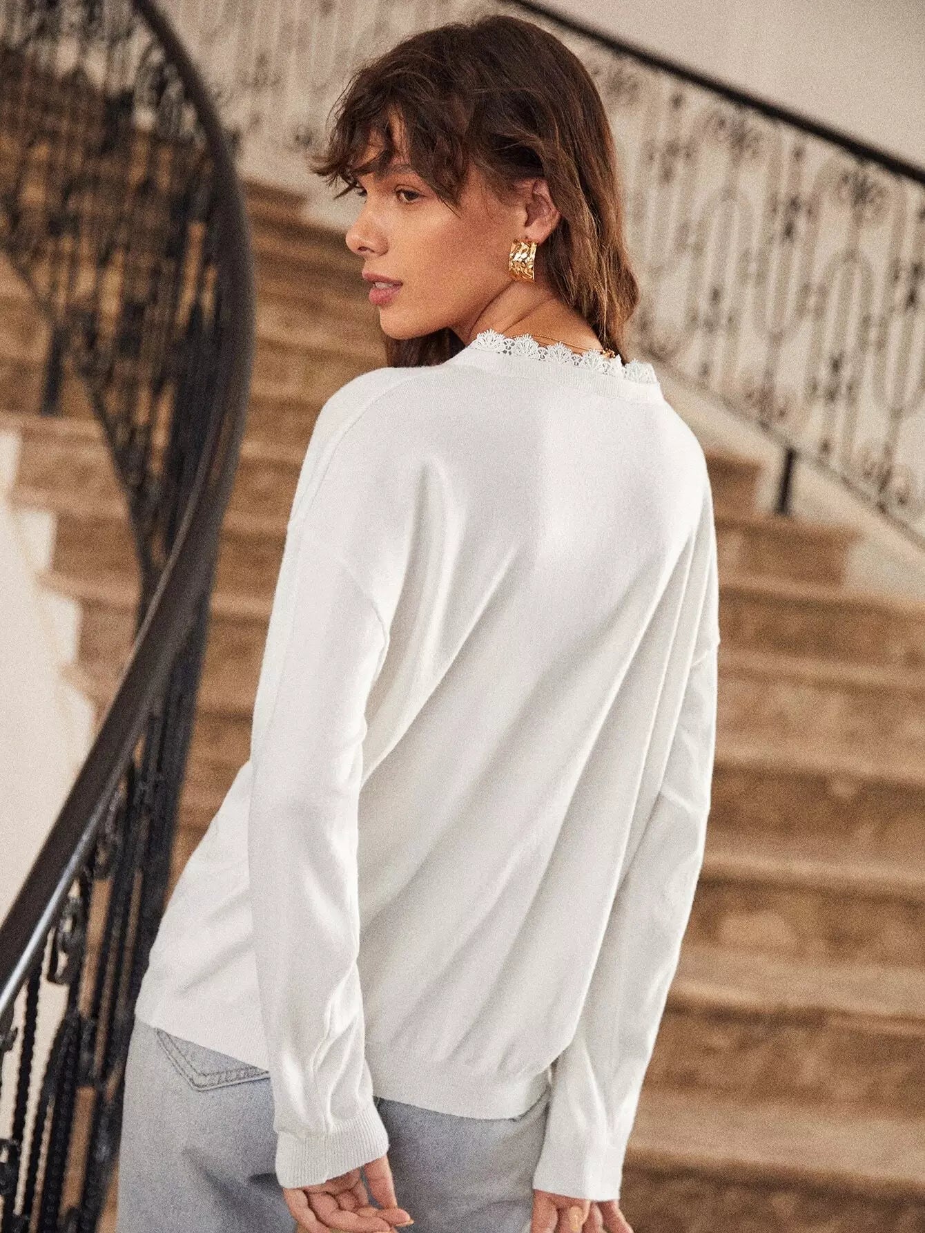 كنزة بياقة على شكل حرف V مزينة بأكتاف منسدلة من الدانتيل